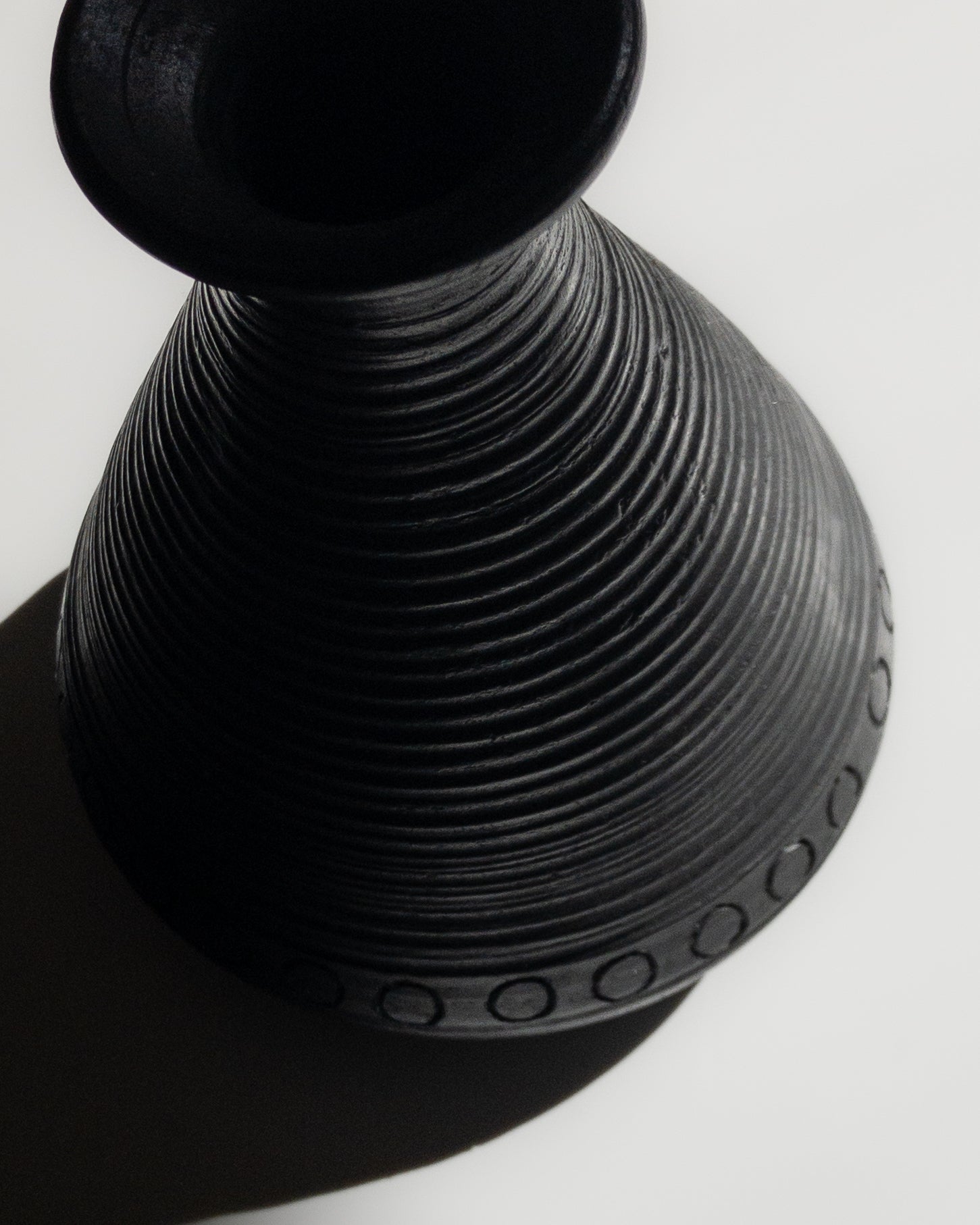 放射状に刻まれた繊細なラインと、裾部に連なる円環文様。装飾を抑えることで、黒の上品さがより際立っています。
