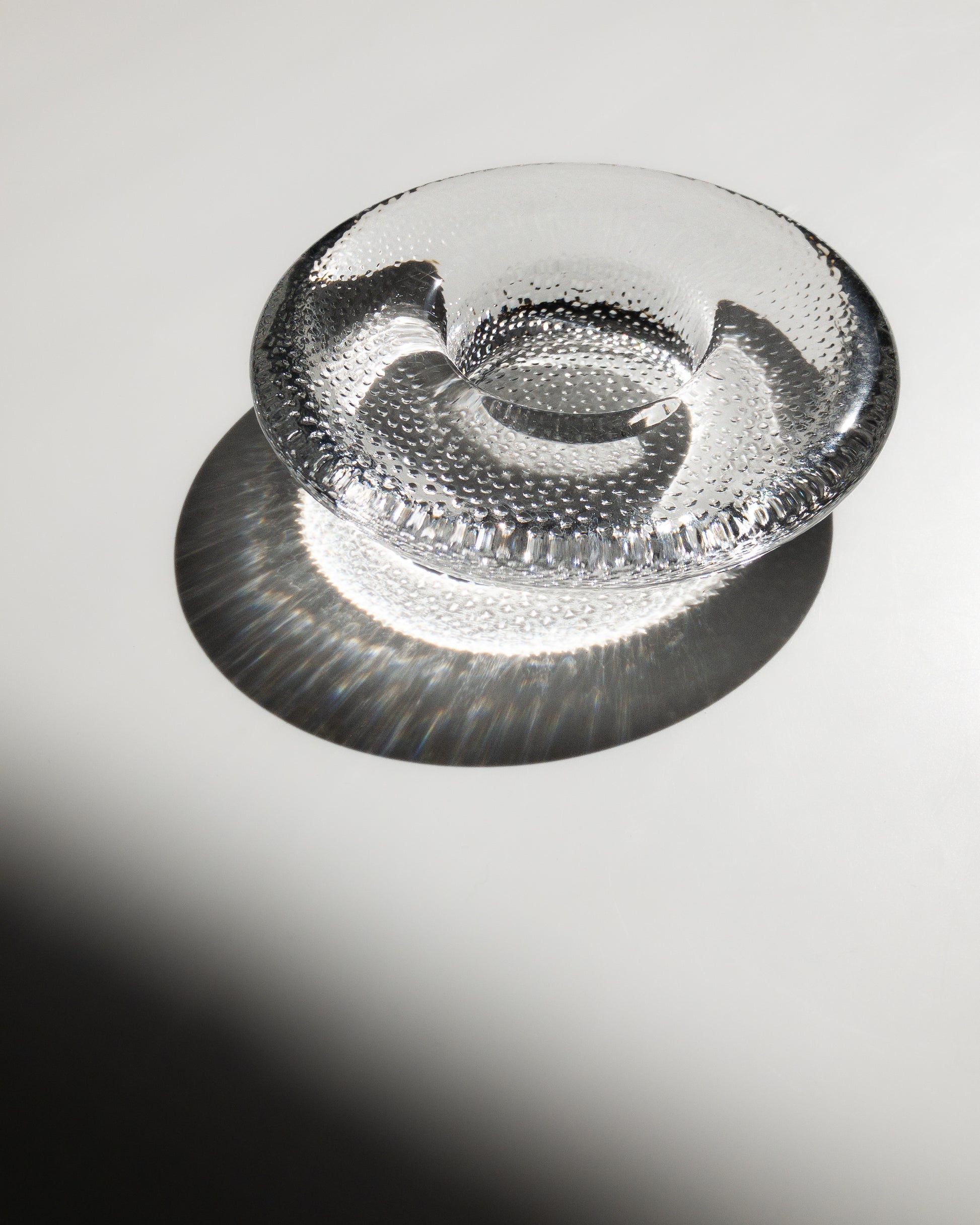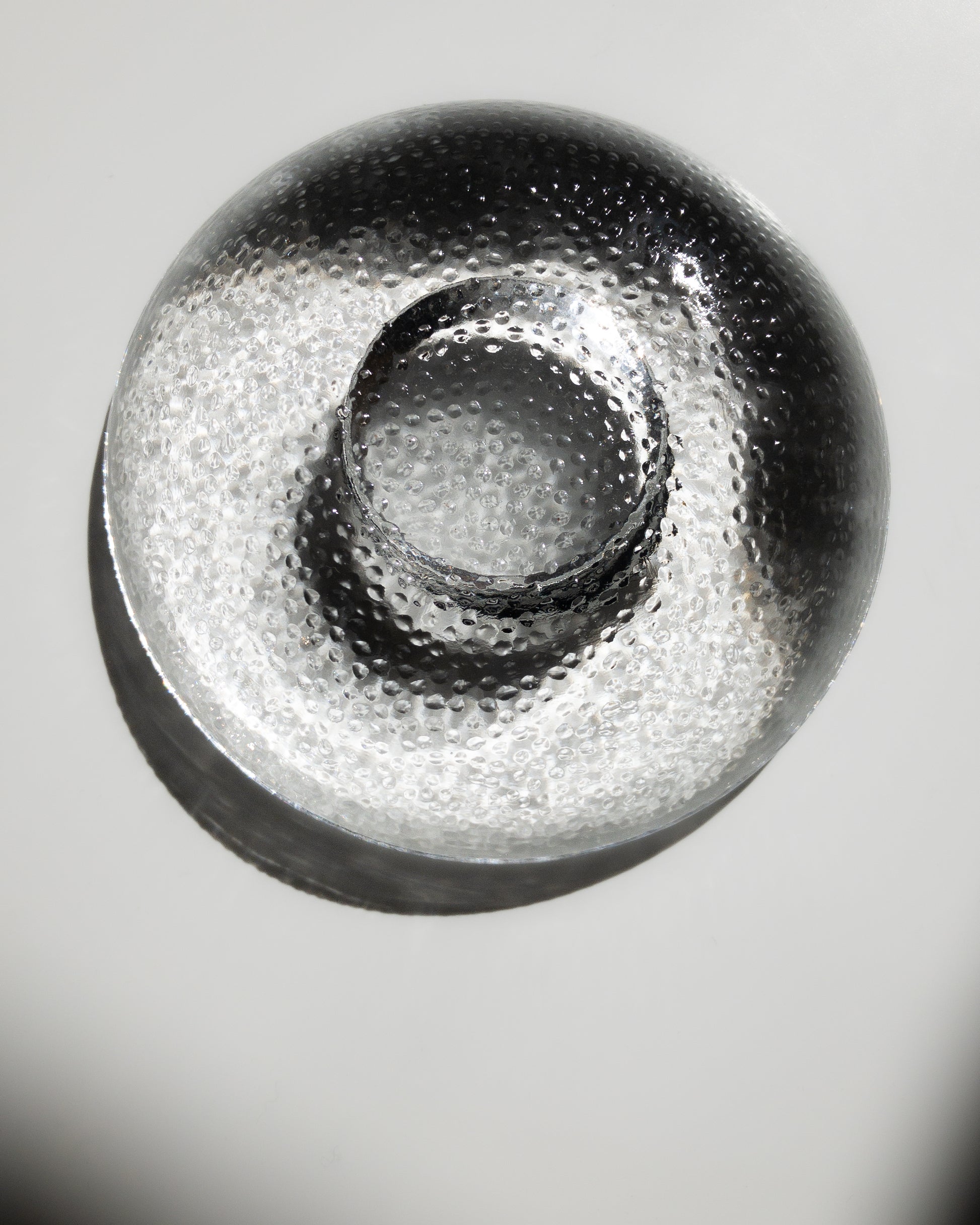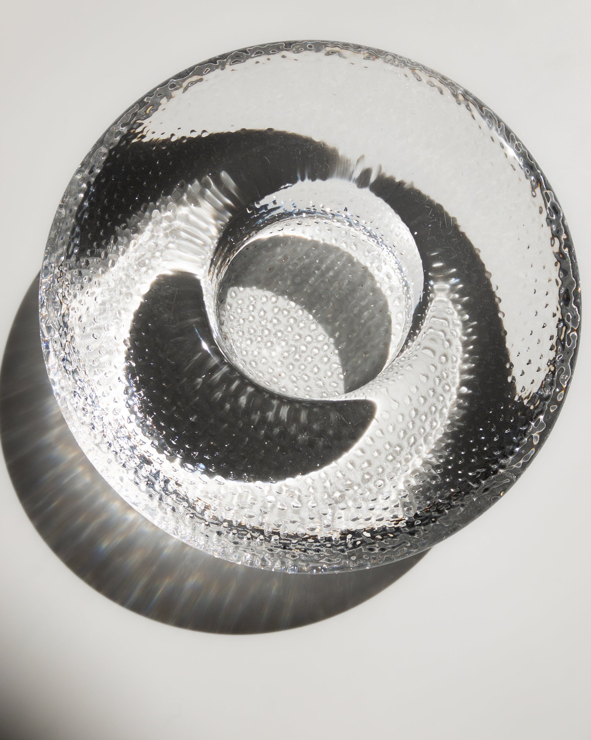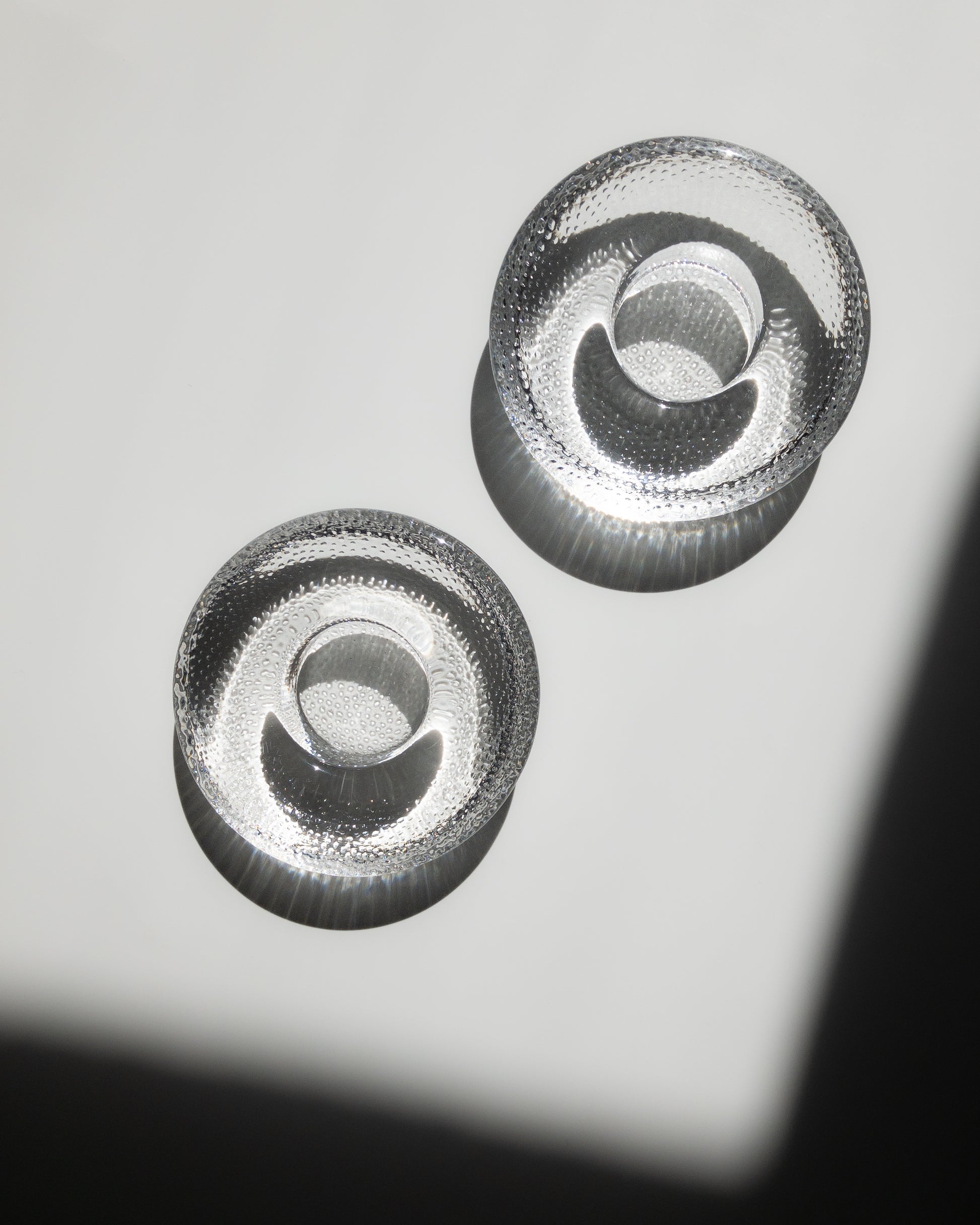 フィンランドのガラスメーカー iittala(イッタラ) の「Nappi(ナッピ)」キャンドルホルダー。シリーズ名の「Nappi」はフィンランド語で「ボタン」を意味し、衣服のボタンを大きくしたイメージなんだとか。上部はツルッとしていますが、底部には小さい気泡のようなドットが施されています。光を透過させたときにそのドットがきらめきを生み、印象的な陰影を楽しめるようになっています。