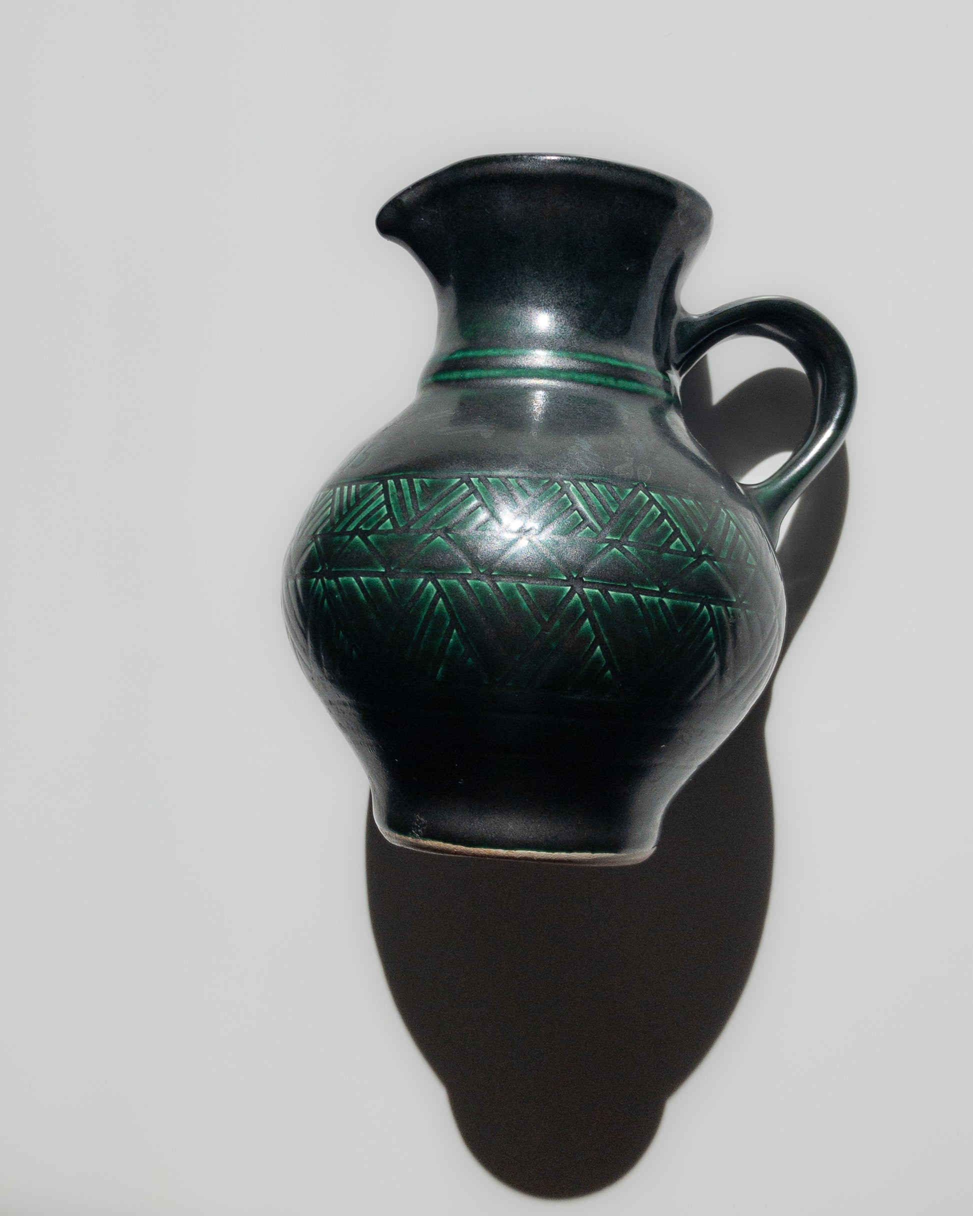 黒を基調とした艶やかな釉薬の上に、深緑色で幾何学模様が描かれています。丸みを帯びたフォルムに持ち手が付いたクラシカルな形状で、バルト地方の陶芸に見られる素朴さが感じられますが、艶のある色合いのおかげで洗練された印象も与えてくれる、なんとも面白い味わいに仕上がっています。