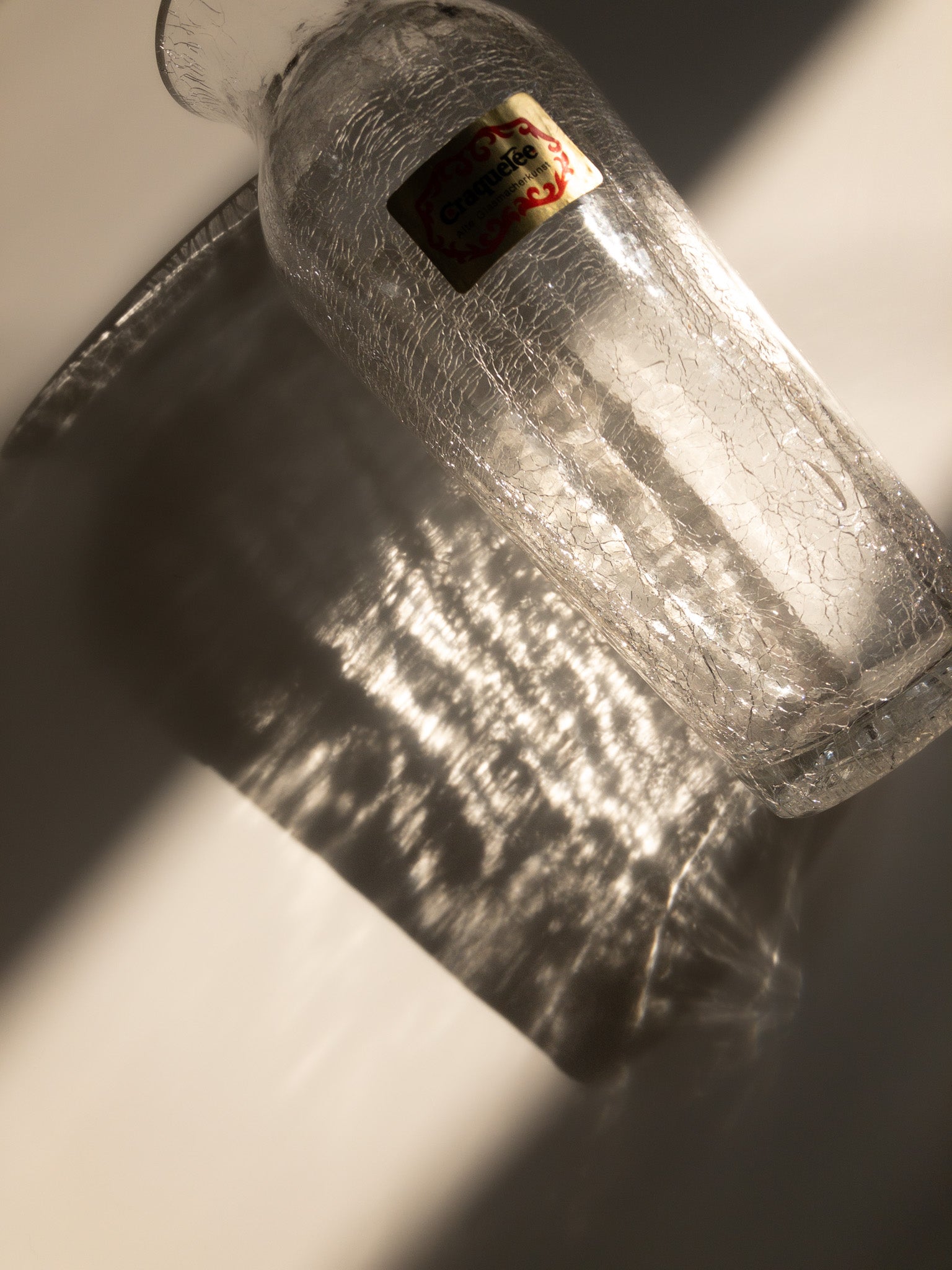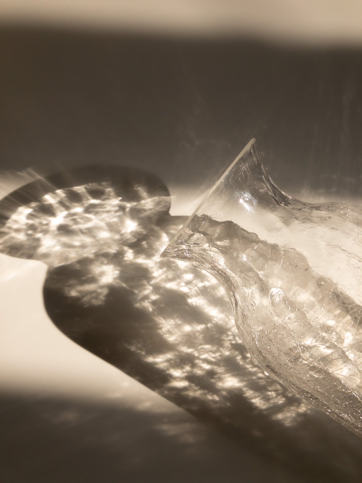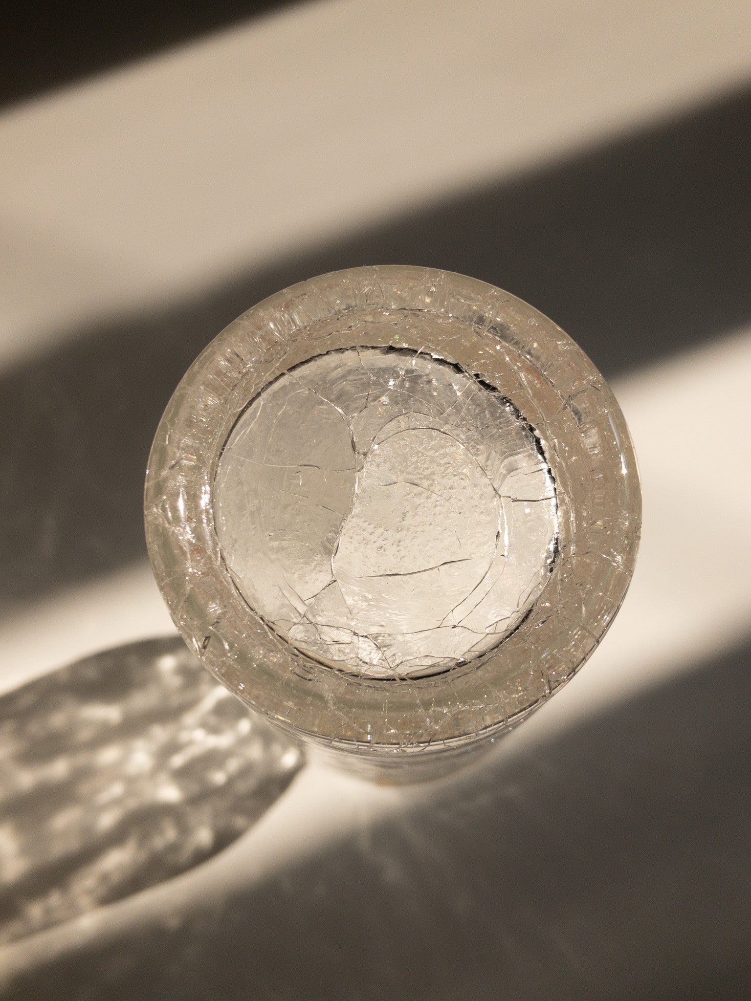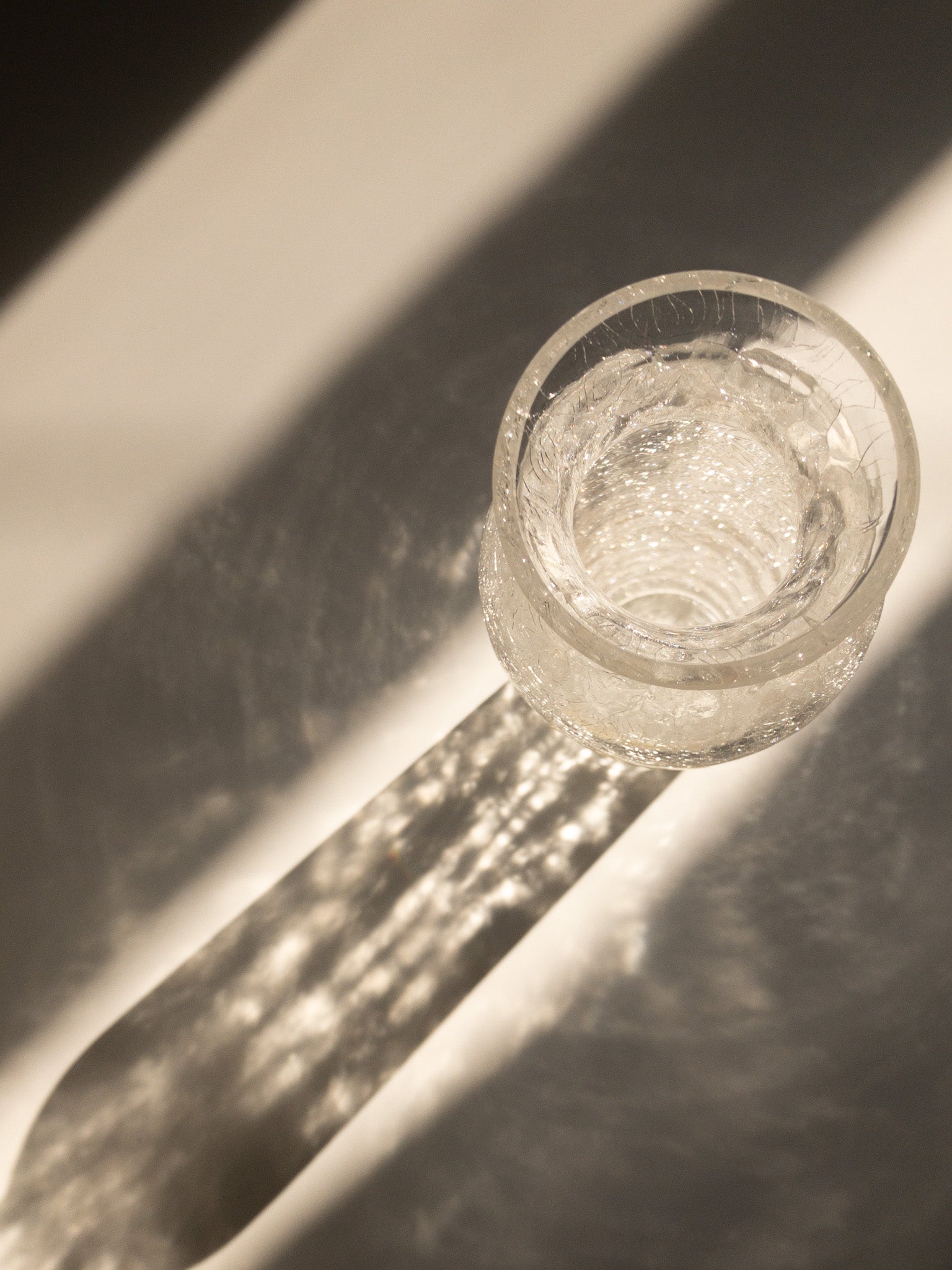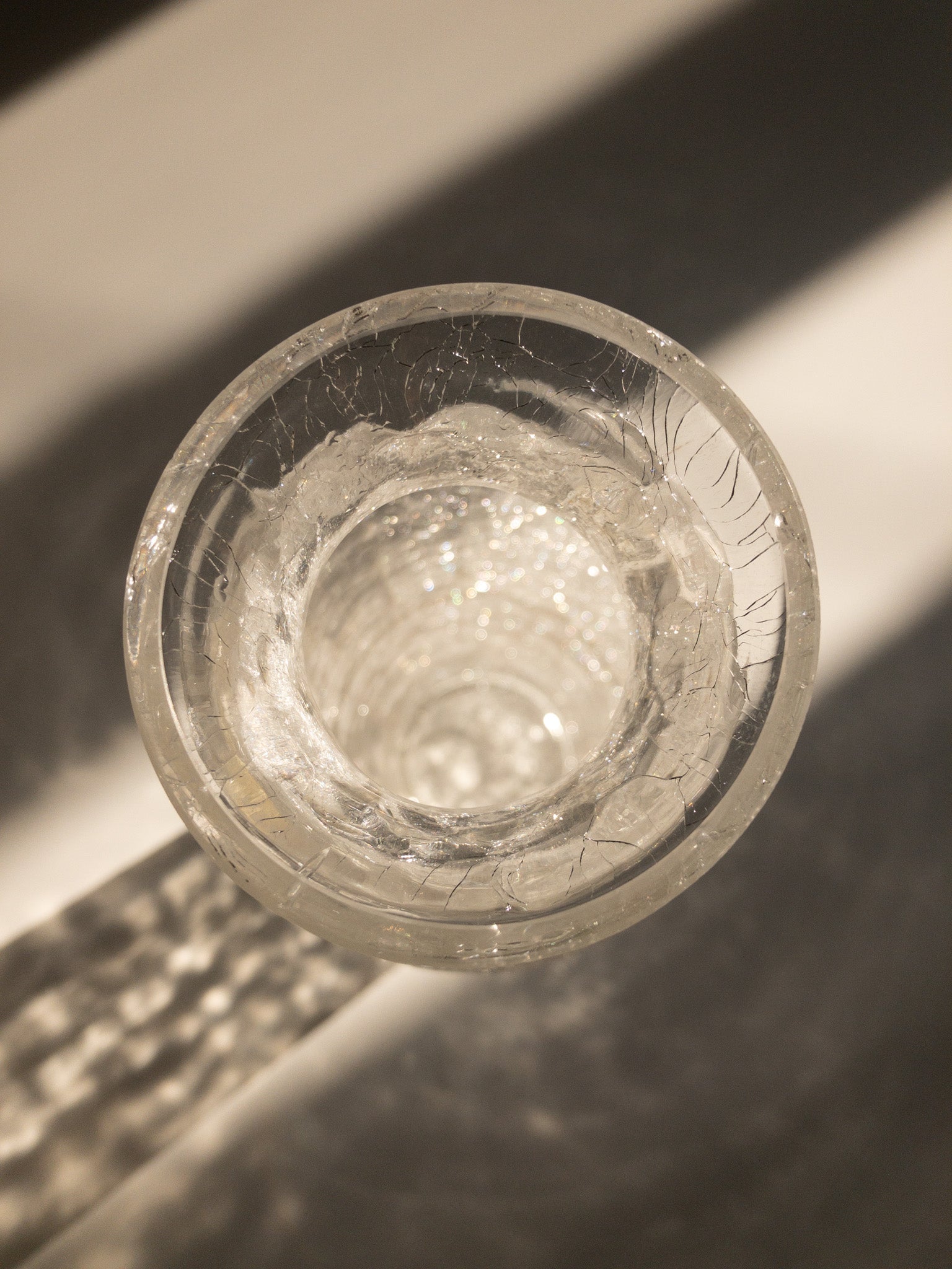 クラックガラスというのは、溶けたガラスを急冷することで細かいひび模様を作り、さらに短時間の再加熱によって強度を回復させる技法のことで、氷のような独特の質感が特徴です。