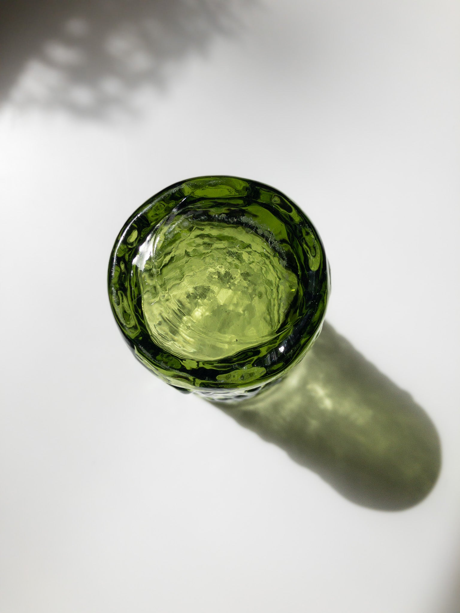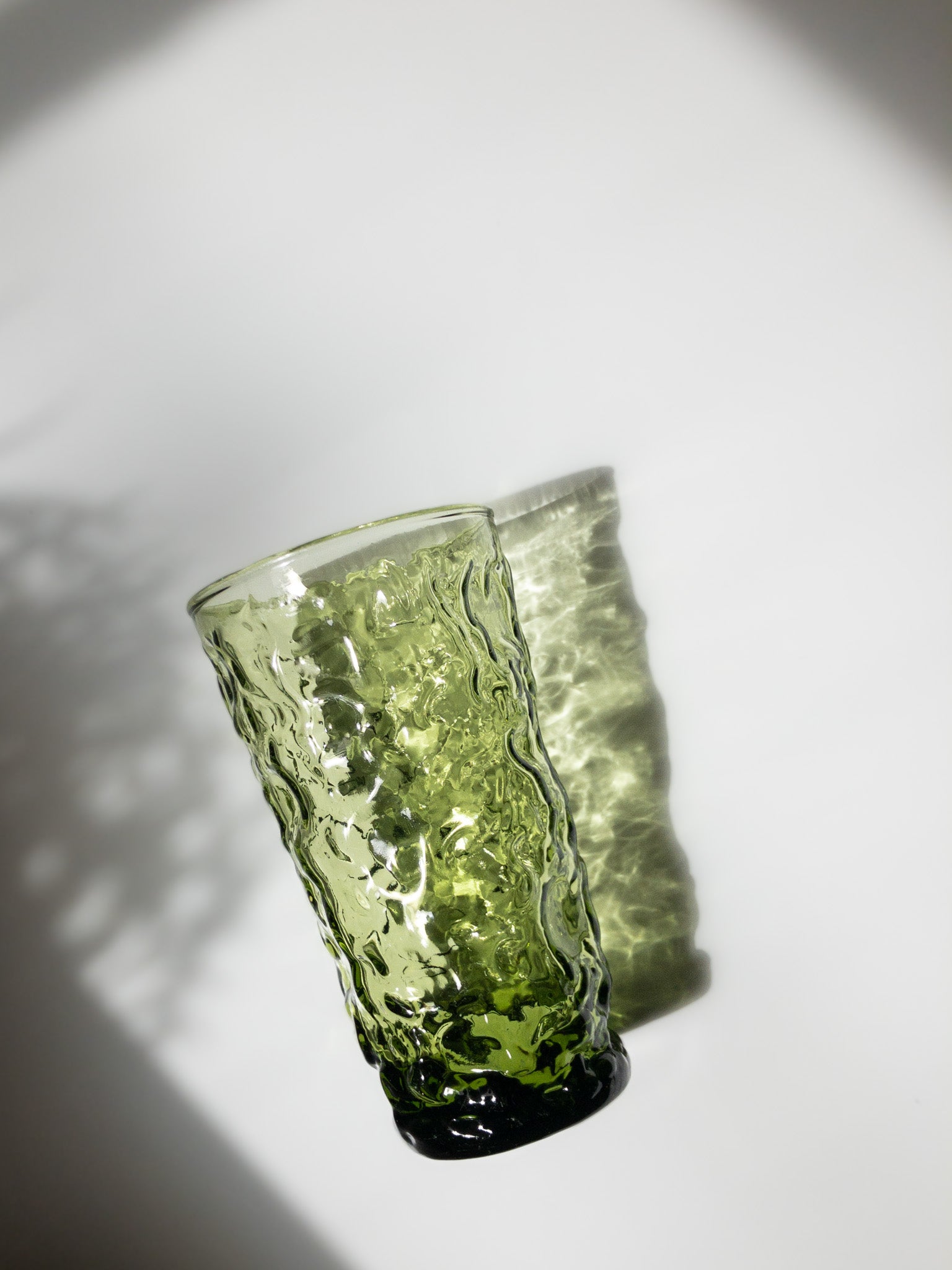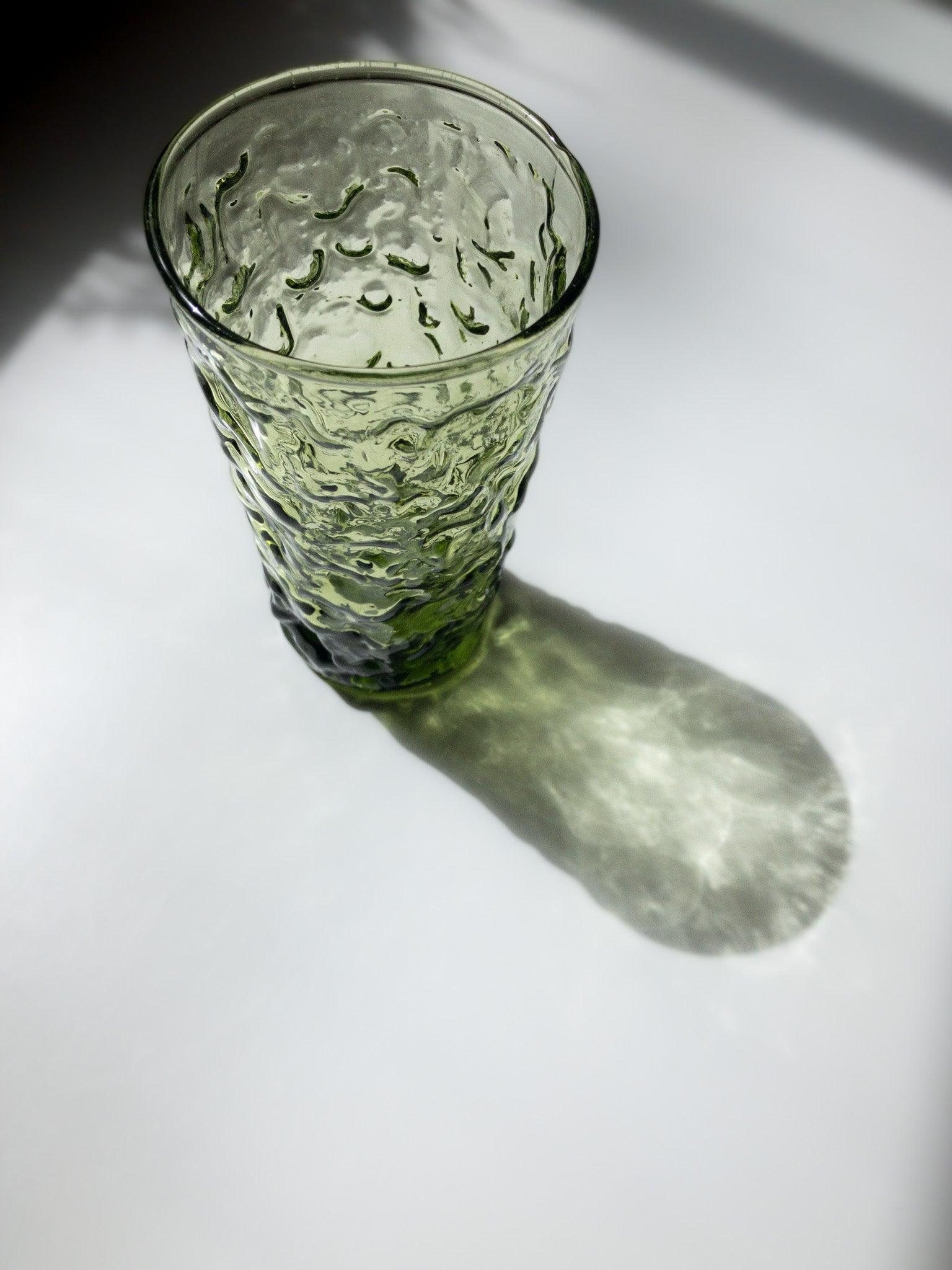 1960年代に製造された製品で、表面全体に独特の凸凹加工が施されています。そういうデザインなんだと思いますが、これのおかげで手滑りもしにくい。Milano「ミラノ」もしくは「Lido」とも呼ばれるシリーズで、色は他にハニーゴールドも生産されていたようですが、こちらは深みのある緑色(アボカドグリーン)。