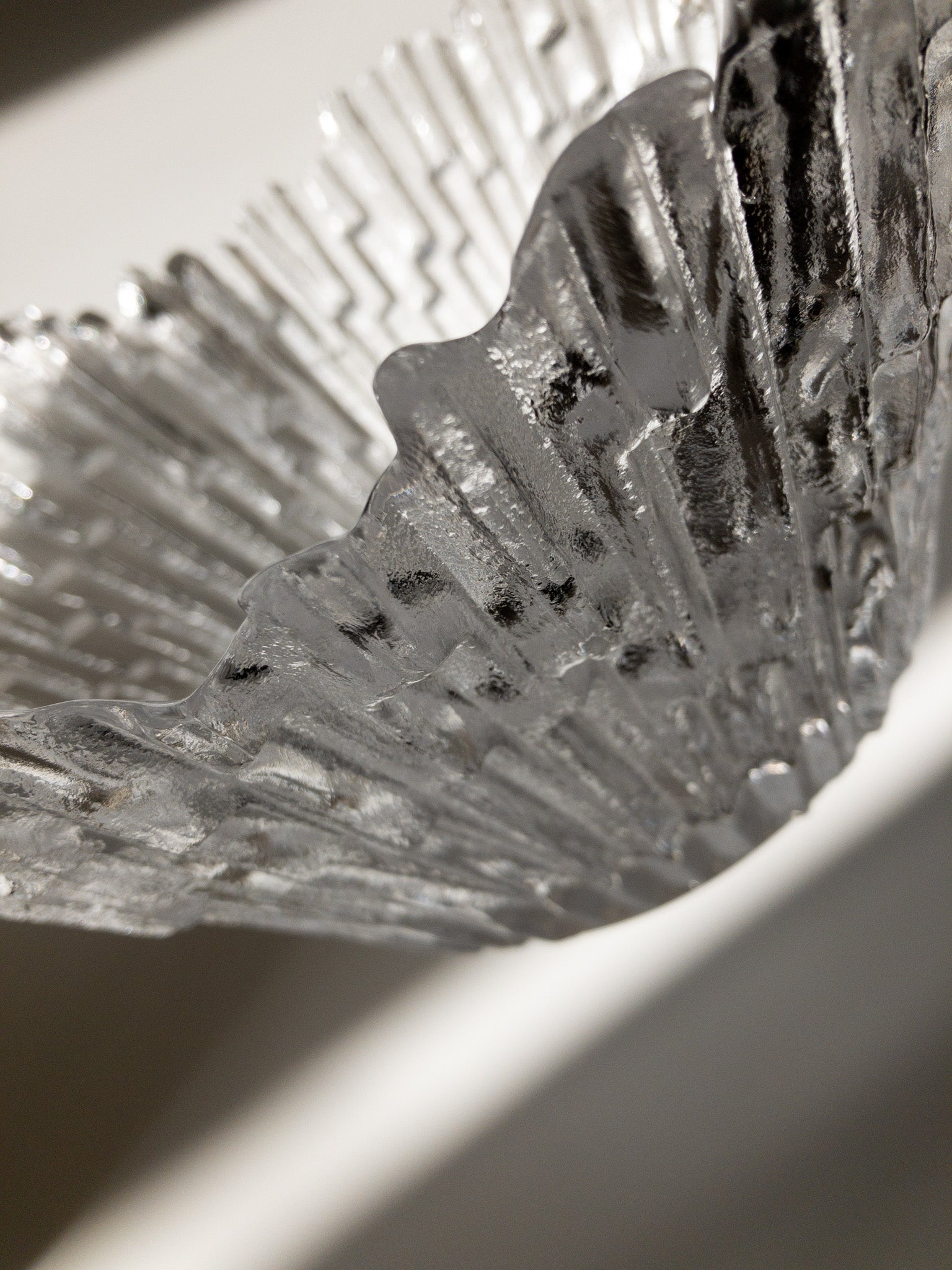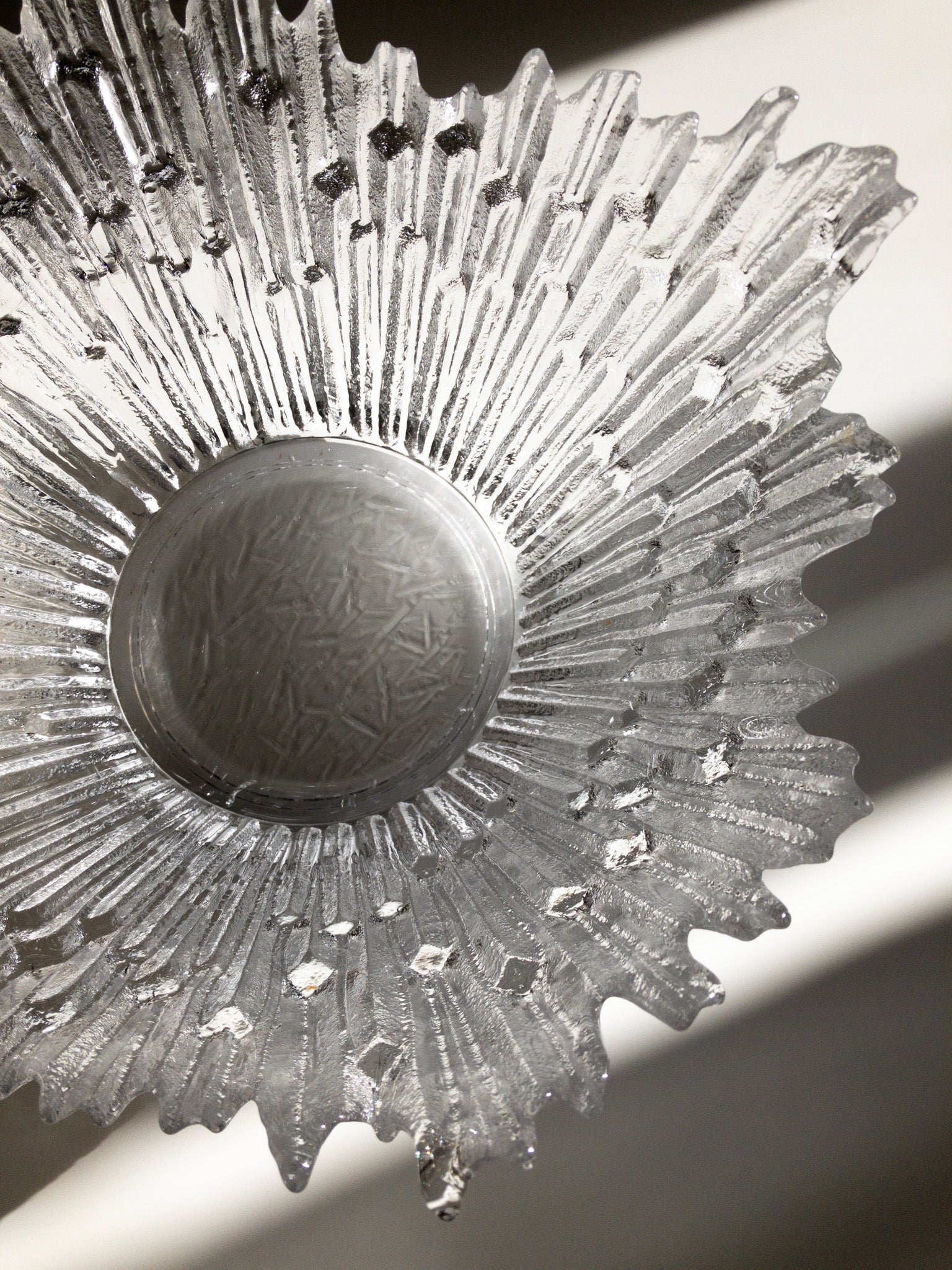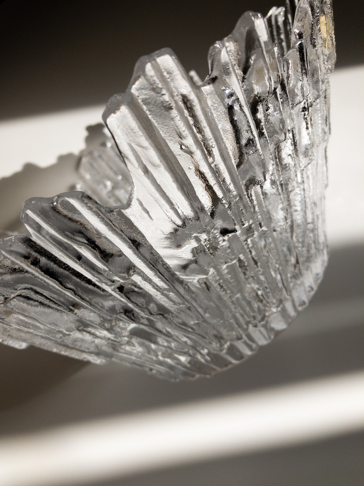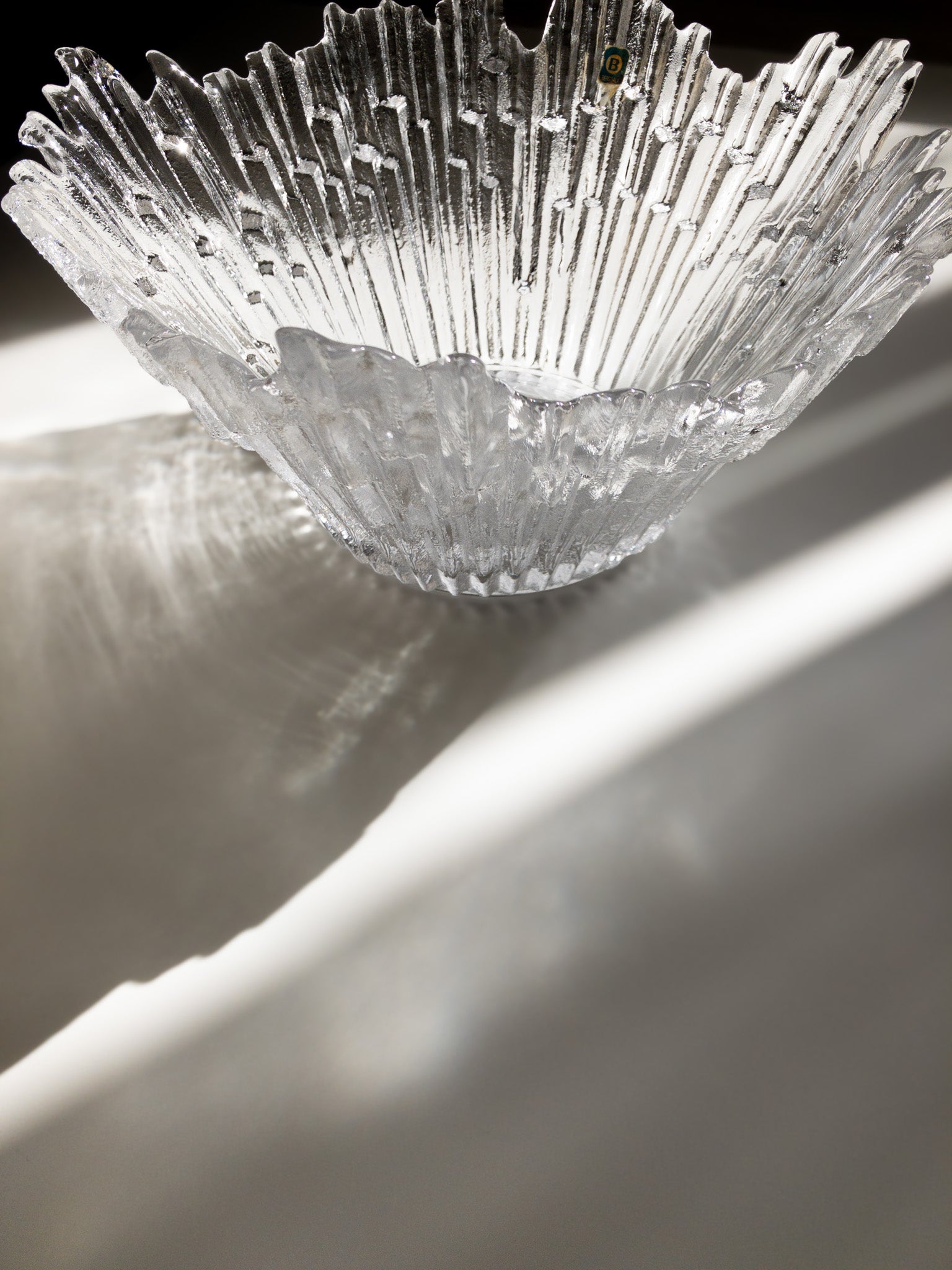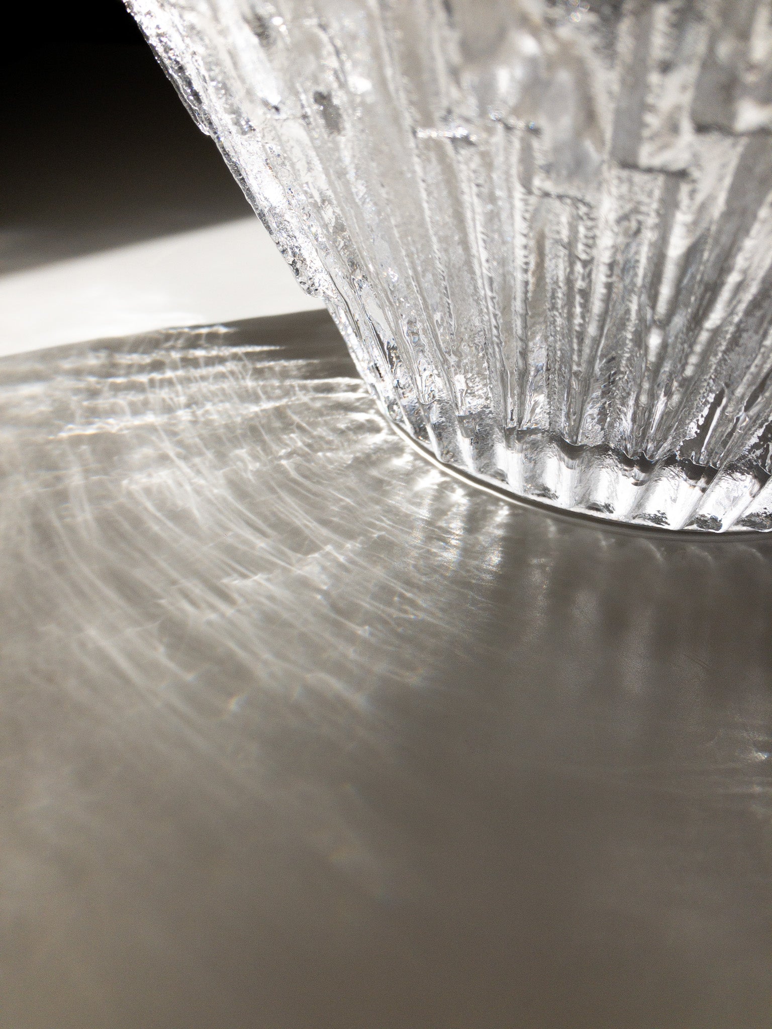 オーロラの輝きをイメージしたこのガラスボウルは、氷柱のような質感が特徴的。遠心鋳型(えんしんちゅうぞう)を使用して成形され、外側はざらつきと凹凸のある仕上げですが、内側は滑らかで高い光沢を持つコントラストが印象的。底面にはリードマット(葦の敷物)や泳ぐ魚の群れを思わせる繊細な模様が施されています(しかも手作業で!)