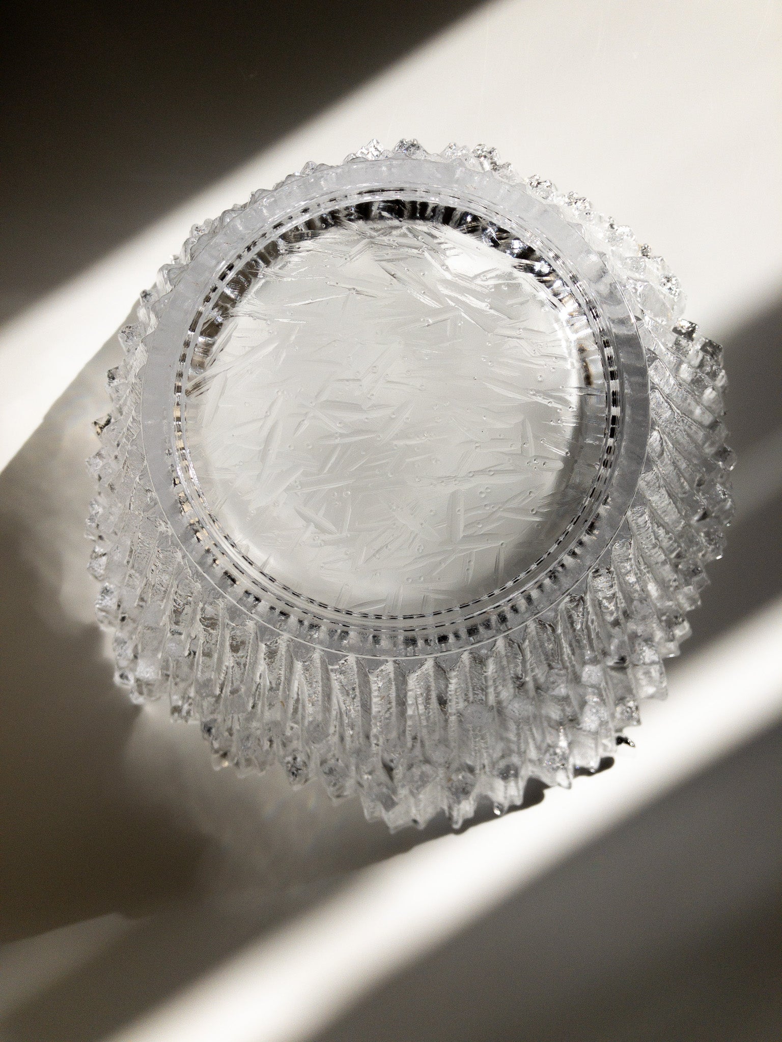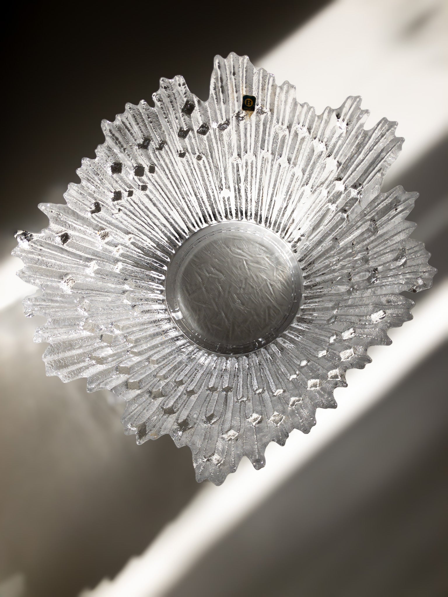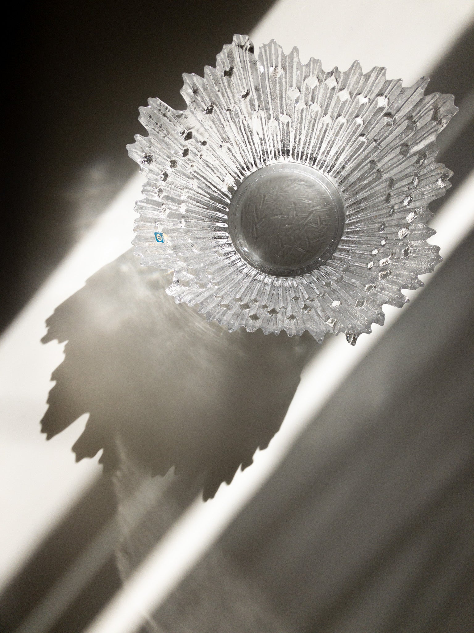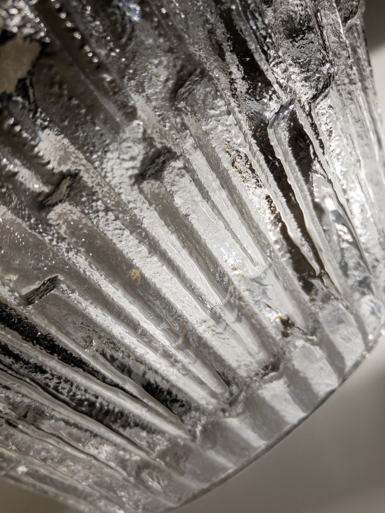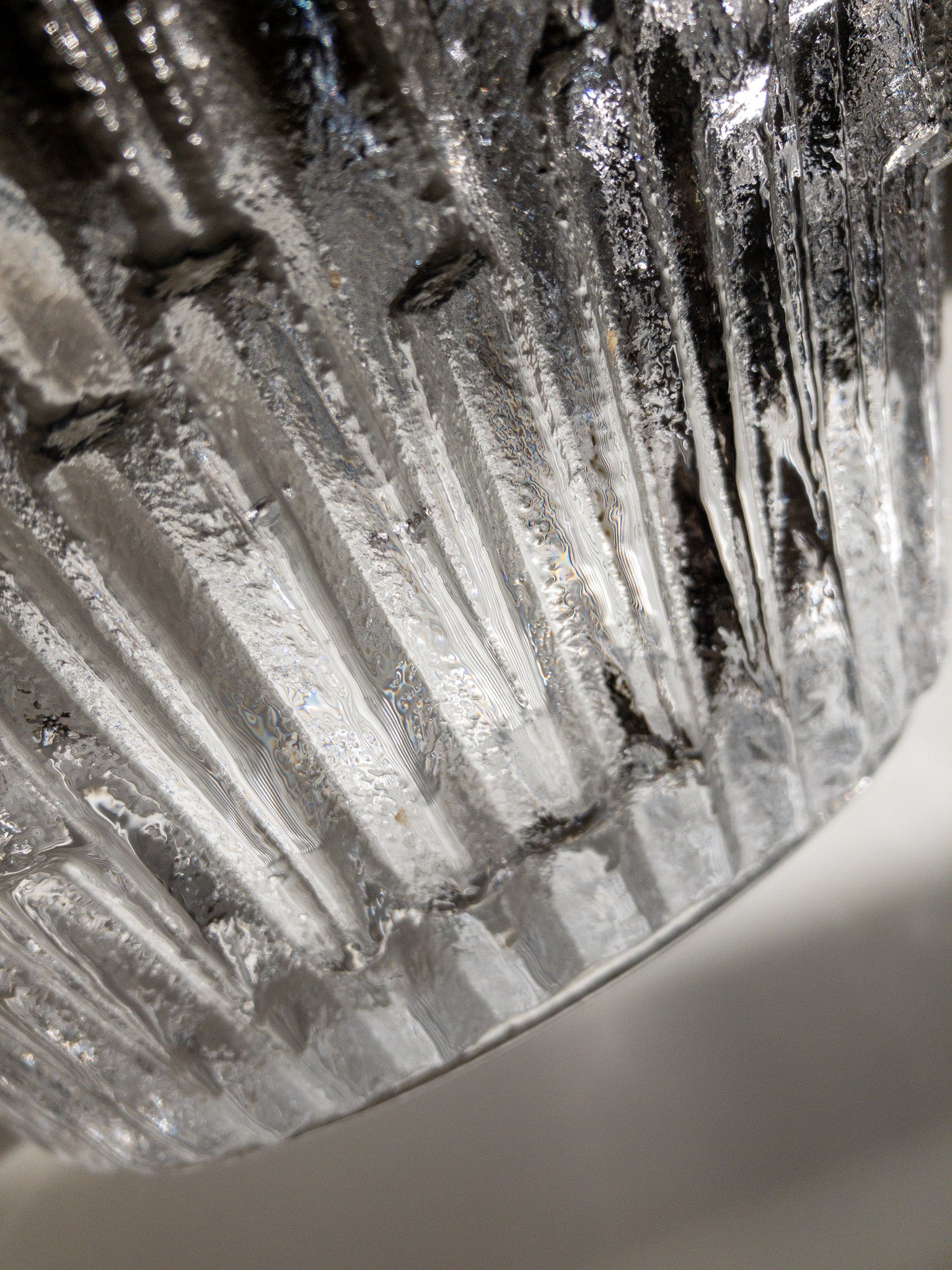 オーロラの輝きをイメージしたこのガラスボウルは、氷柱のような質感が特徴的。遠心鋳型(えんしんちゅうぞう)を使用して成形され、外側はざらつきと凹凸のある仕上げですが、内側は滑らかで高い光沢を持つコントラストが印象的。底面にはリードマット(葦の敷物)や泳ぐ魚の群れを思わせる繊細な模様が施されています(しかも手作業で!)