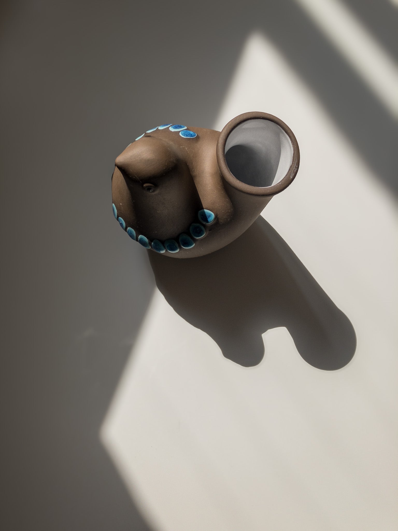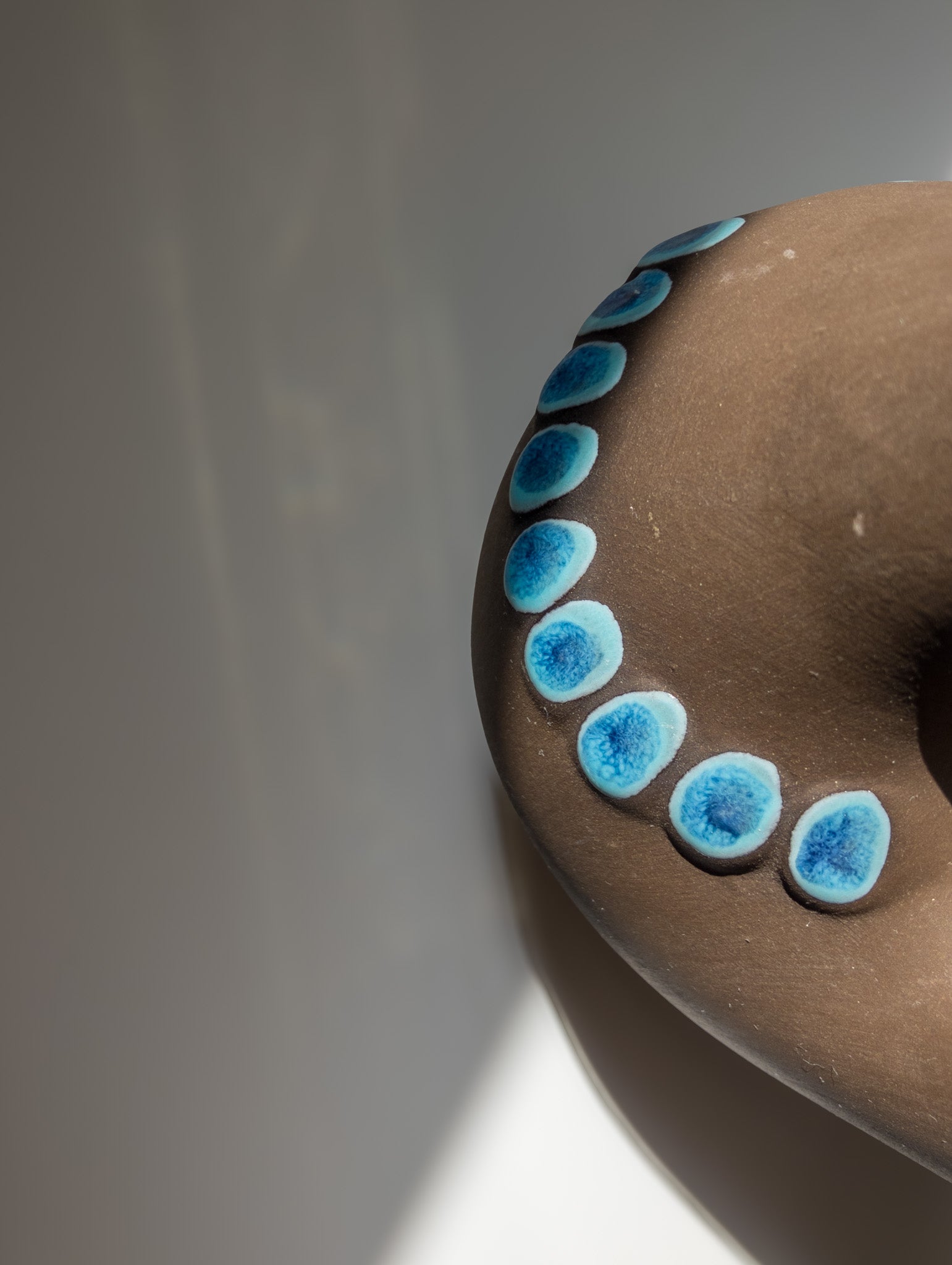 こちらは茶色いマットなボディに、首輪のような青いグレーズ。白いツルツルよりも親しみやすさがあって可愛らしい仕上がりになっています。