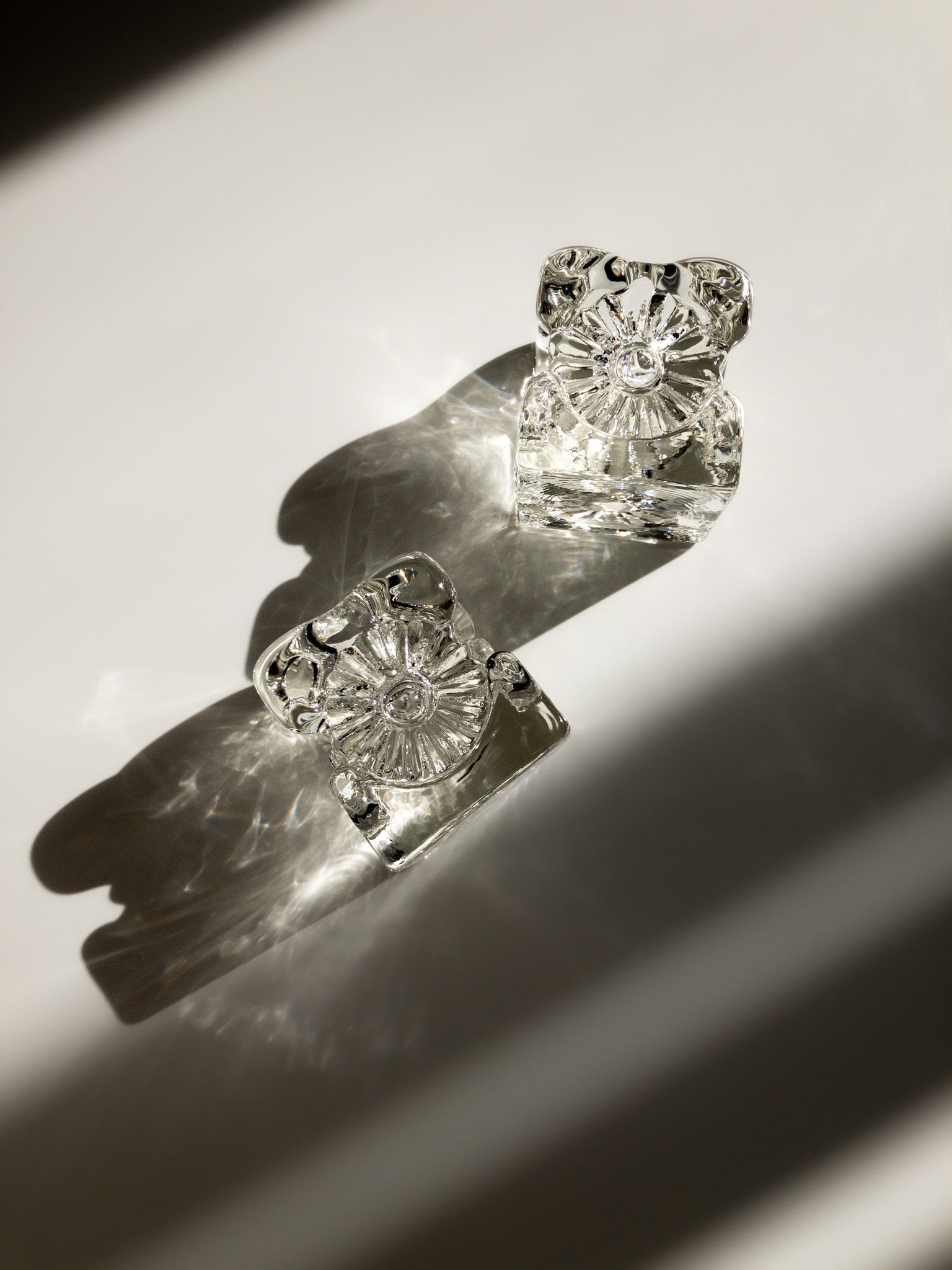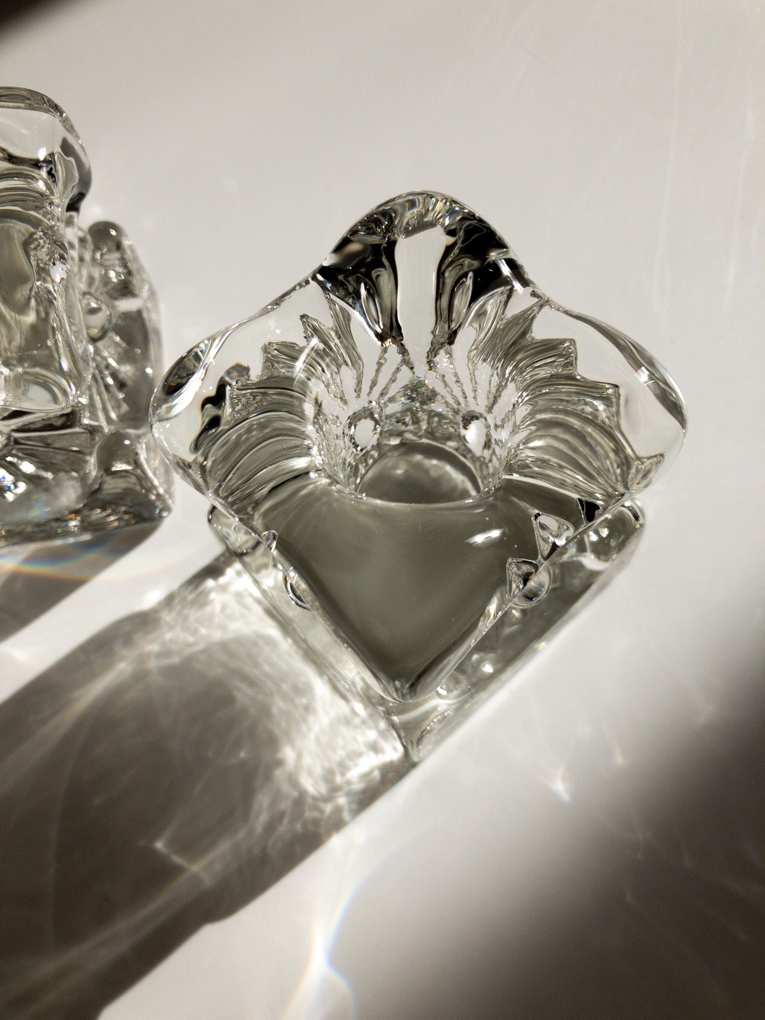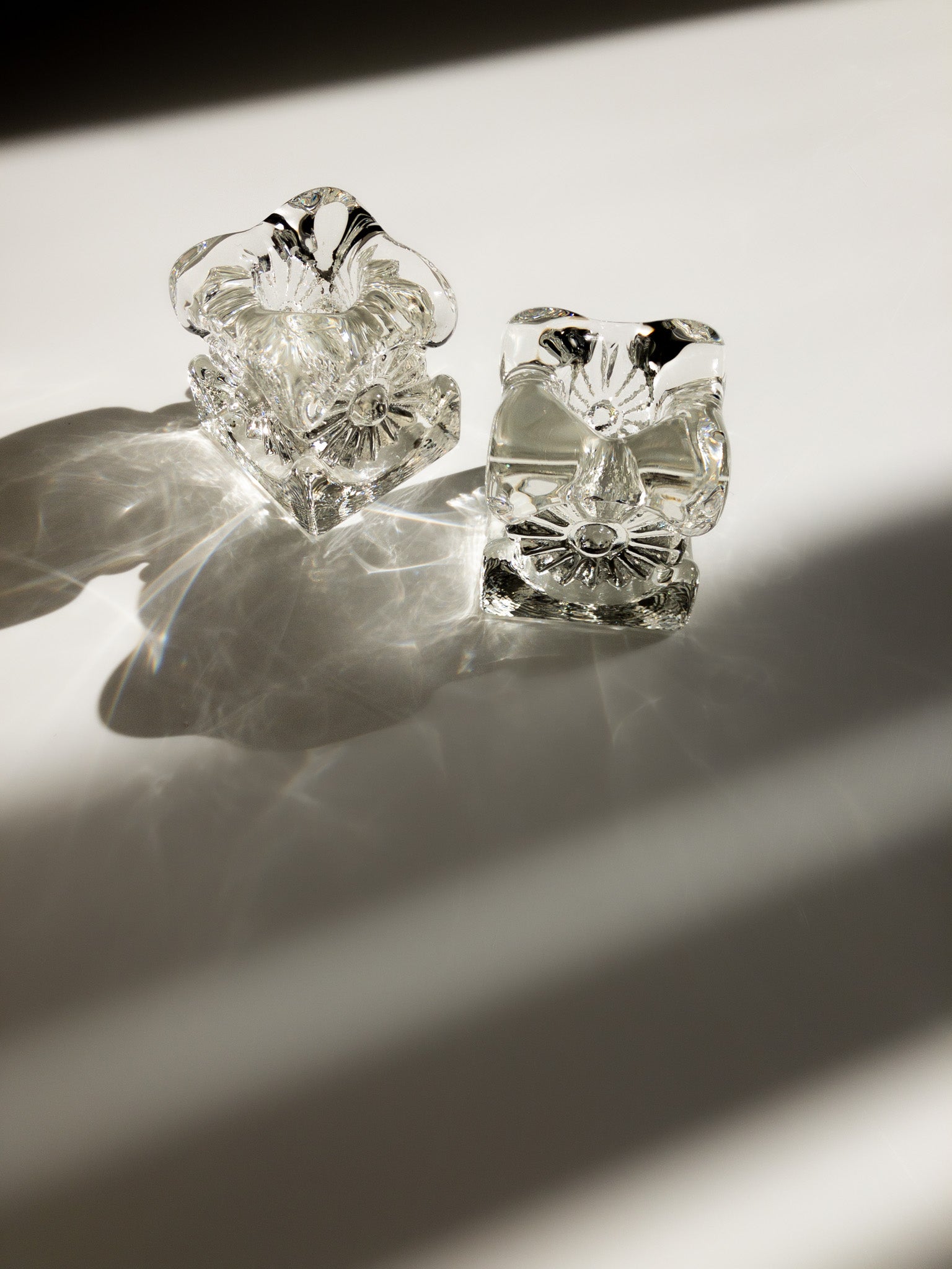 厚手のクリスタルガラスにデイジーのレリーフが施されており、繊細なデザインとしっかりとした作りが特徴。Daisyシリーズには異なる形状やサイズのバリエーションが存在し、キャンドルホルダーだけでなく花瓶などもあるようです。