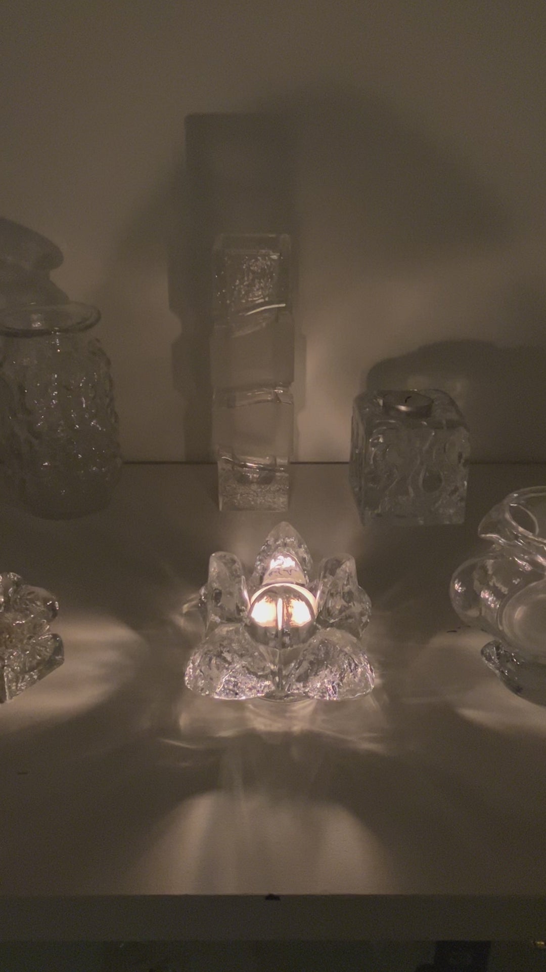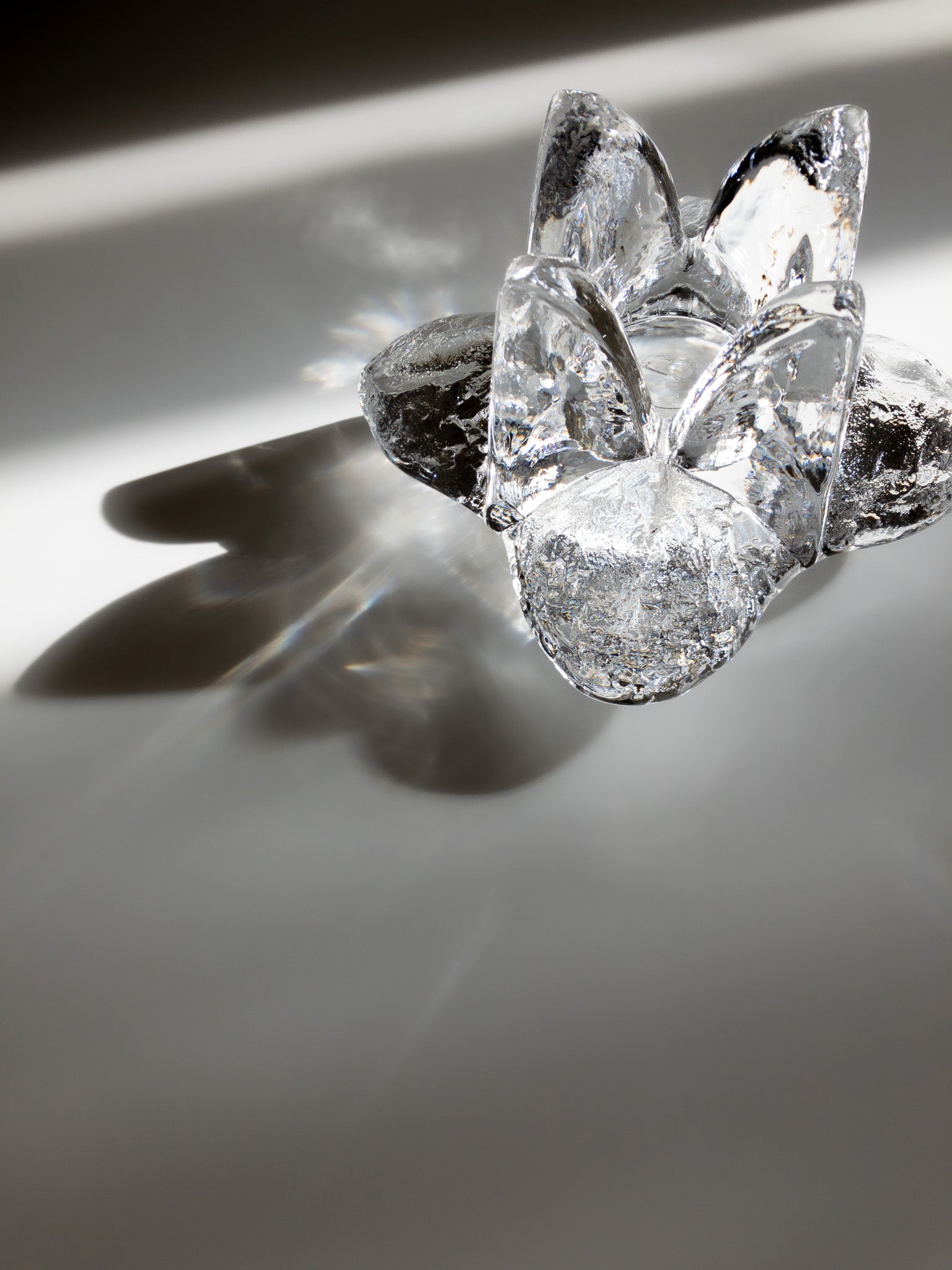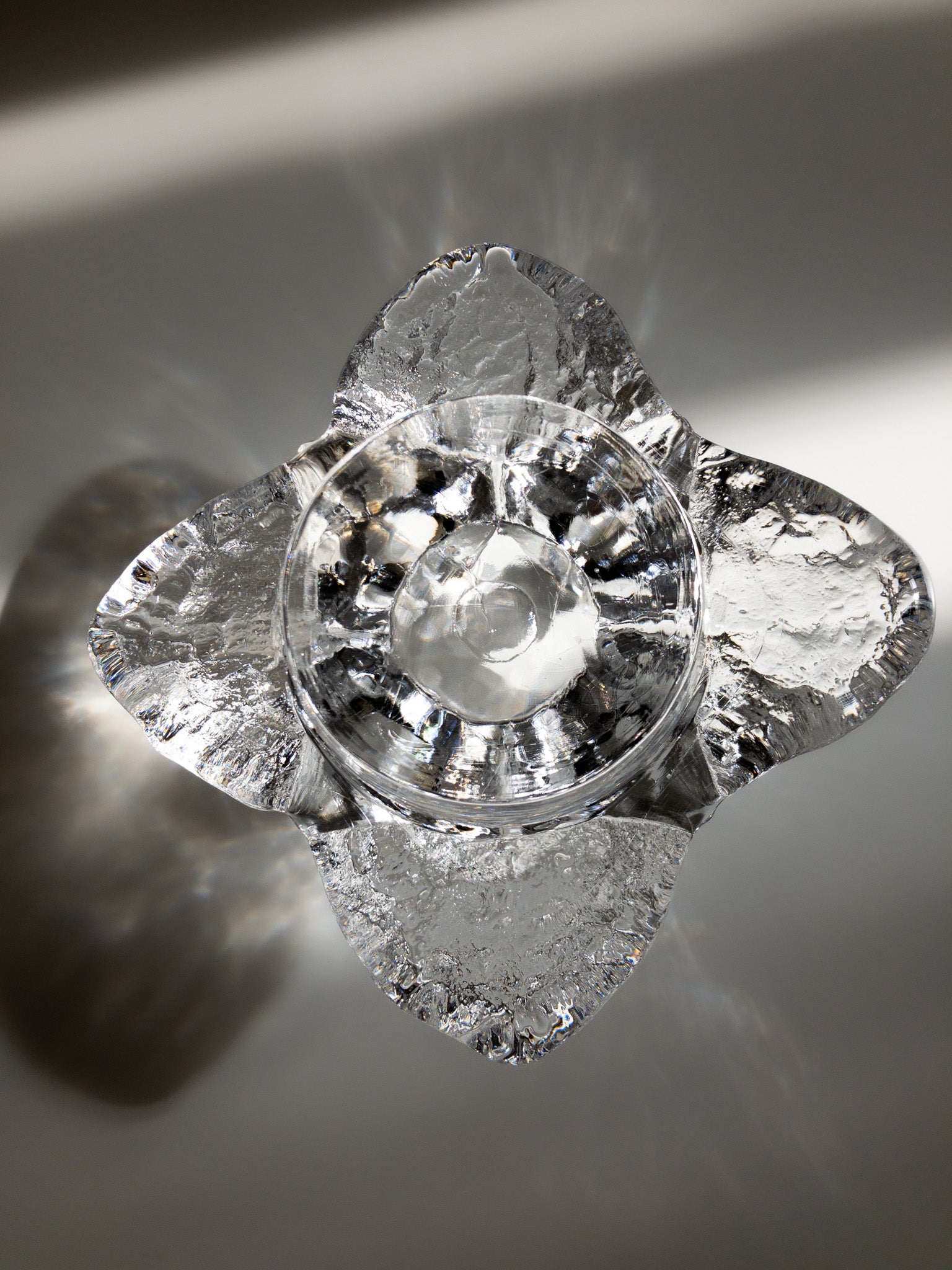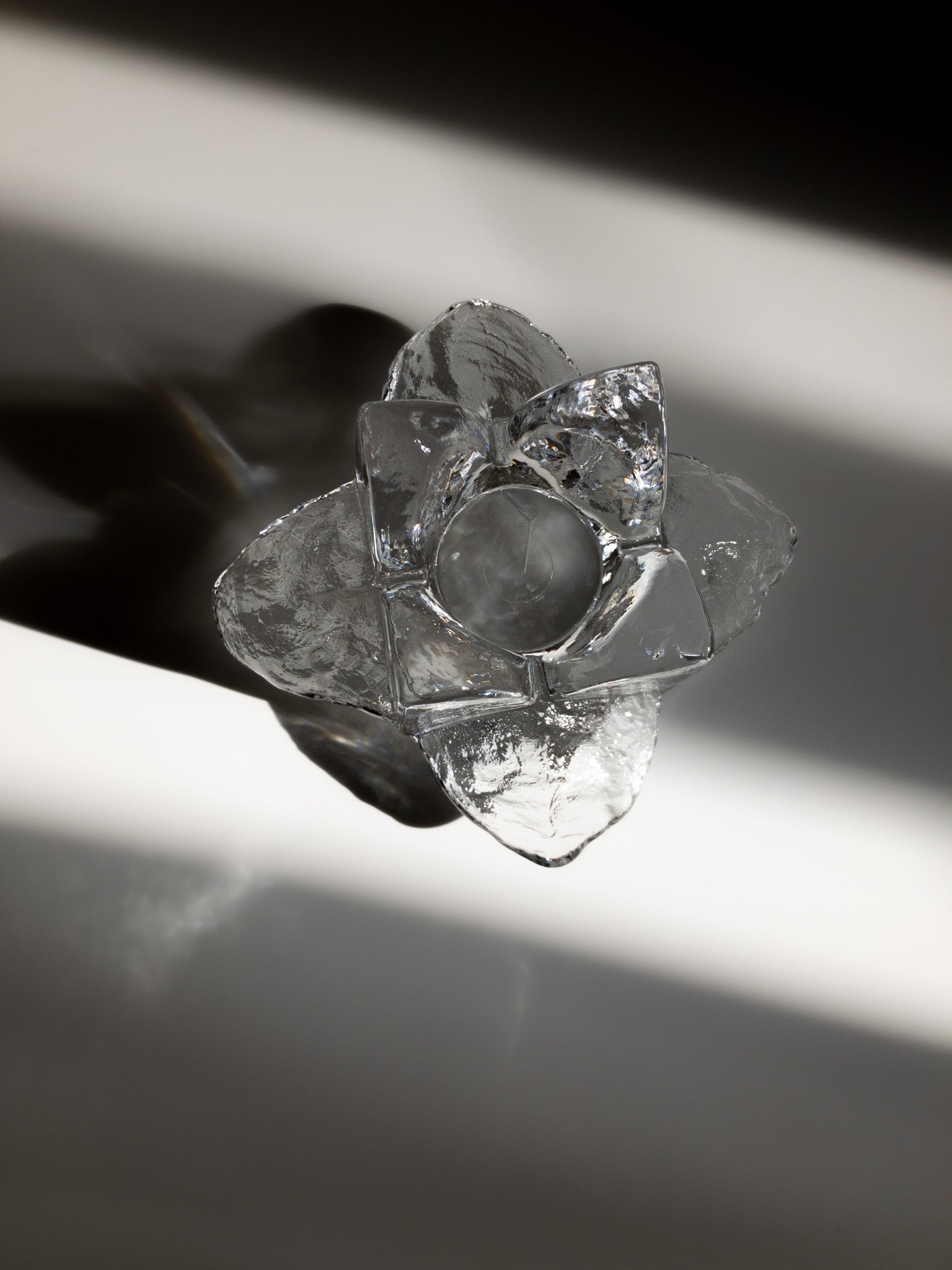 Ann Wolff(アン・ウォルフ)によるデザインで、スウェーデン語で「雪の星」を意味する「Snostjärna(Snowstar)」の名の通り、雪の結晶を彷彿とさせるユニークな形状。ずっしりと重く存在感がありますが、中心にティーライトキャンドルを置くように設計されており、透明で厚みのあるガラスを通して柔らかな光を放ってくれます。