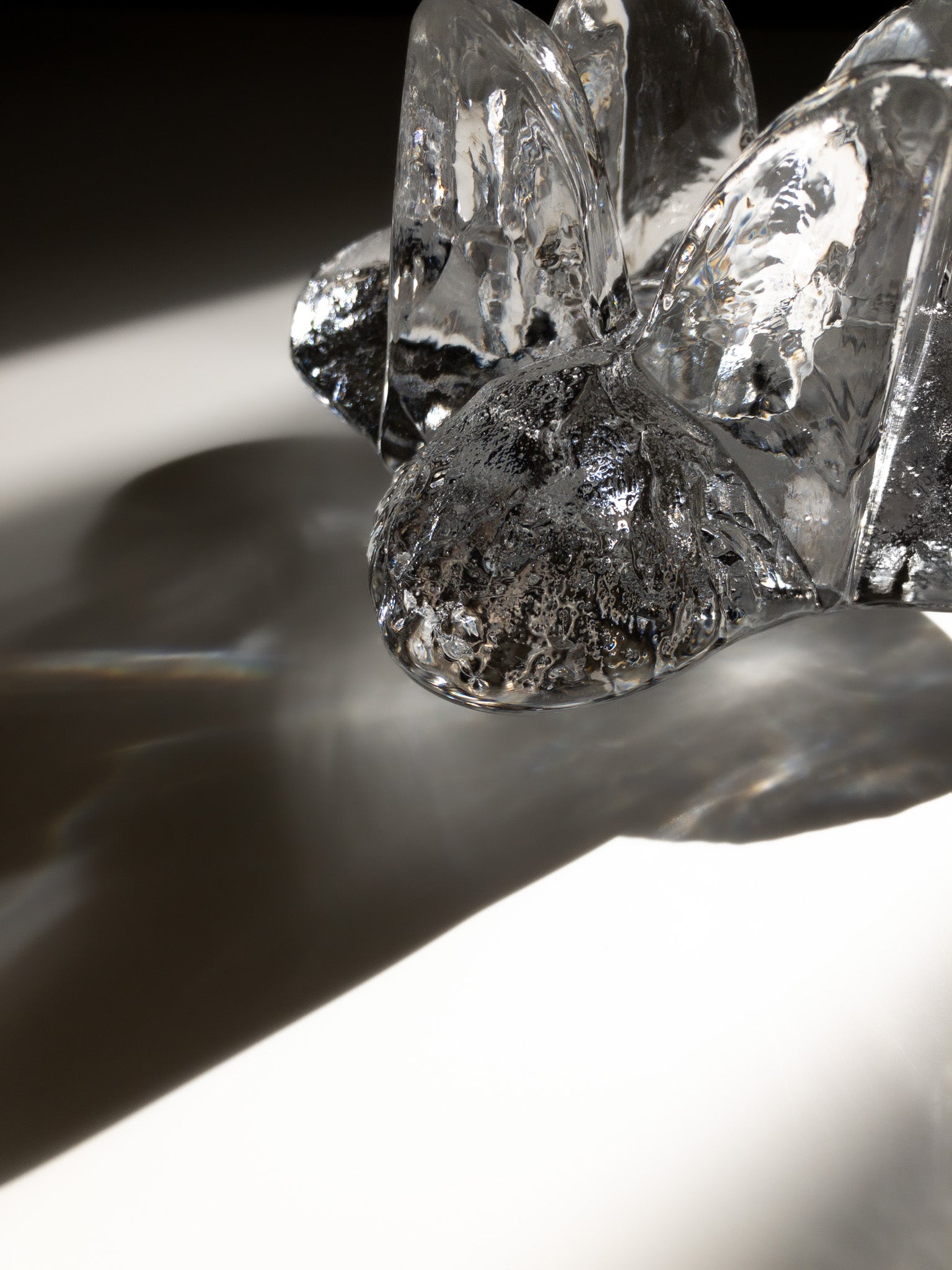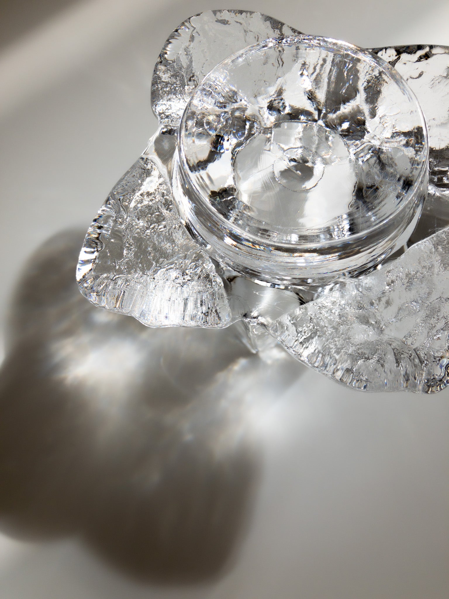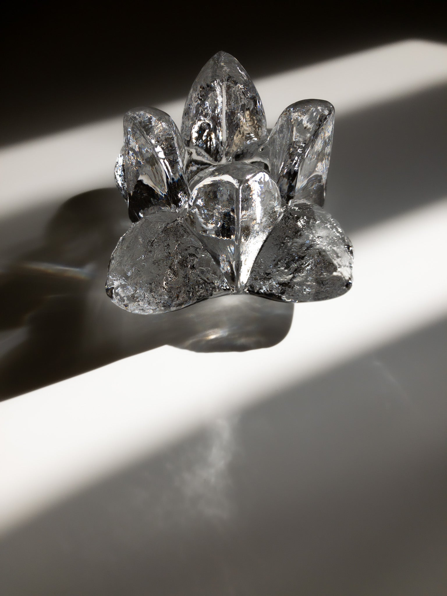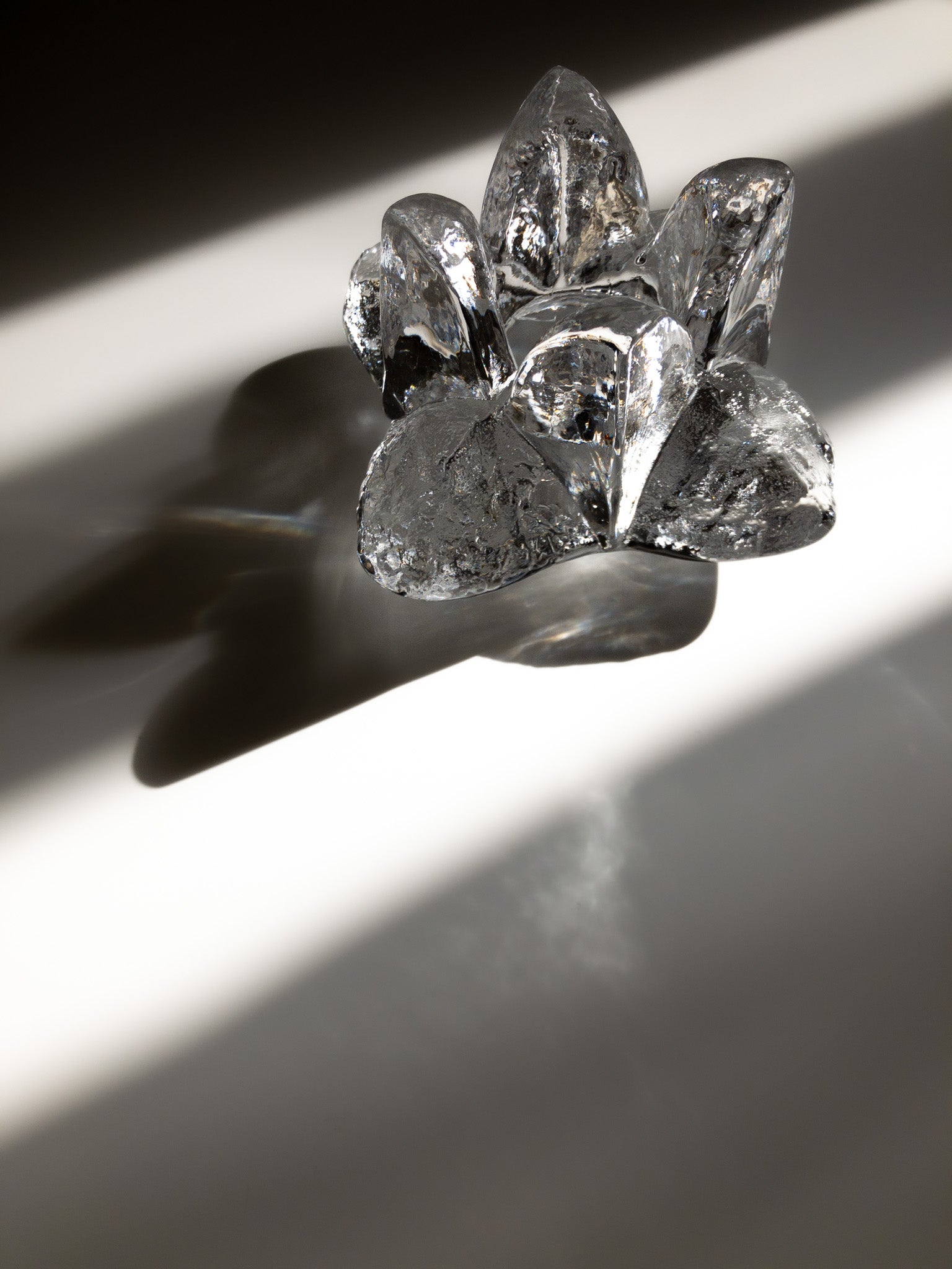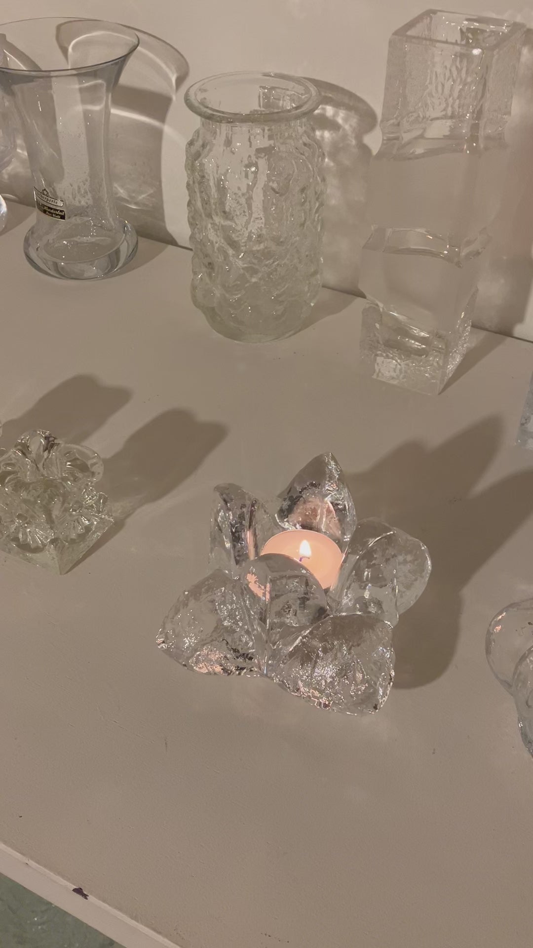 Ann Wolff(アン・ウォルフ)によるデザインで、スウェーデン語で「雪の星」を意味する「Snostjärna(Snowstar)」の名の通り、雪の結晶を彷彿とさせるユニークな形状。ずっしりと重く存在感がありますが、中心にティーライトキャンドルを置くように設計されており、透明で厚みのあるガラスを通して柔らかな光を放ってくれます。