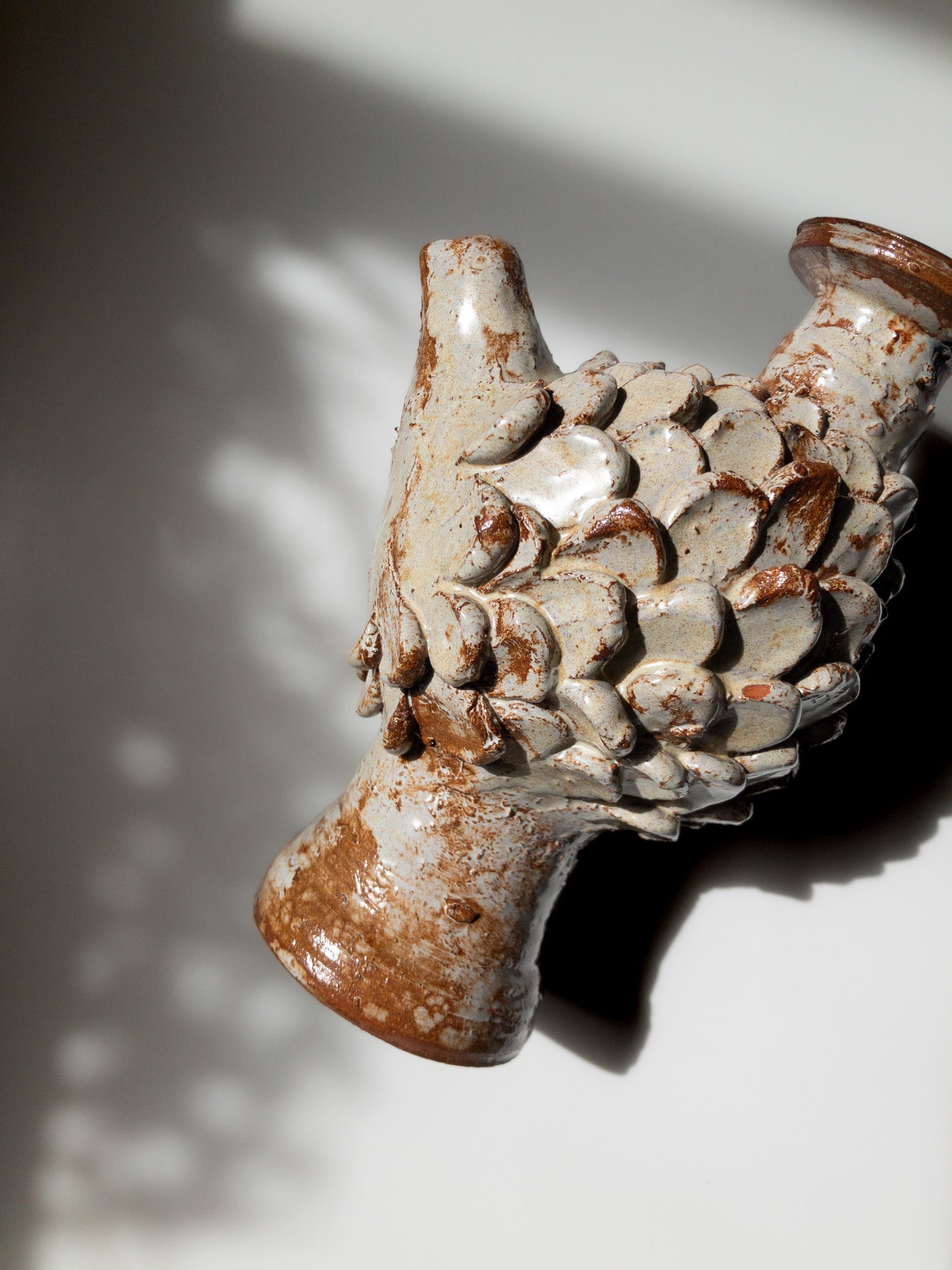 まんまるふくよかな胴体に、羽毛を思わせる立体的なモチーフがひとつひとつ丁寧に重ねられていて、胴体からピョいと突き出した顔が可愛い。ちょっとびっくりしたみたいな顔をしている気がするのですが、だから毛が逆立っているのでしょうか。