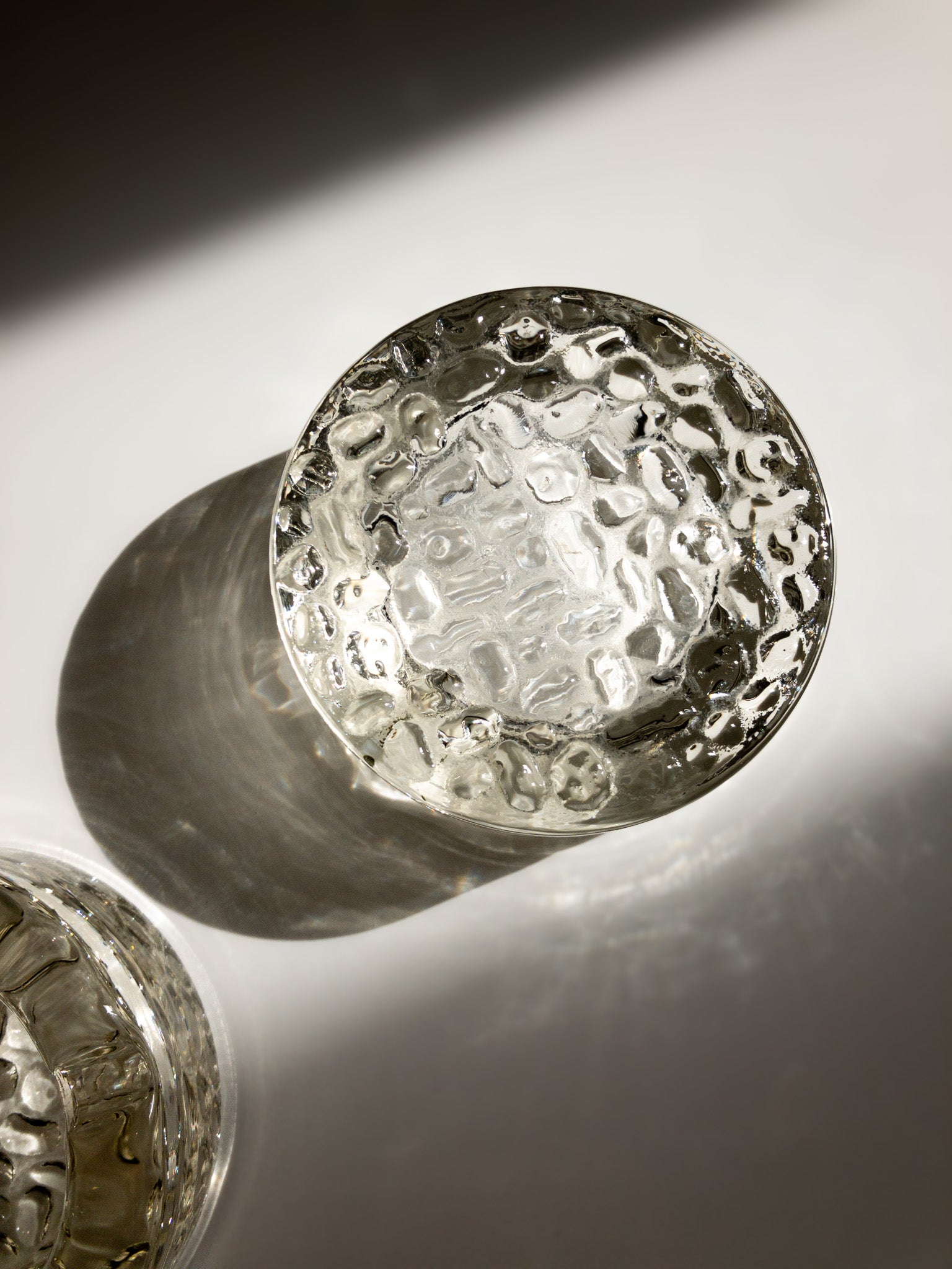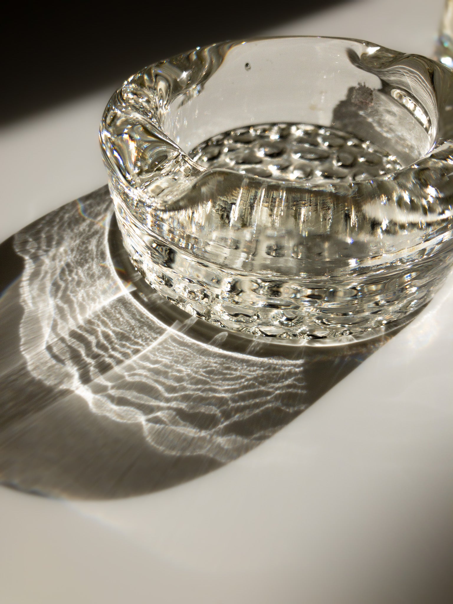シンプルな円形デザインでありながら、底部に施された凸凹加工がアクセントになっていて、ぷっくらとした厚みがあります。たぶんですが、Sklo Unionによるものではないかと。