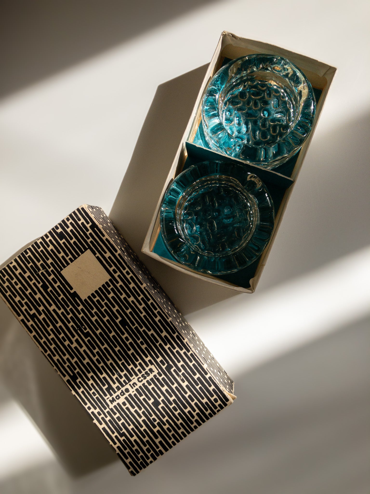 チェコスロバキア社会主義共和国(CSSR)時代に作られたガラス製の灰皿2個セット。「CSSR」と書かれた箱のデザインも最高です。