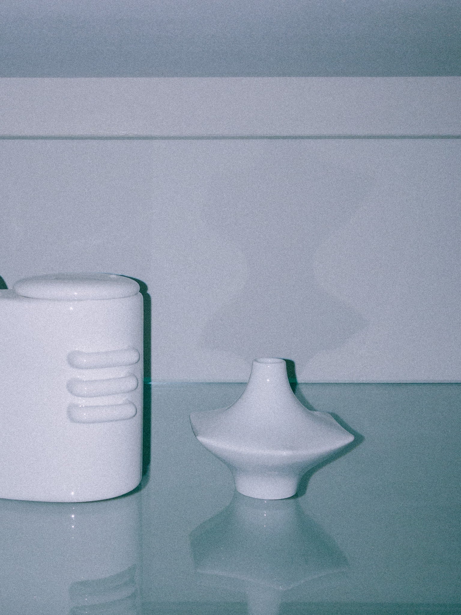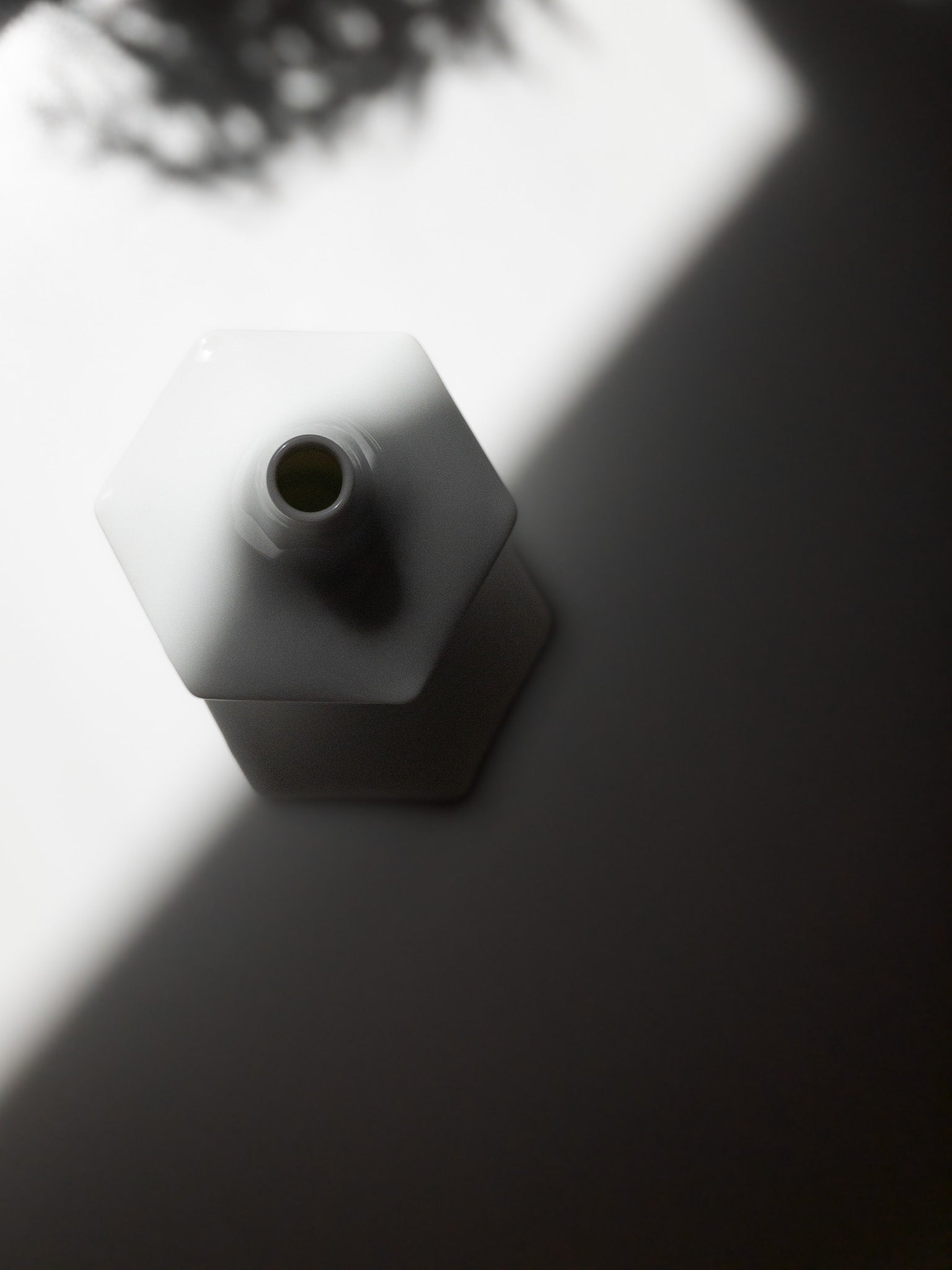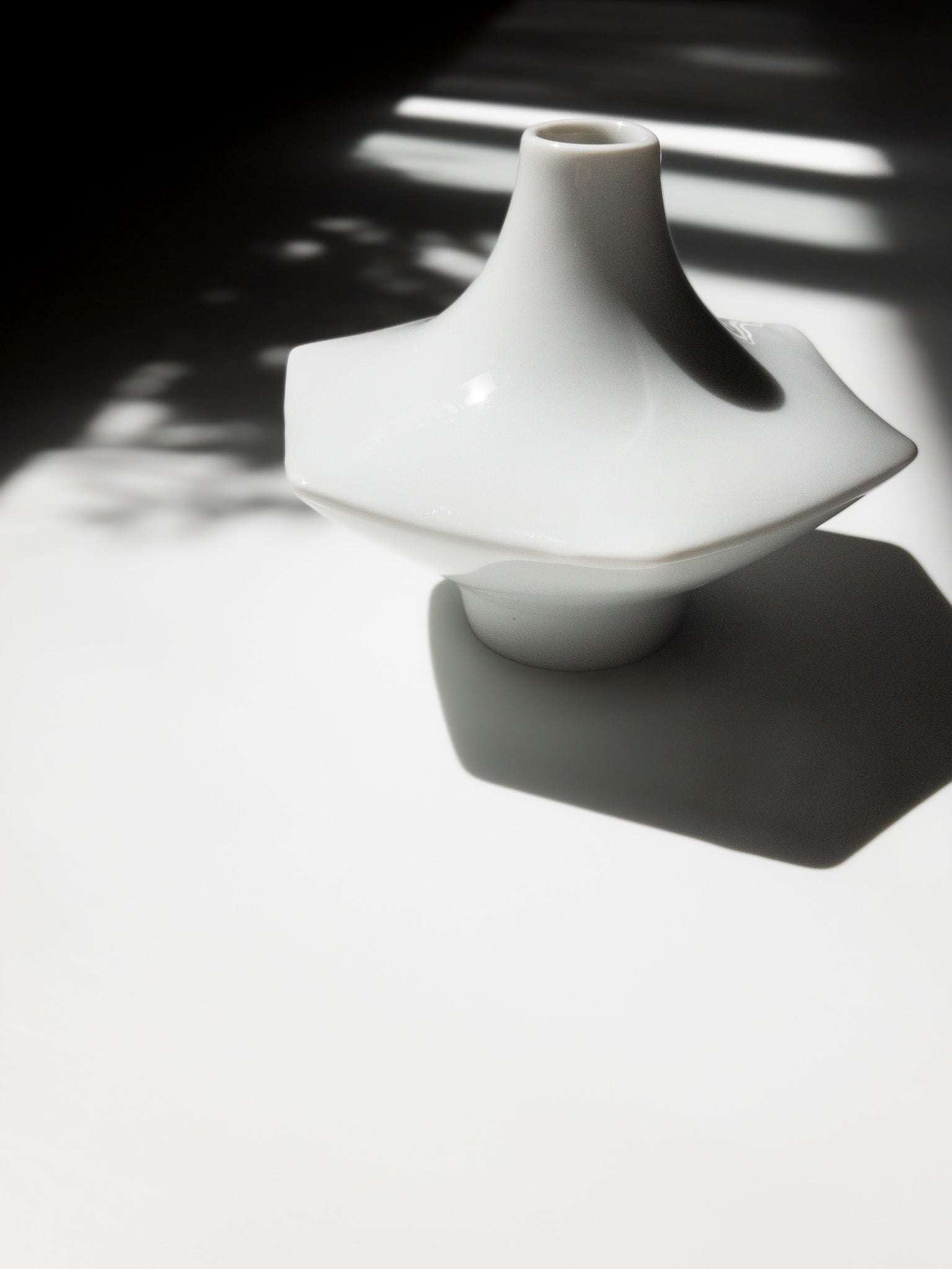 こちらの製品は純白の磁器で形成されており、高さ約10cmと小ぶりながらも、シャープな六角形のフォルムと幾何学的なバランスが印象的です。いわゆる「スペースエイジ」様式を思わせる前衛的なデザイン。
