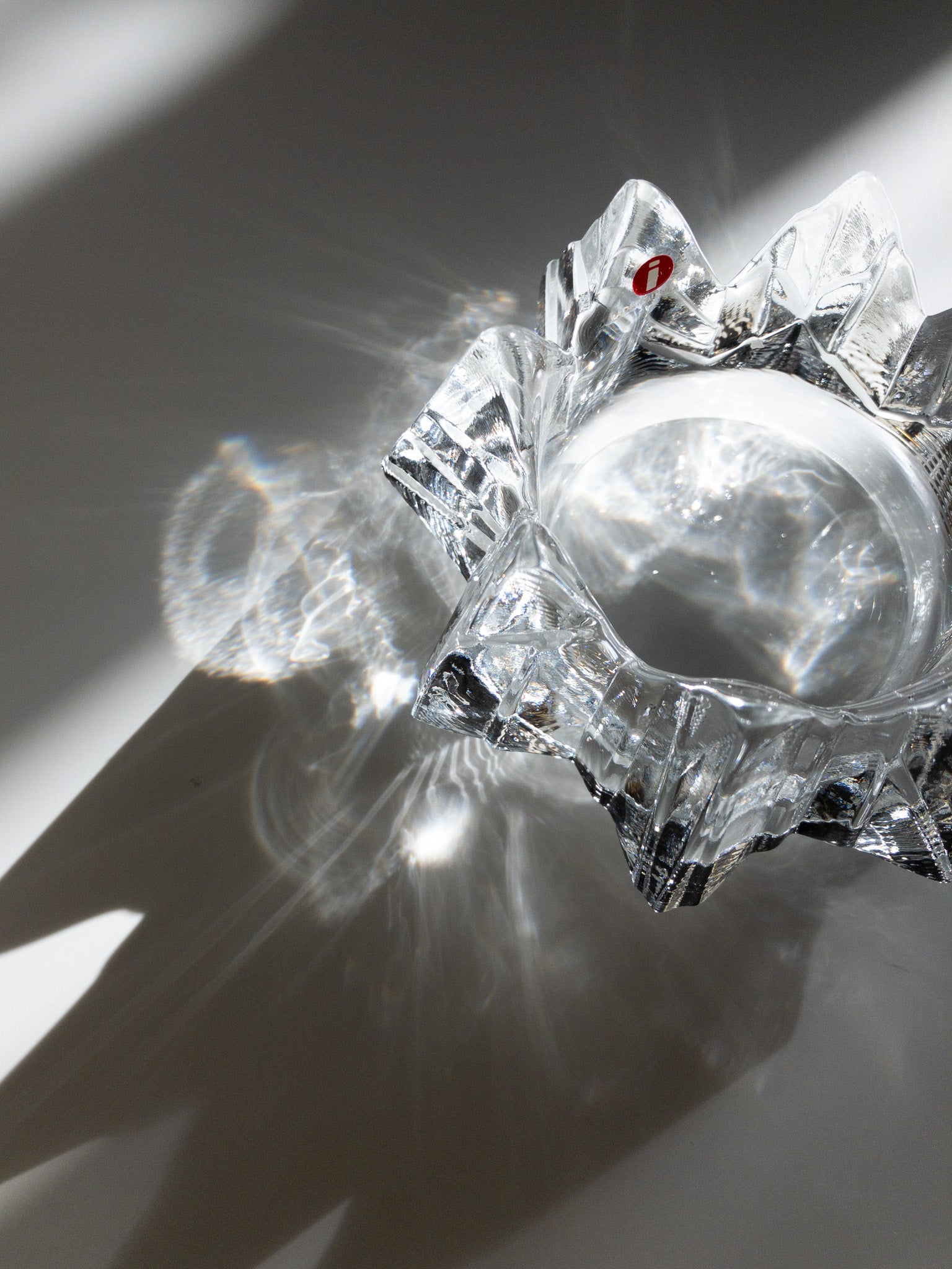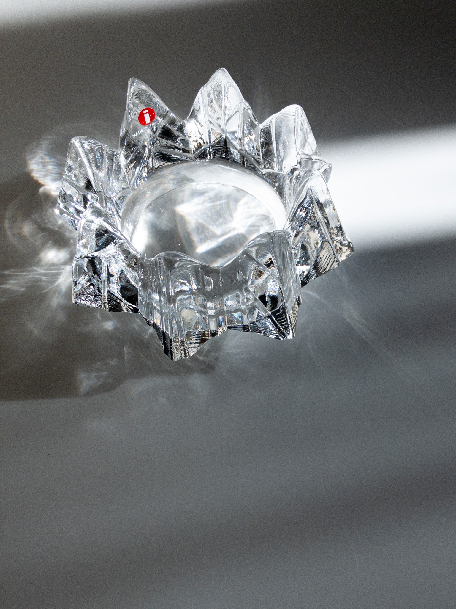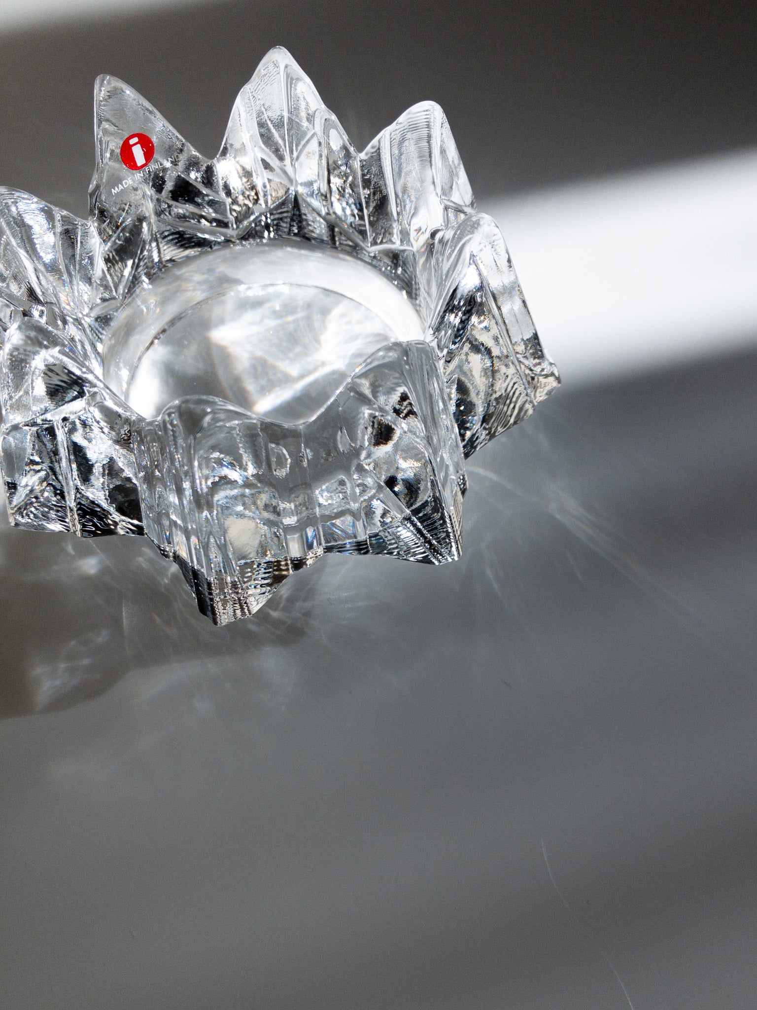 ティーライトホルダーの表面には幾何学的なエンボス模様が施されており、この細かなテクスチャーが光を乱反射させることで、部屋全体にキャンドルの灯りが優しく拡がります。光がガラスを透過する際には、まるで氷のような冷たく澄んだ光の屈折が見られ、なんとも美しい影が現れ、さすがiittalaと言いたくなります。