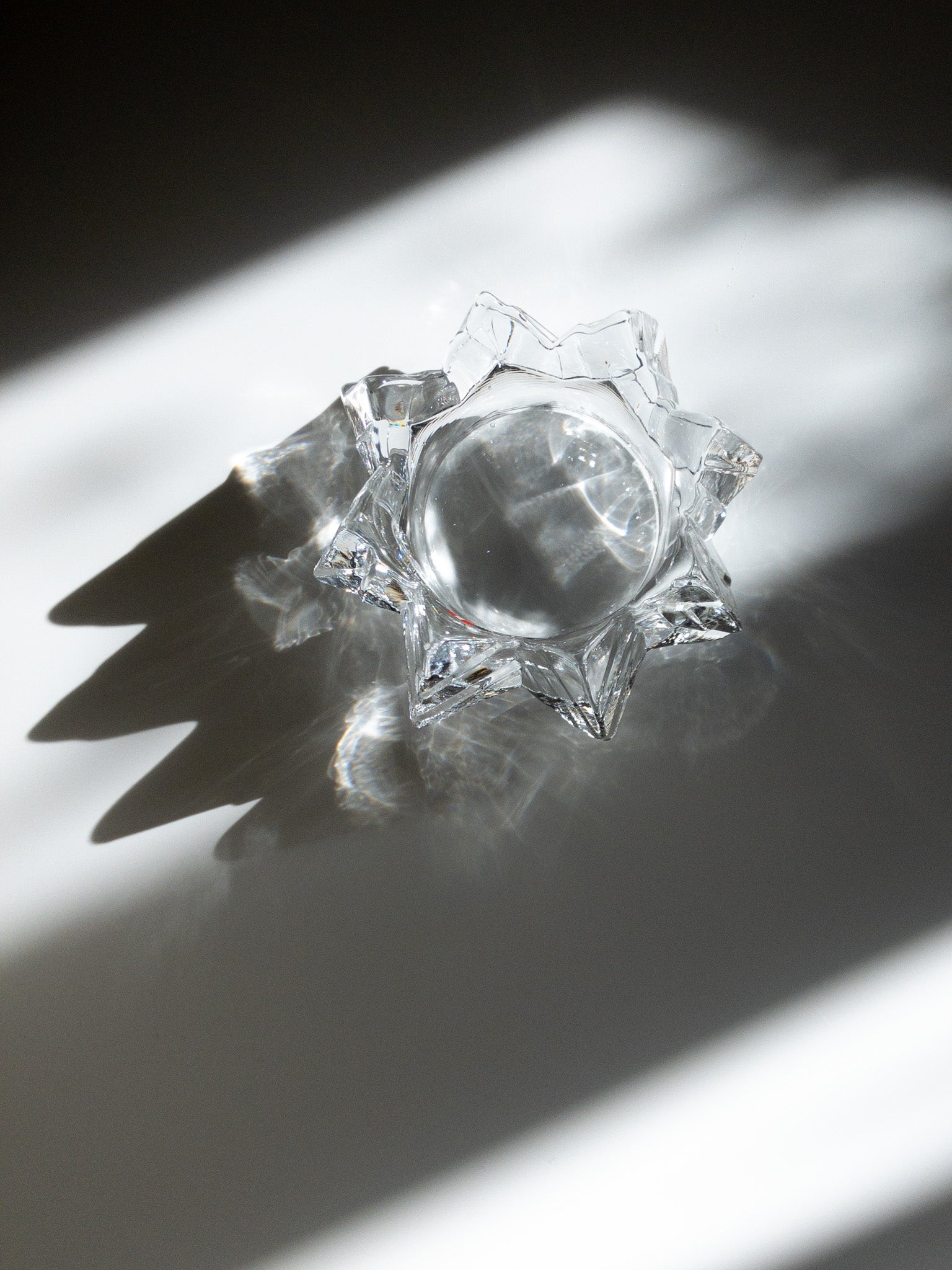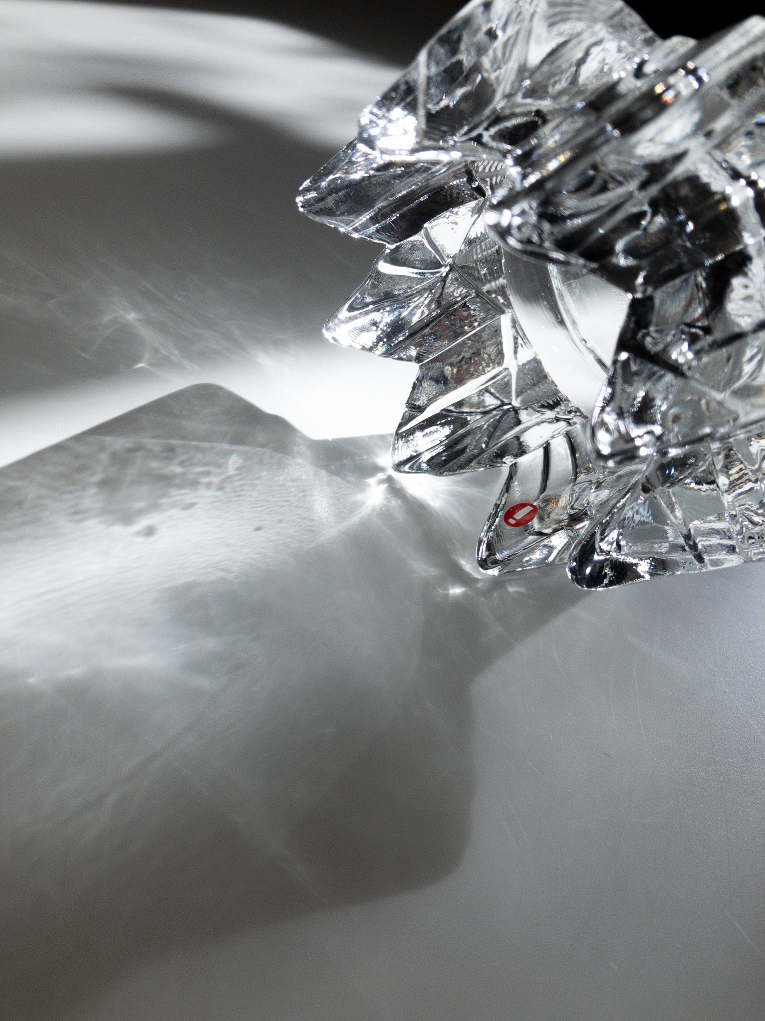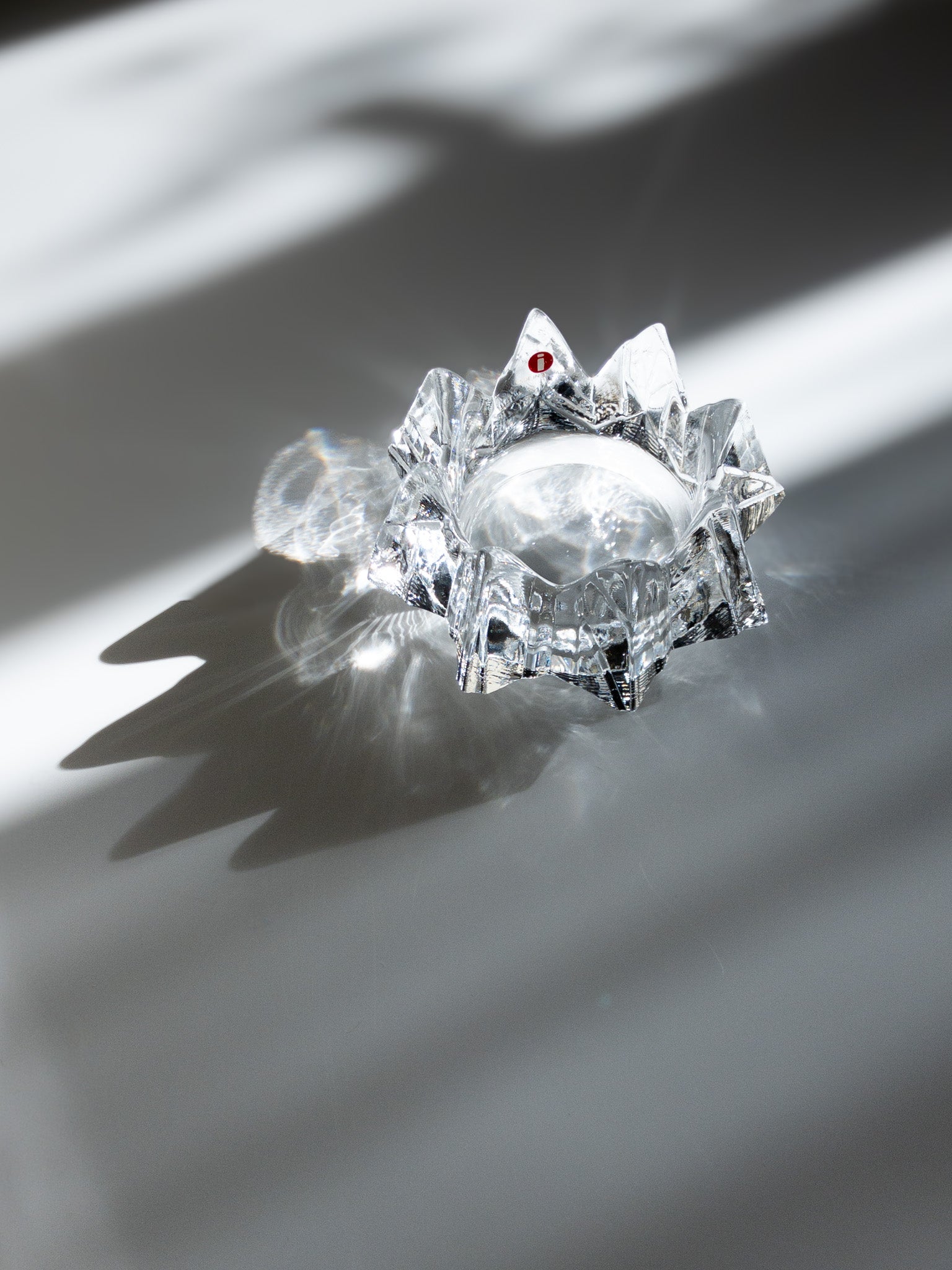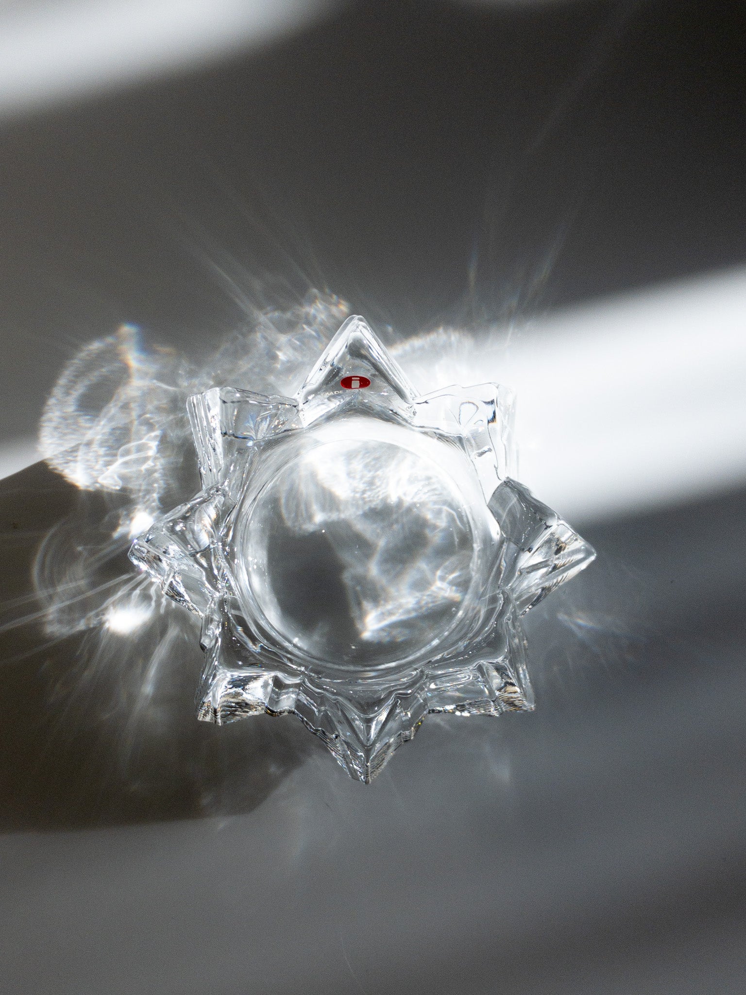 ティーライトホルダーの表面には幾何学的なエンボス模様が施されており、この細かなテクスチャーが光を乱反射させることで、部屋全体にキャンドルの灯りが優しく拡がります。光がガラスを透過する際には、まるで氷のような冷たく澄んだ光の屈折が見られ、なんとも美しい影が現れ、さすがiittalaと言いたくなります。