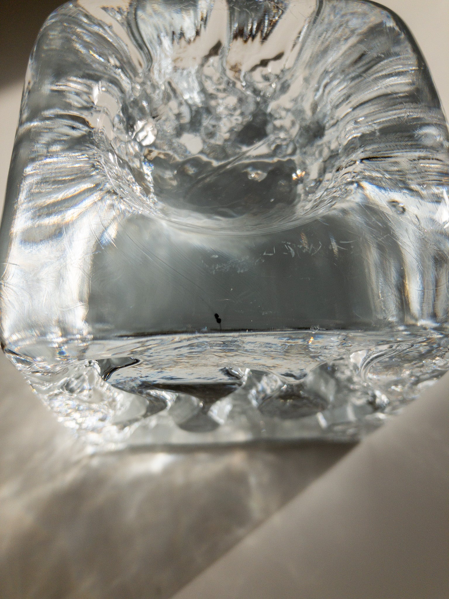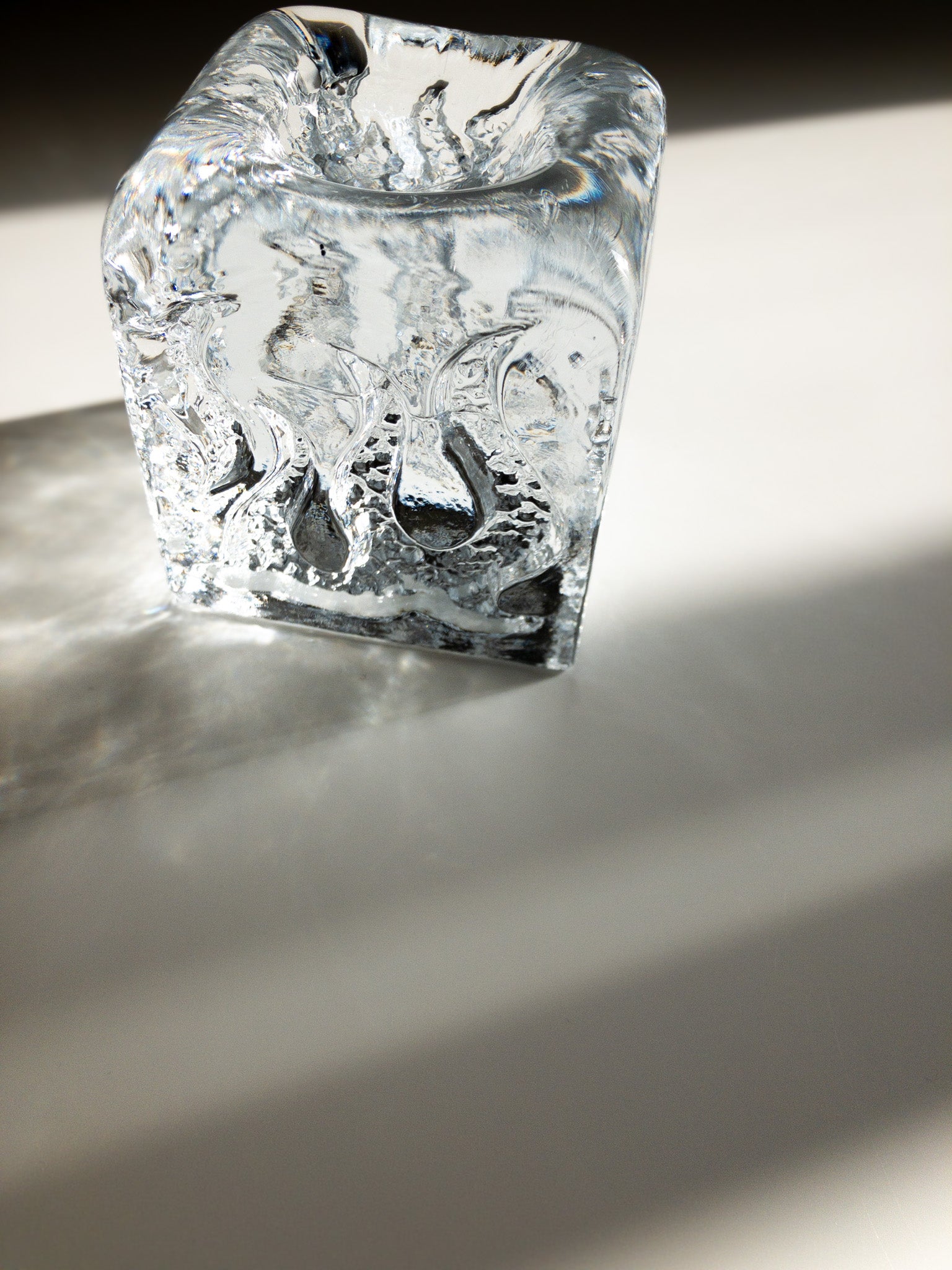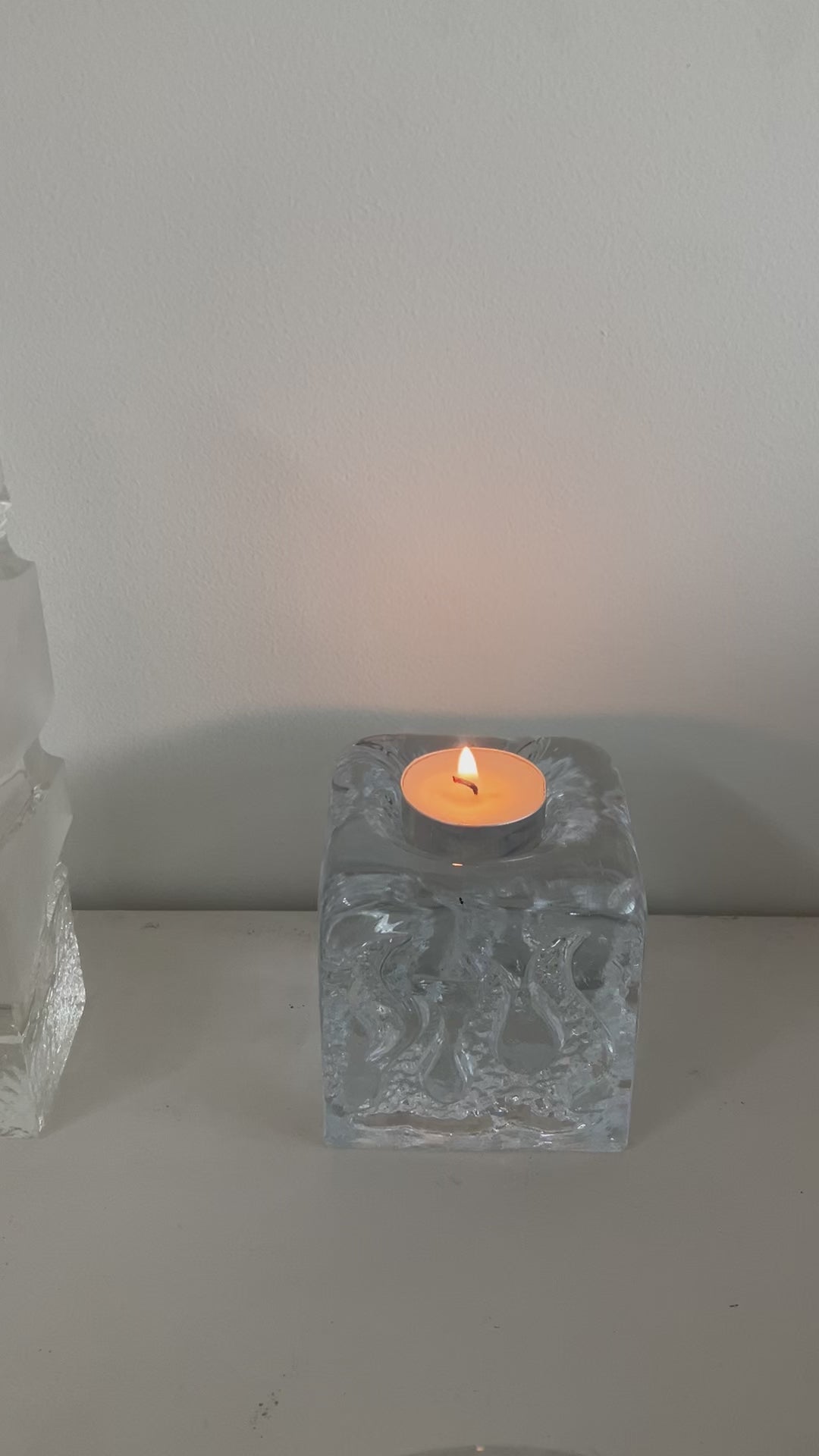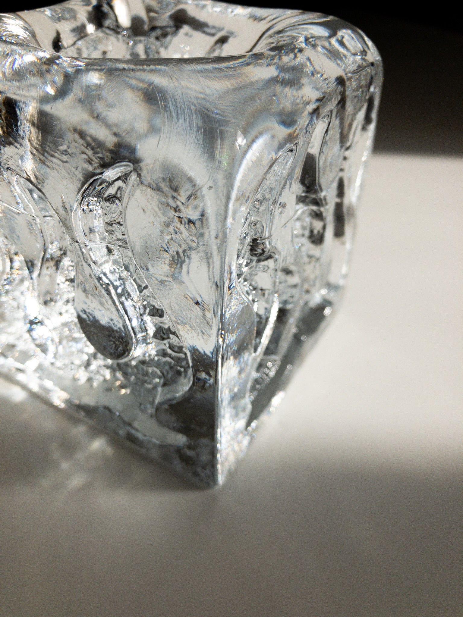 Kurt Wokan(カート・ウォカン)の指揮のもと製作されたこの作品は、「氷樹皮ガラス」と呼ばれるスタイルで、波状の模様が特徴。立方体の形をしていて、上部のくぼみ部分にティーライトキャンドルを置くようになっていますが、重量感があるのでペーパーウェイトとして使っても良いかと思います。