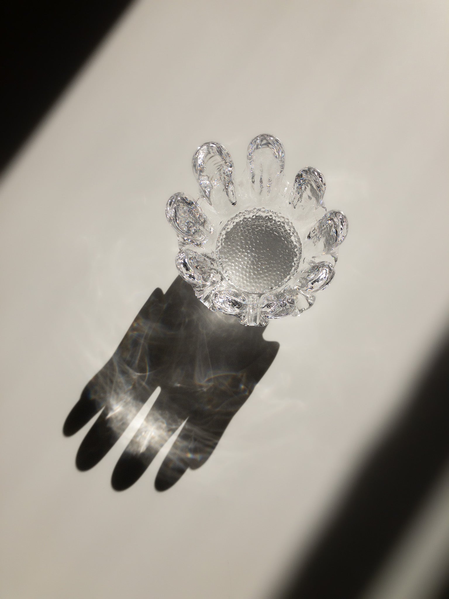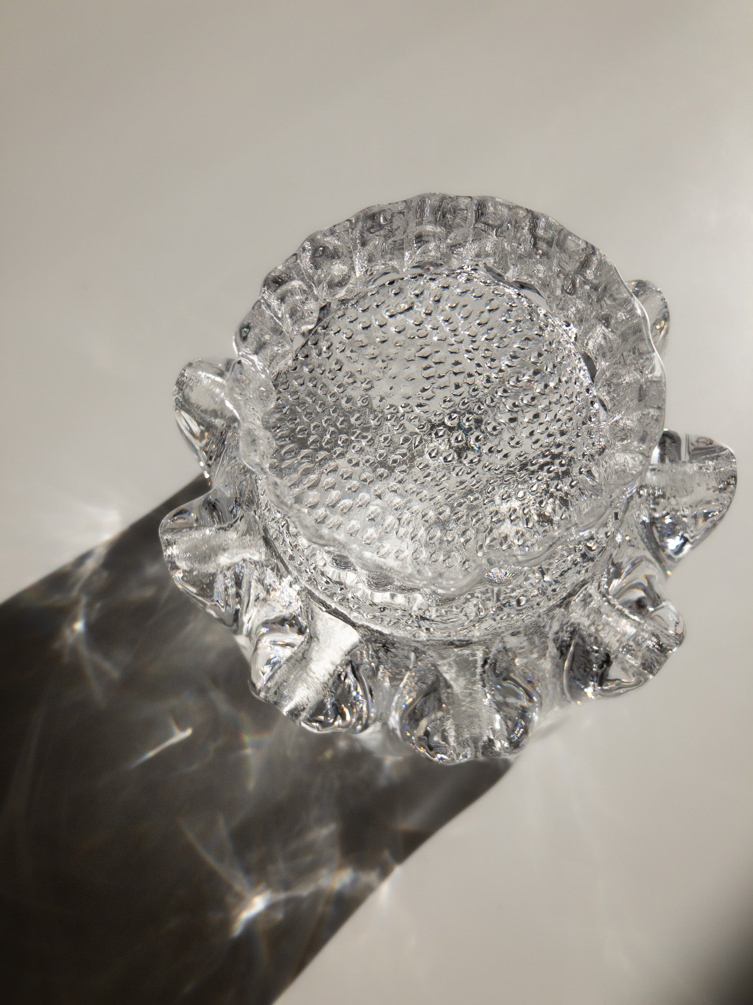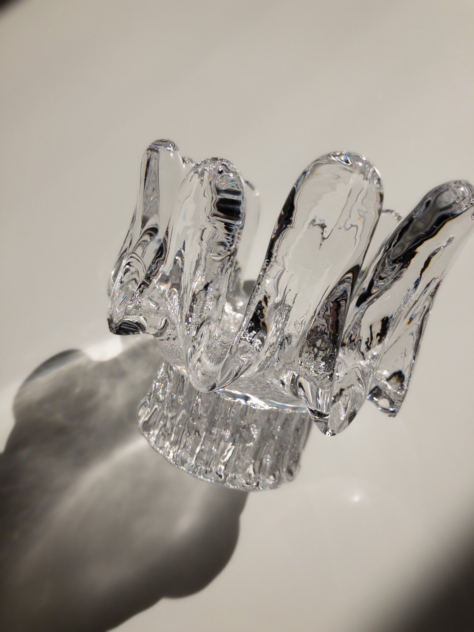 スウェーデン Kosta Boda「Sunflower」のキャンドルホルダー。Göran Wärf(ヨーラン・ヴェルフ)によって1974年にデザインされた、ヴィンテージのスカンジナビアガラスです。クリアガラスを使用しており、ひまわりのような花弁部分は滑らか。内側はデコボコしていて、高台?の部分もまた質感が異なります。ひまわりと言っても満開になる前のひまわりでしょうか。これから咲きますよ、くらいの感じです。キャンドルを真ん中に置くと花弁に包まれているみたい。