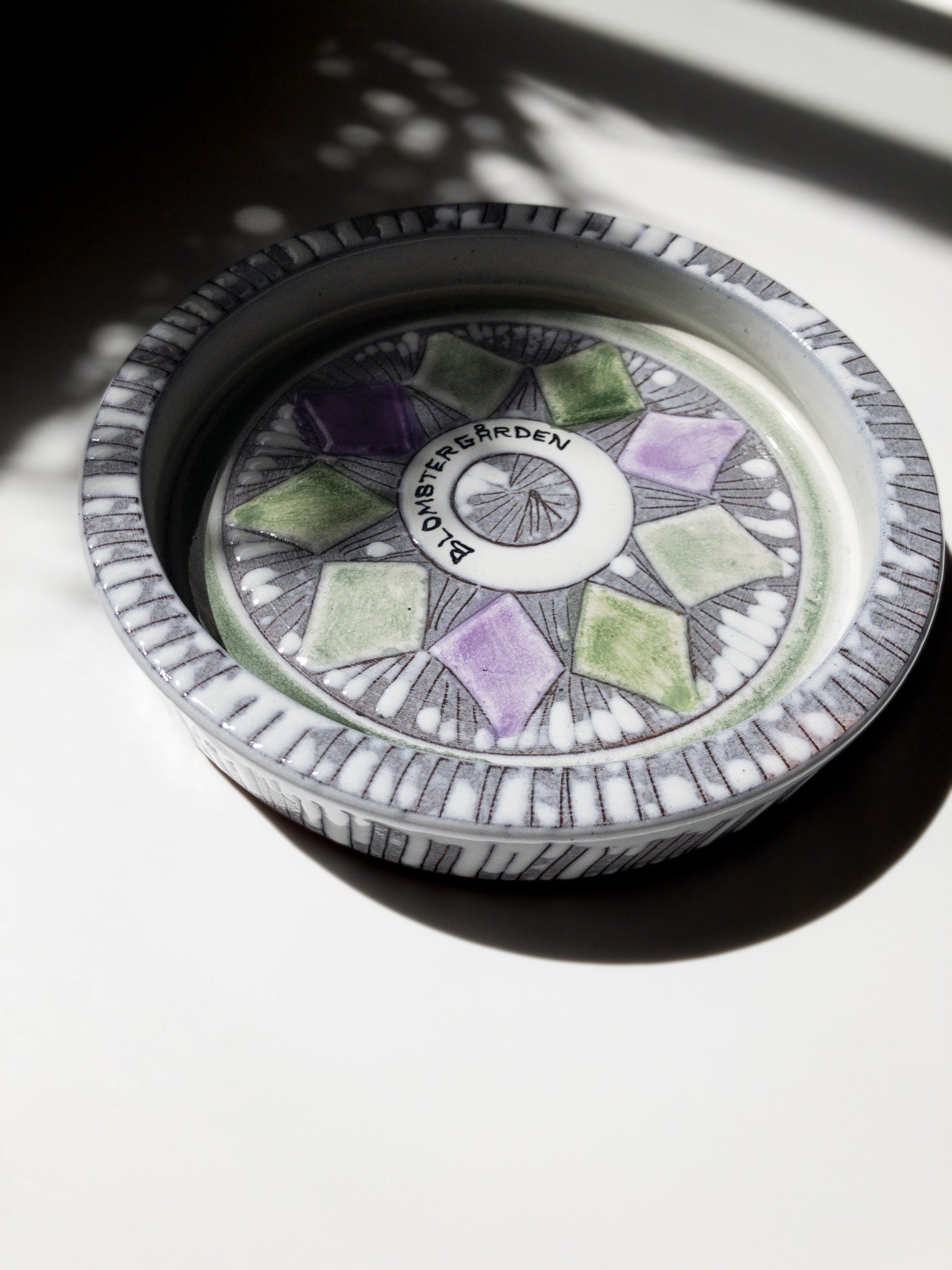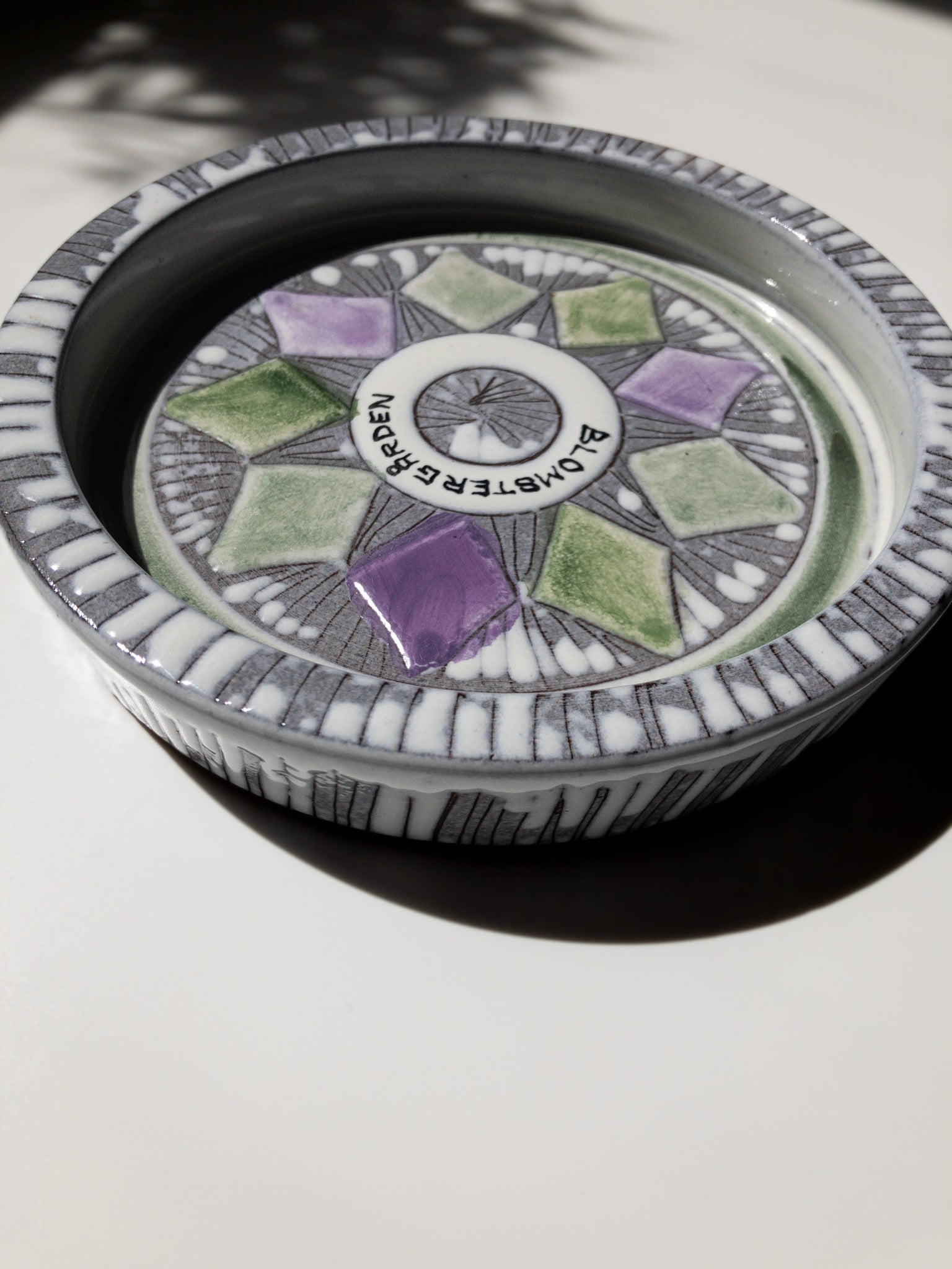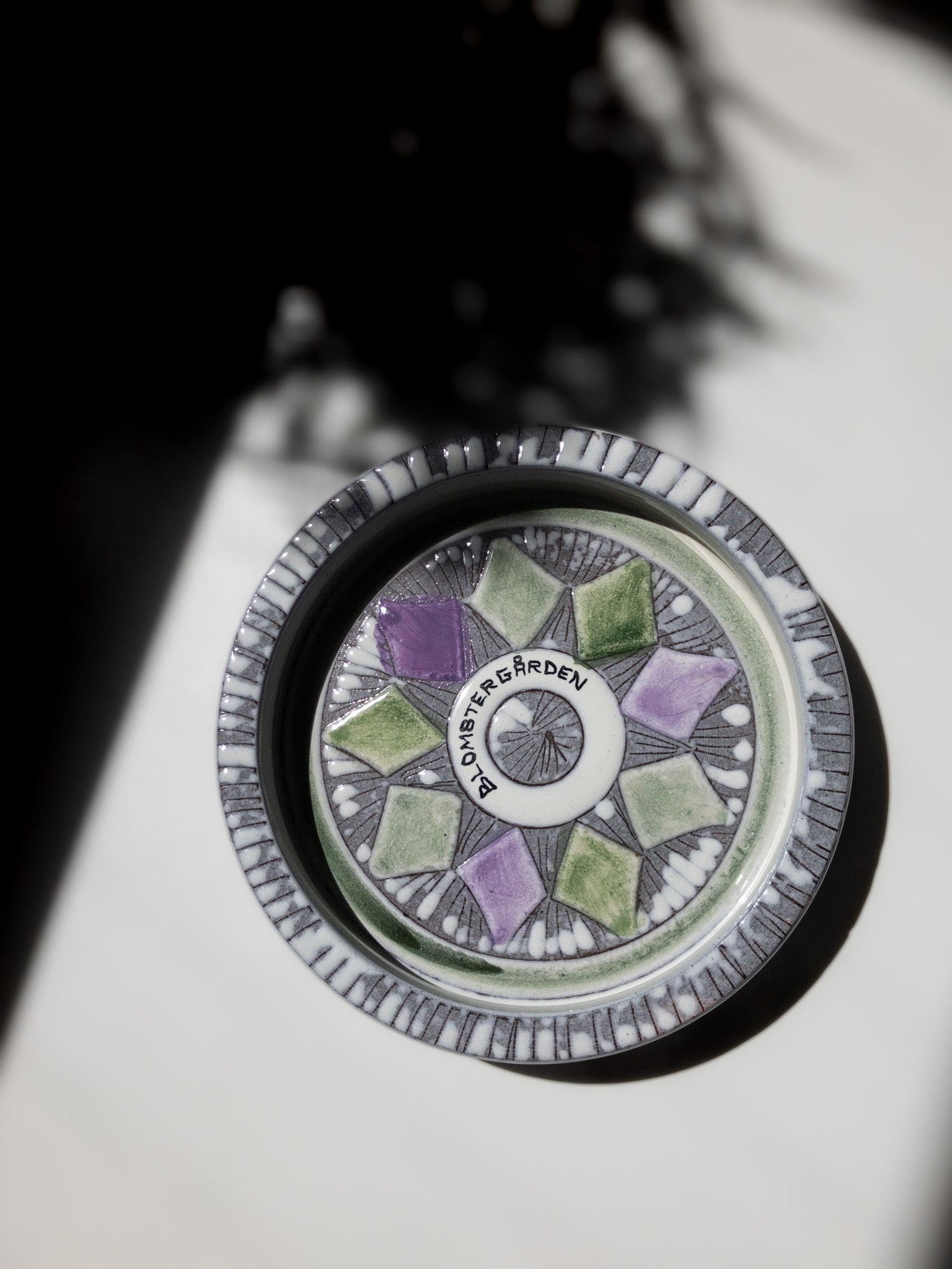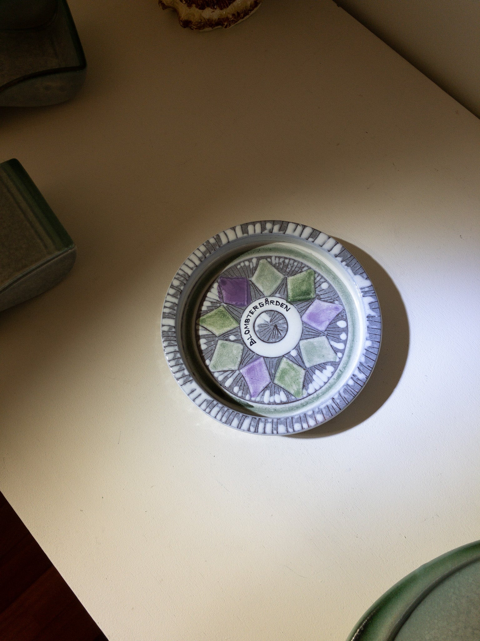 模様は手描きで描かれており、落ち着いた紫と柔らかな緑のダイヤが9つ並んでいて、真ん中の円には手書きで「Blomstergården」と書かれています。