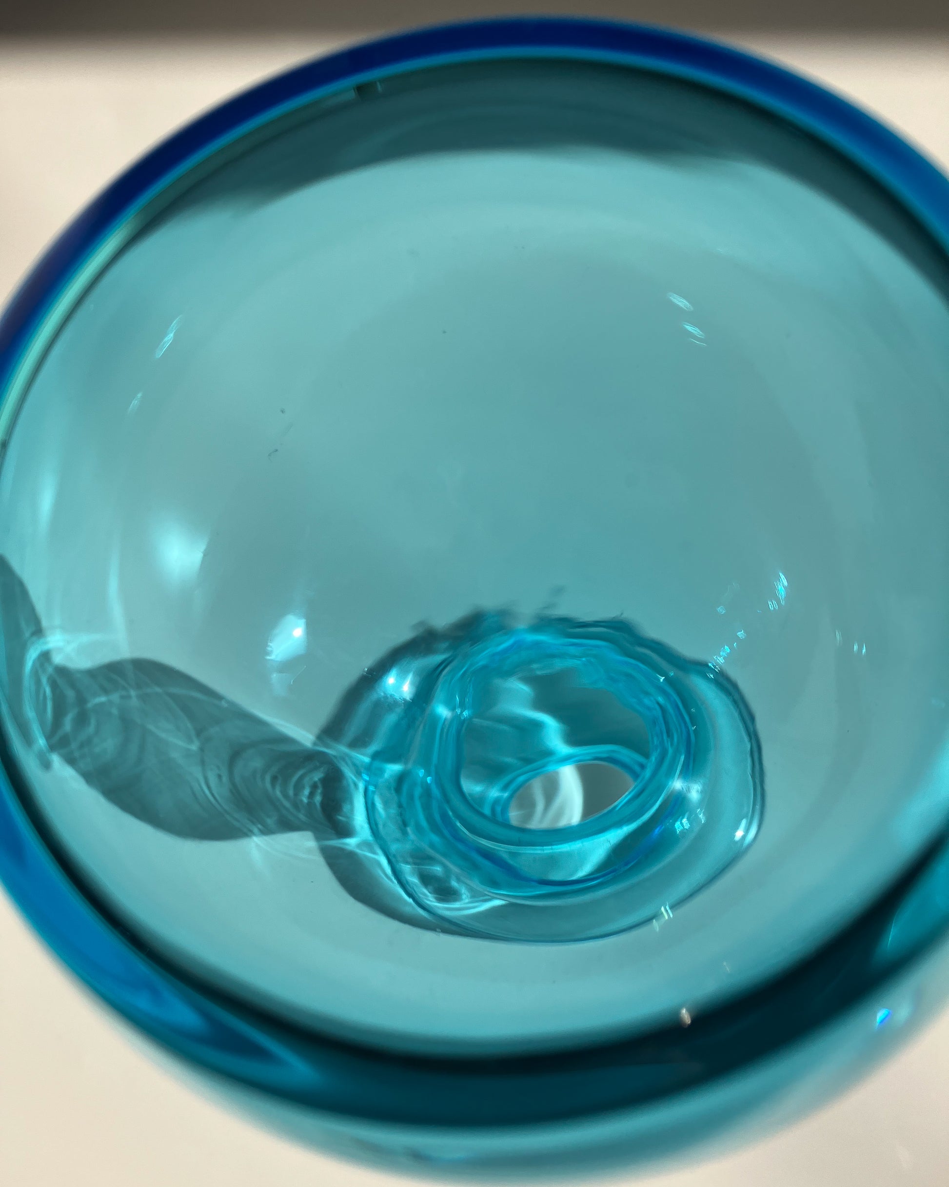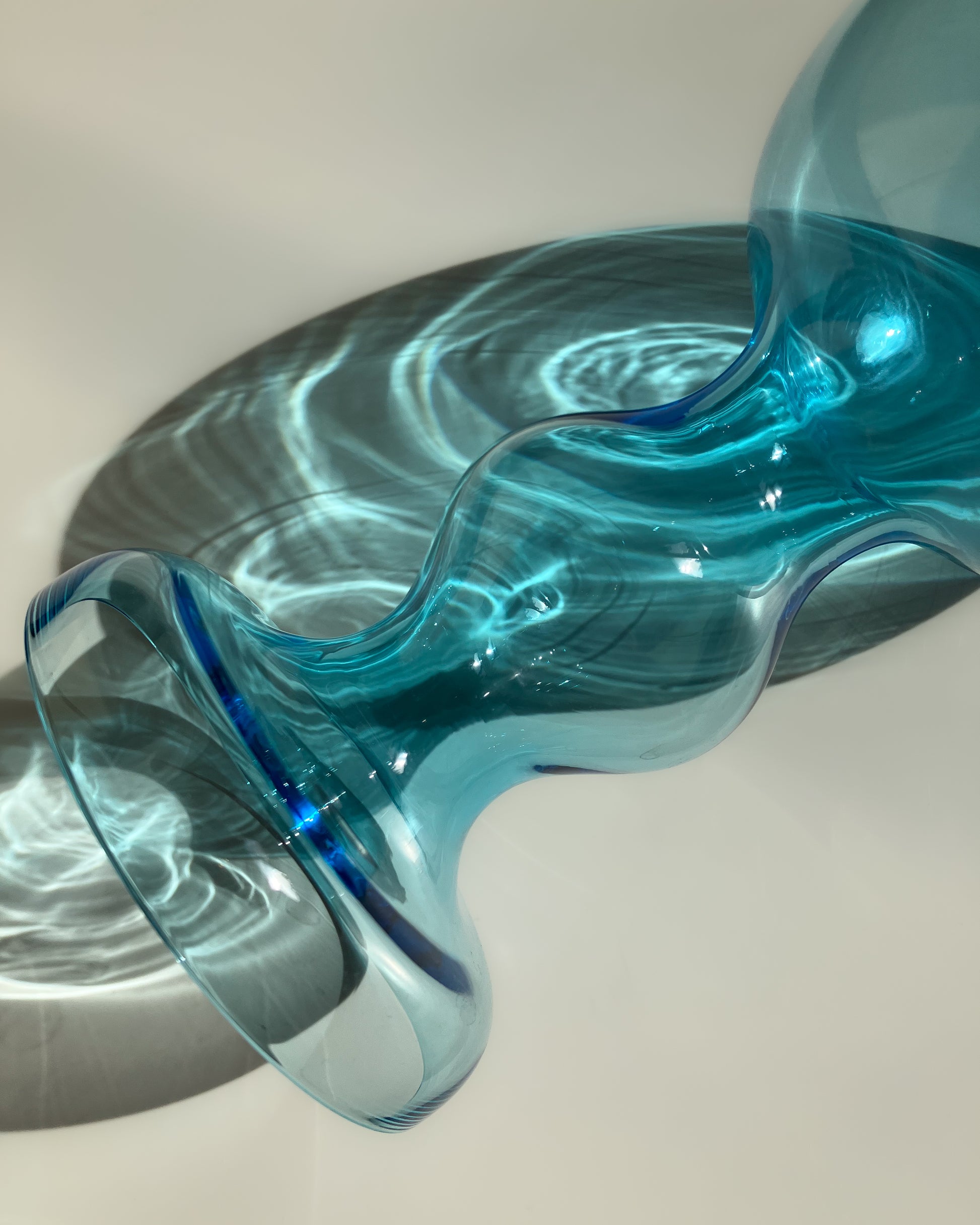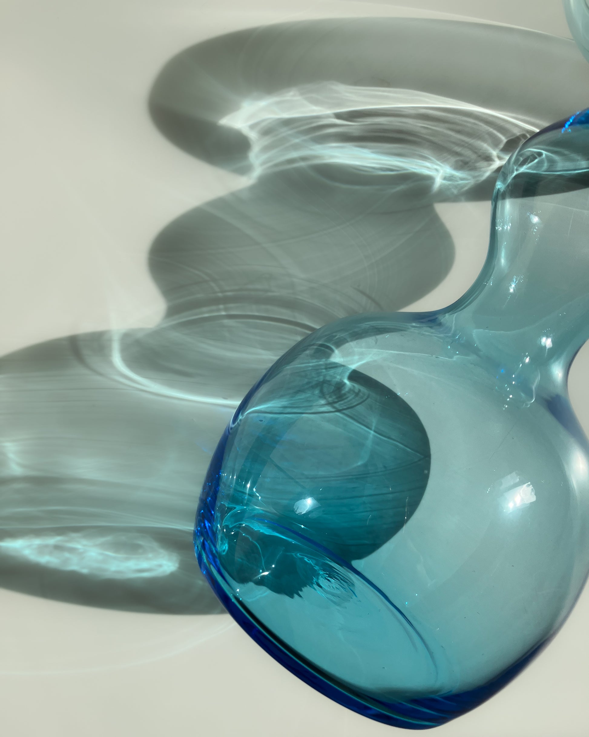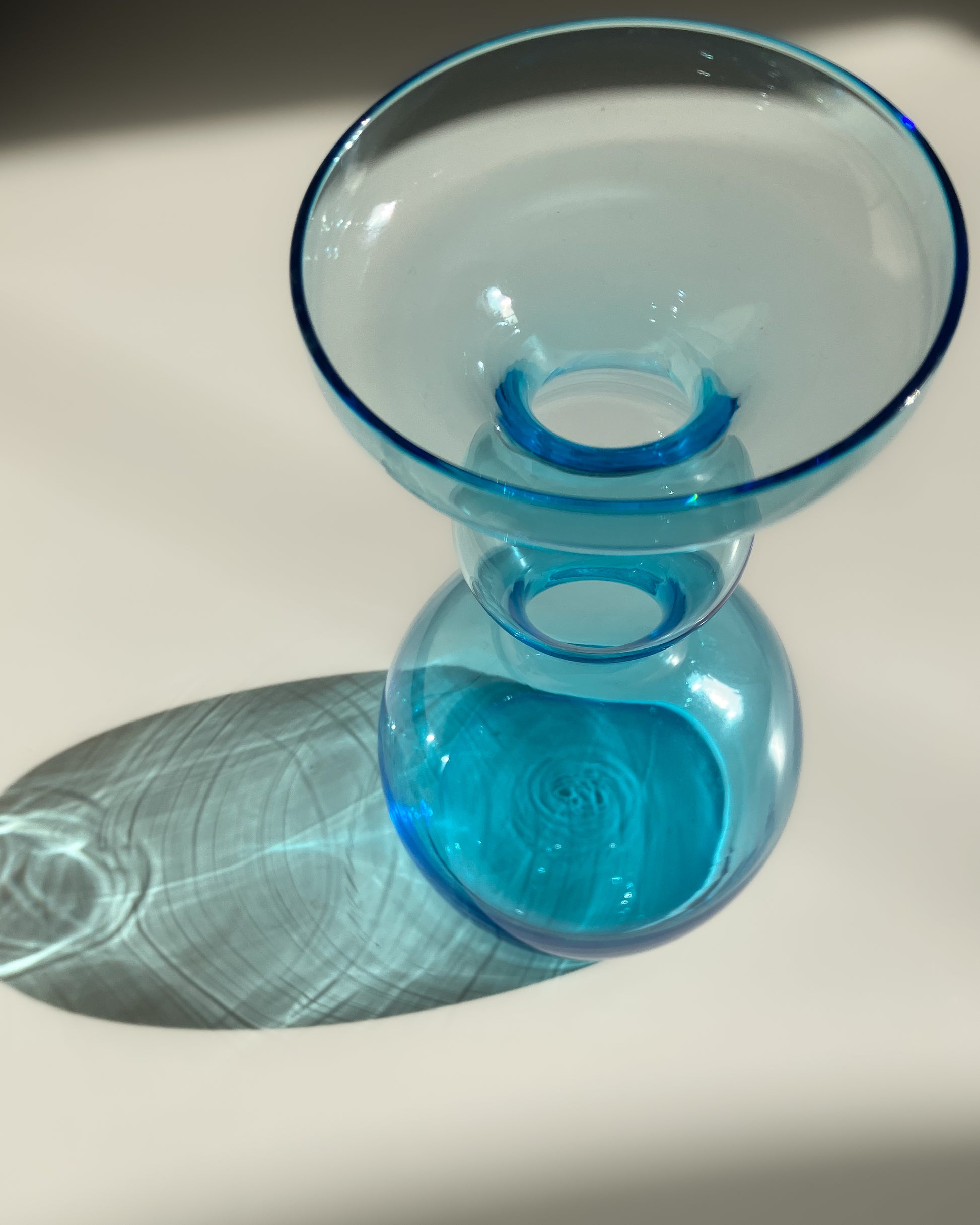 透明感のあるブルー を基調としたガラスベースで、光の角度や強さによって、内部で青色の濃淡が変化し、やわらかな陰影と透明感の奥行きが生まれます。