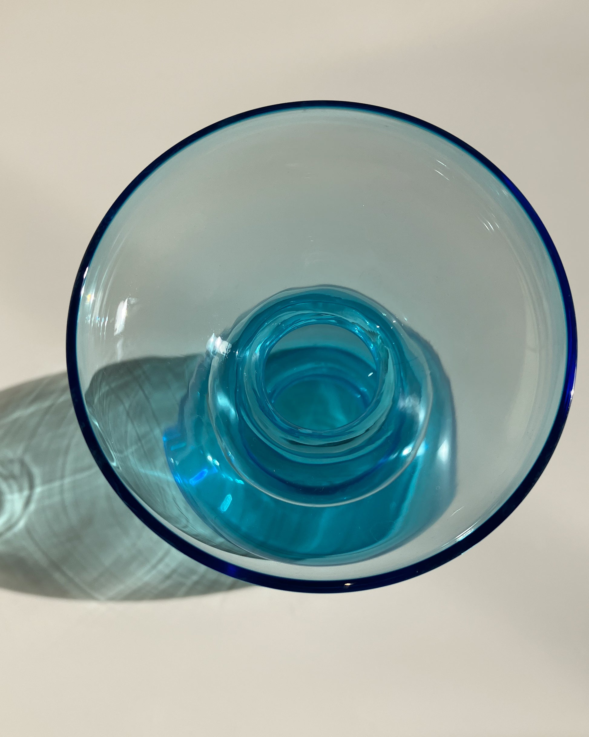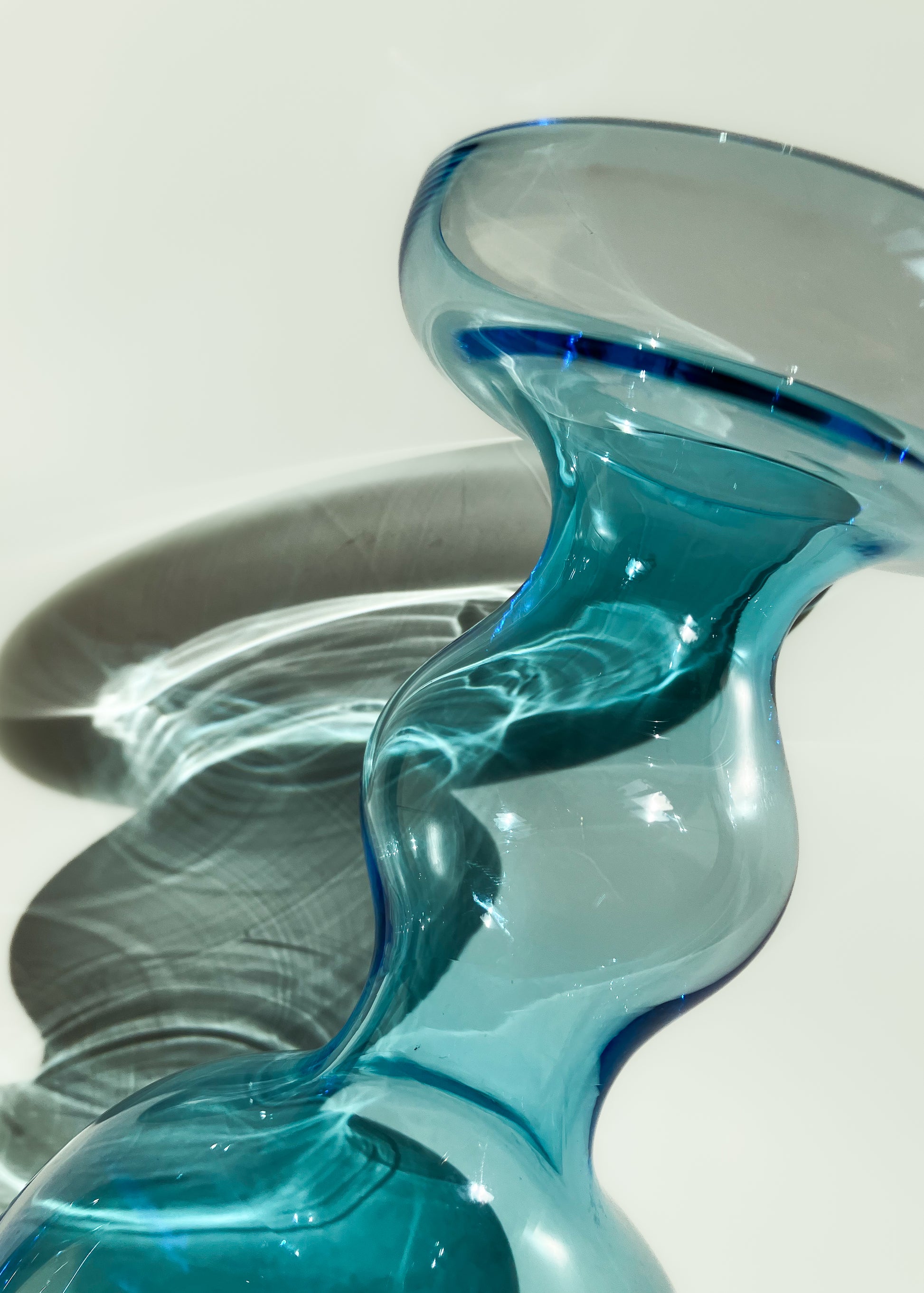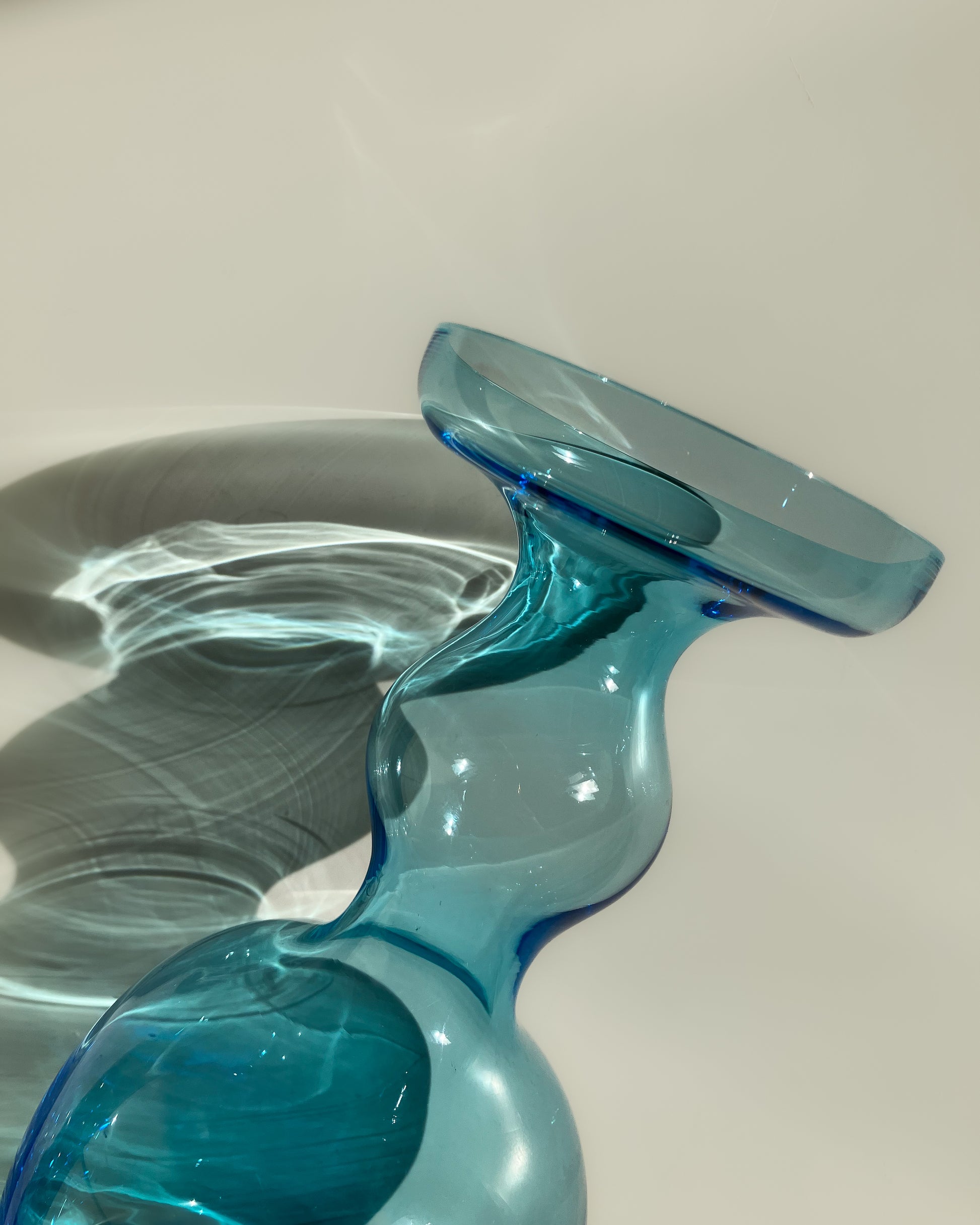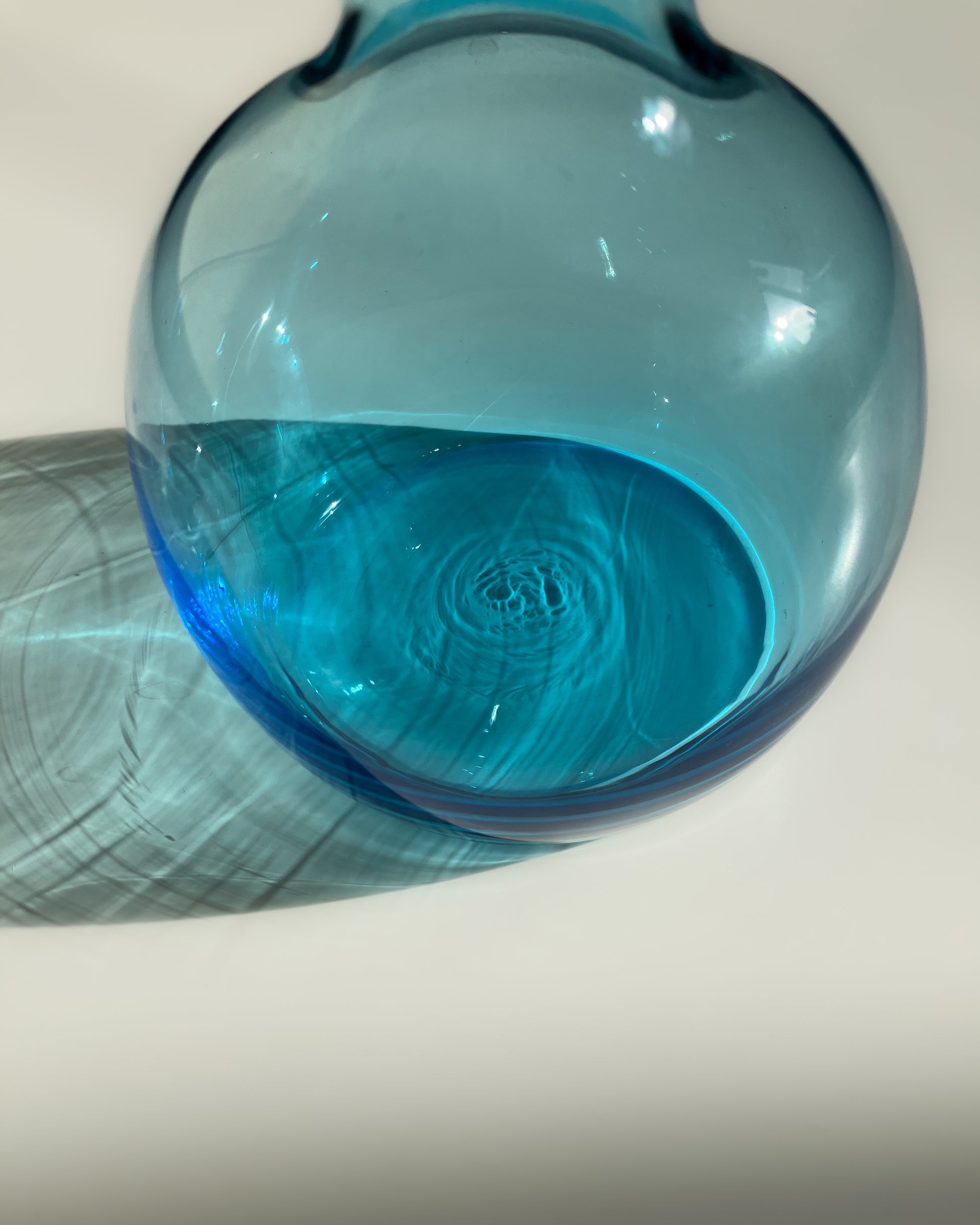 透明感のあるブルー を基調としたガラスベースで、光の角度や強さによって、内部で青色の濃淡が変化し、やわらかな陰影と透明感の奥行きが生まれます。