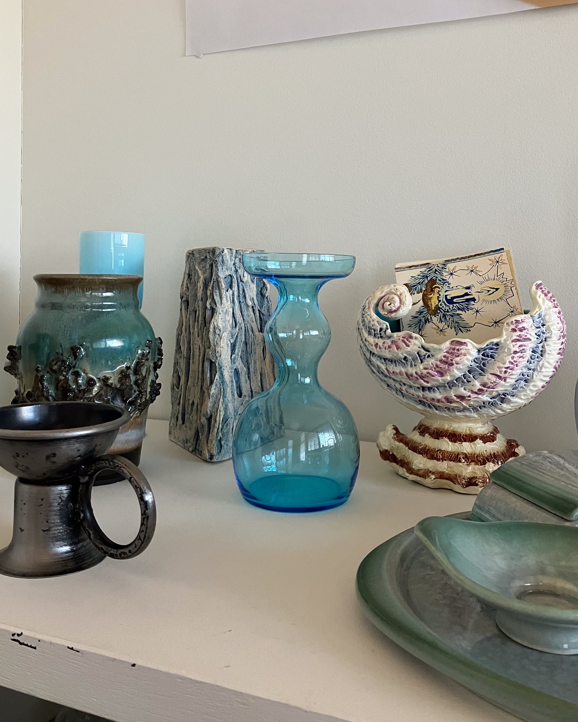 フォルムは、口縁がやや外に開いた穏やかな広がりをもち、胴部へと自然につながるシルエット。表面は滑らかで、装飾を施さずに素材そのものの質感を活かした構成です。シンプルなフォルムとブルーの色調が、光に応じて多様な表情を見せてくれます。