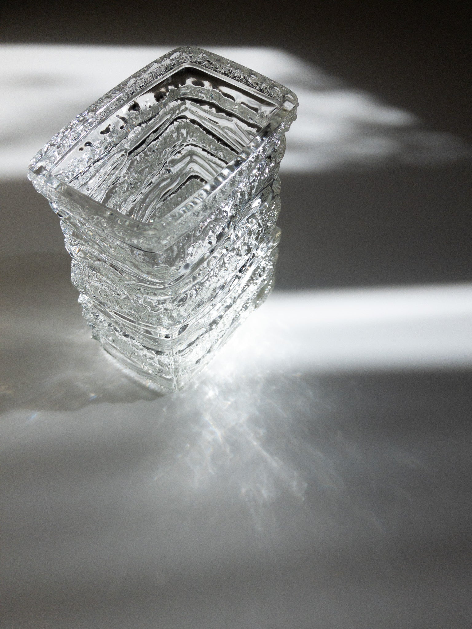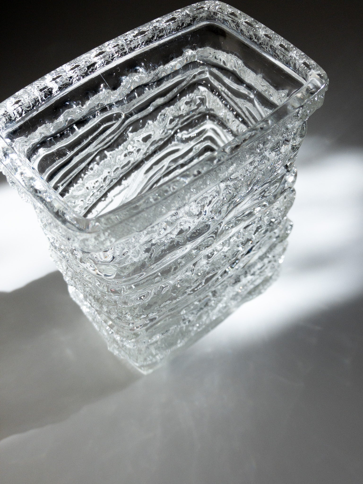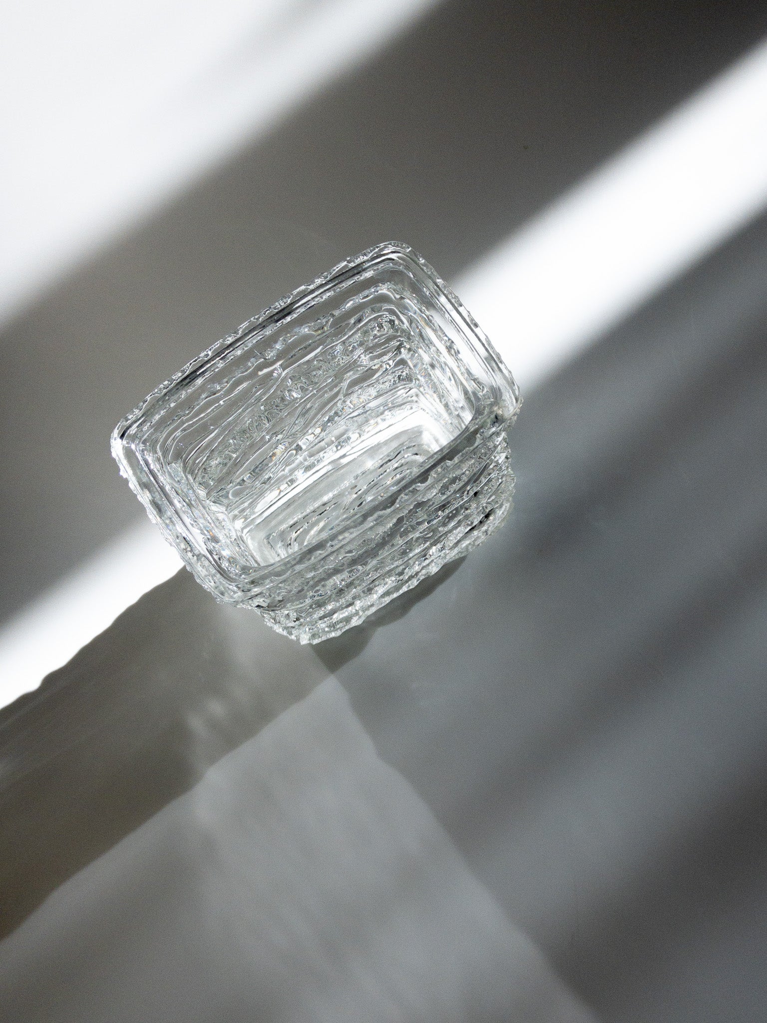 手吹きガラスの技法で製作され、氷が溶けていくような独特の質感を持つ透明な仕上がり。1980年代頃の製品です。シンプルな四角のデザインですが、溶ける氷塊を思わせる個性的な模様。光が当たると、見る角度によって異なる輝きを見せてくれます。