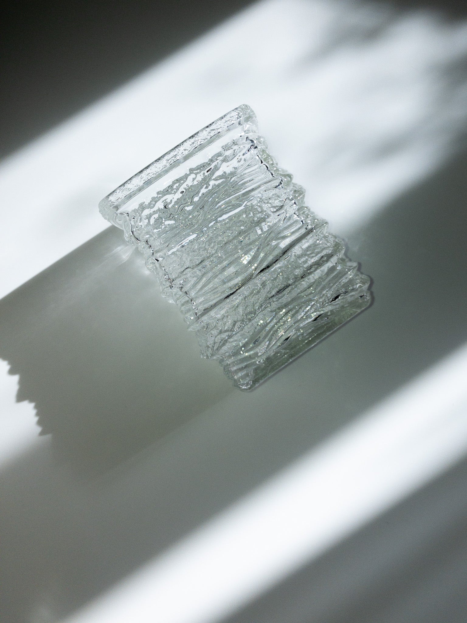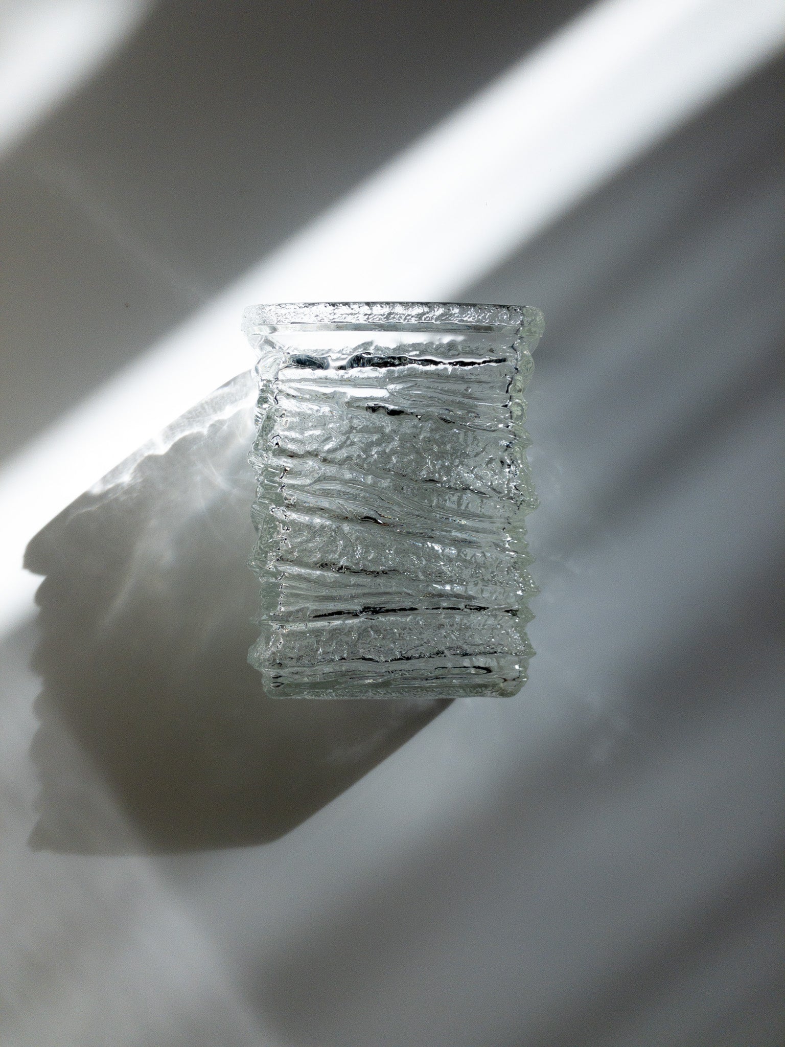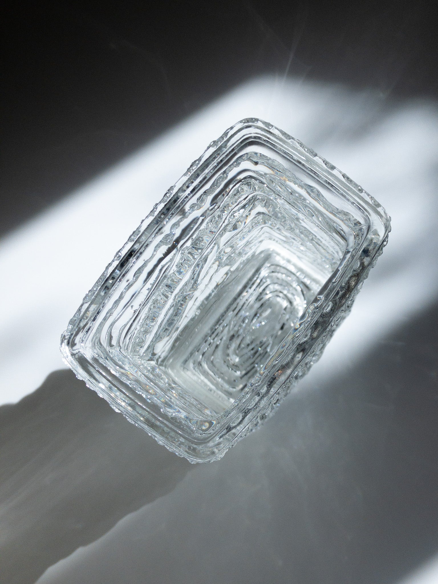 手吹きガラスの技法で製作され、氷が溶けていくような独特の質感を持つ透明な仕上がり。1980年代頃の製品です。シンプルな四角のデザインですが、溶ける氷塊を思わせる個性的な模様。光が当たると、見る角度によって異なる輝きを見せてくれます。
