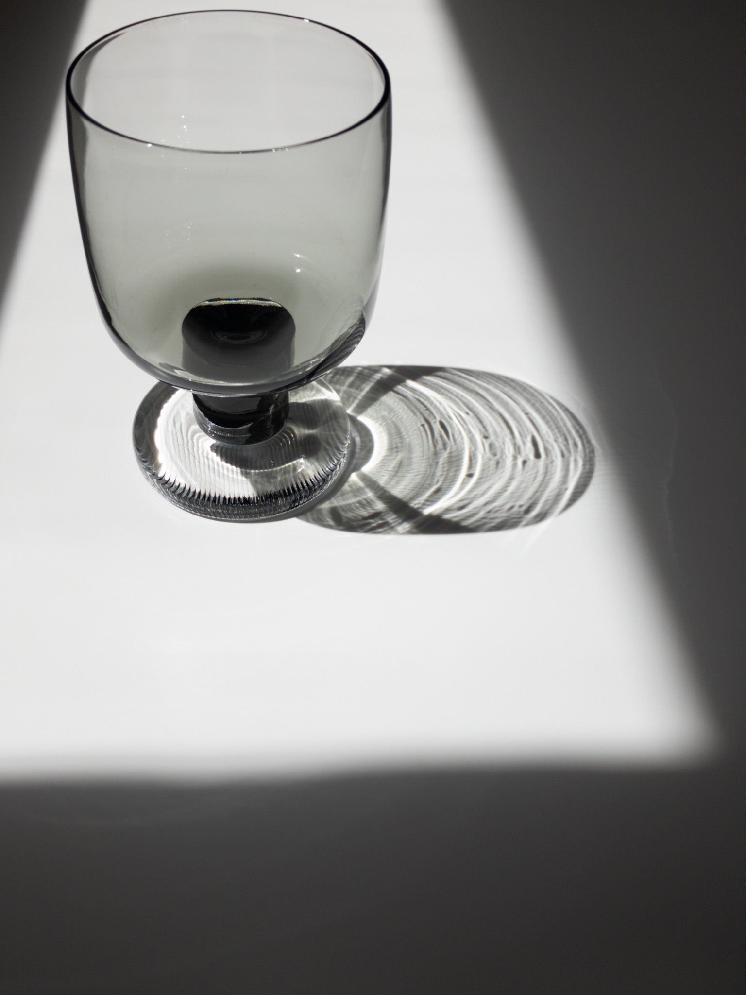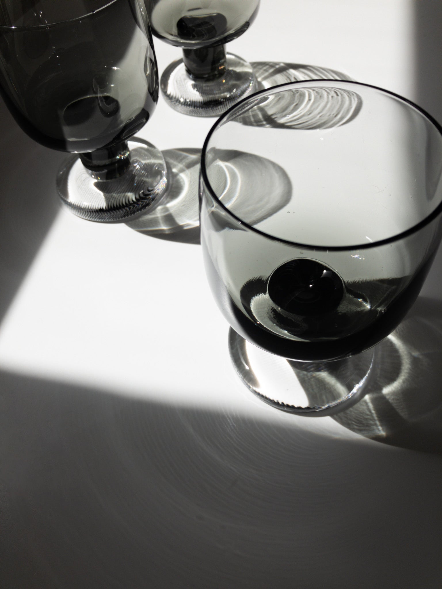 黒みを帯びたスモークガラス、太めのステム、ストライプカットが入ったフット。デザインはKosta Boda(コスタボダ)のトップデザイナーでもあったGöran Wärff(ヨーラン・ヴァルフ)。表示価格は1個単位です。