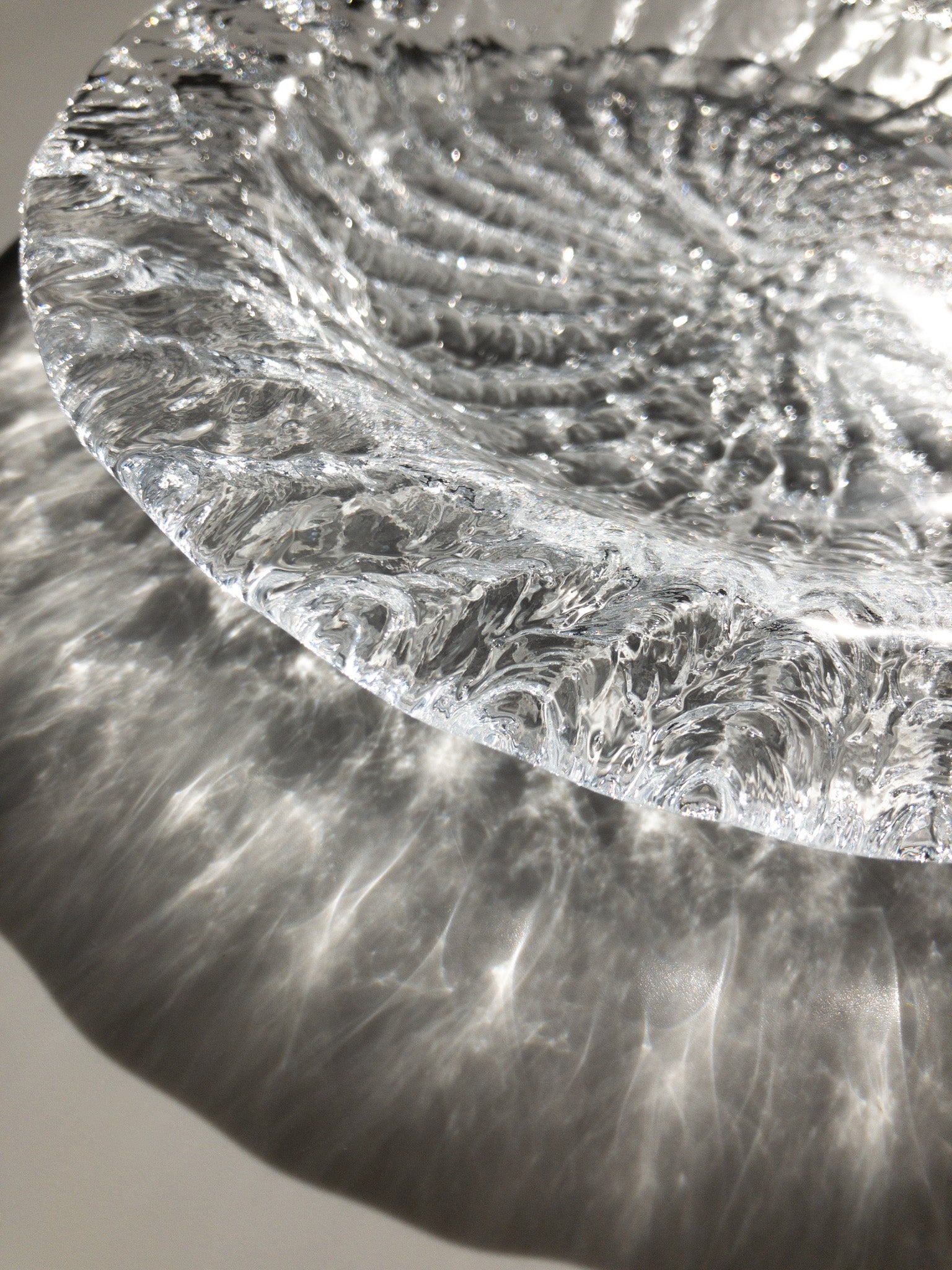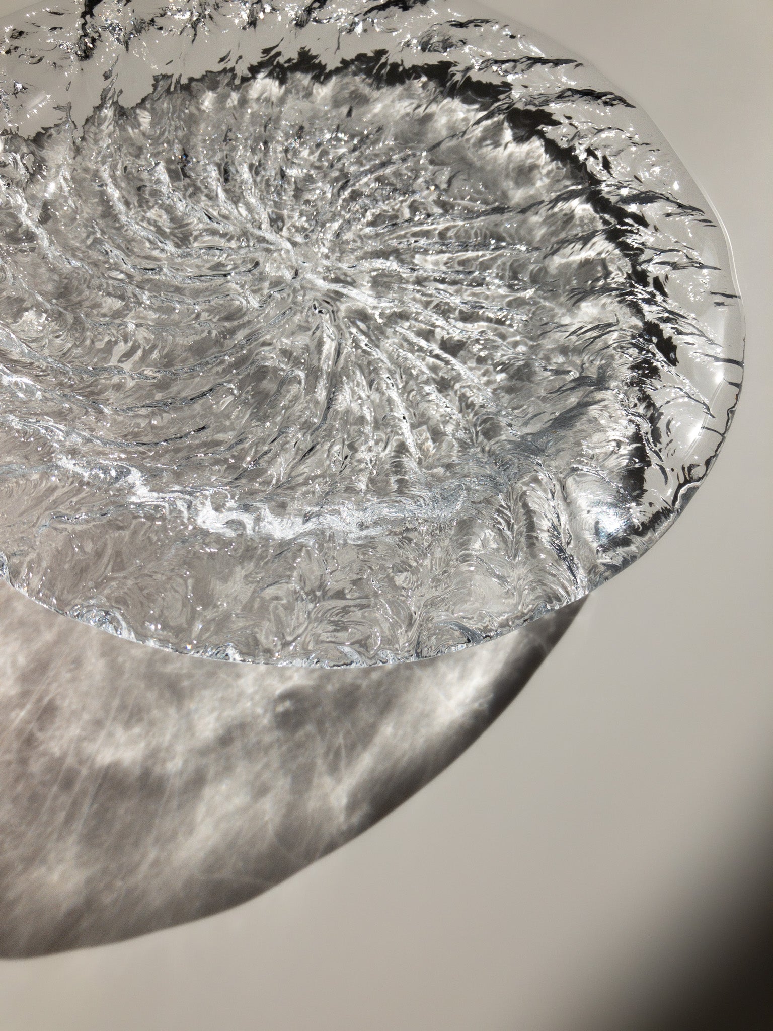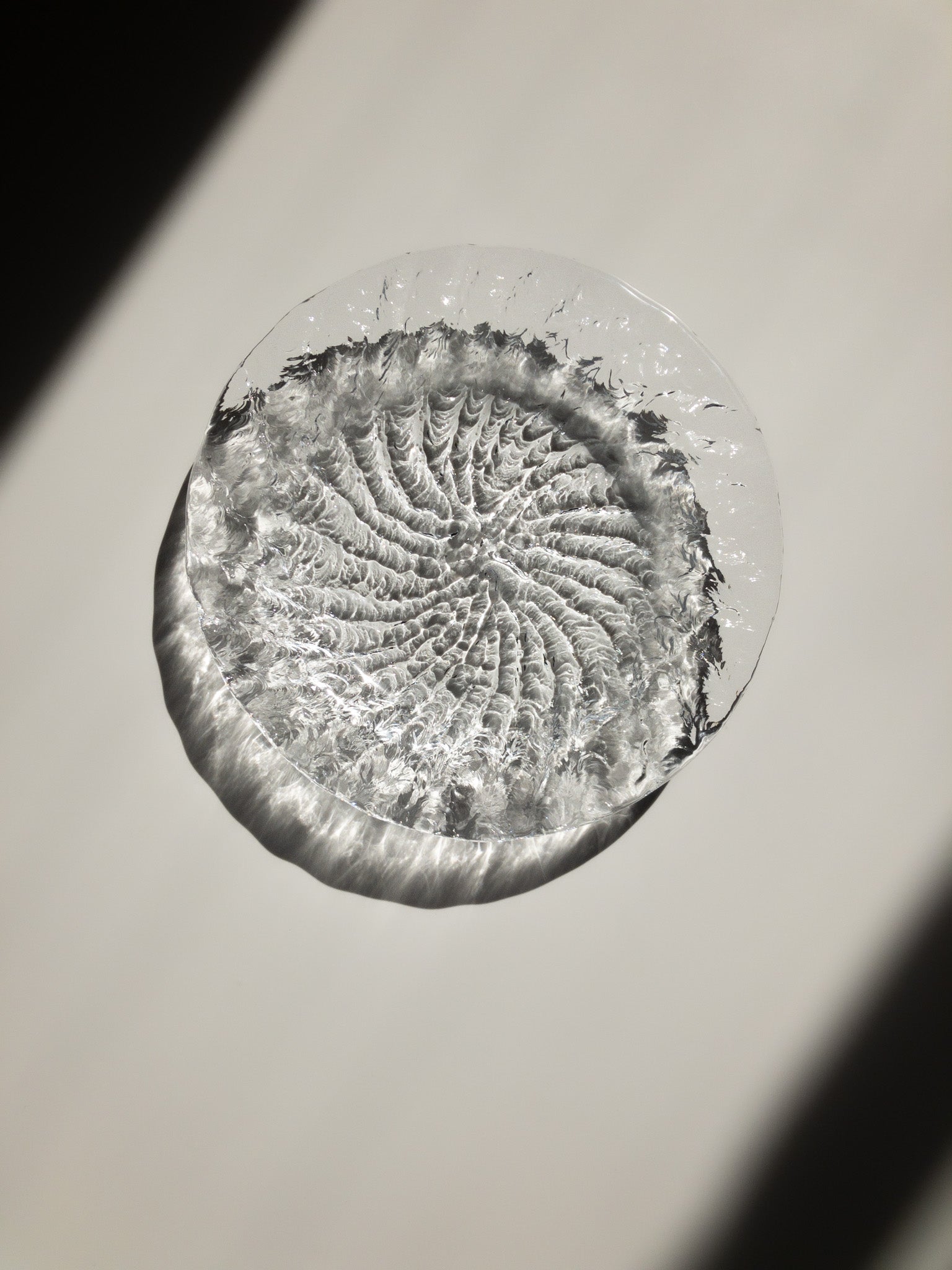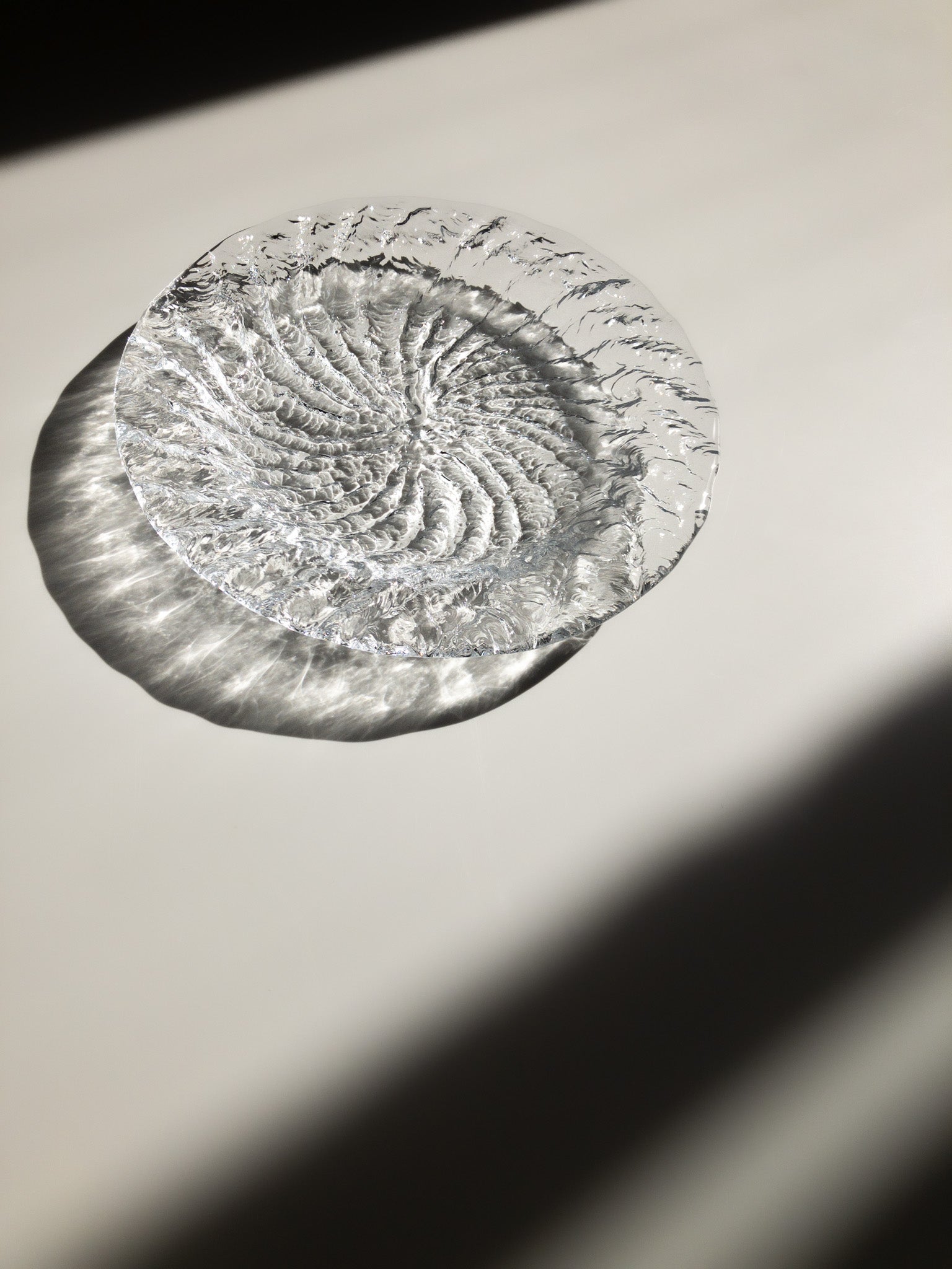 このお皿は遠心鋳造ガラス(centrifugally cast glass)技法を用いて製作されているそうですが、この技法ではガラスが型に注がれ、型の回転により均一に広がることで、滑らかな表面と美しい仕上がりになるそうです。
