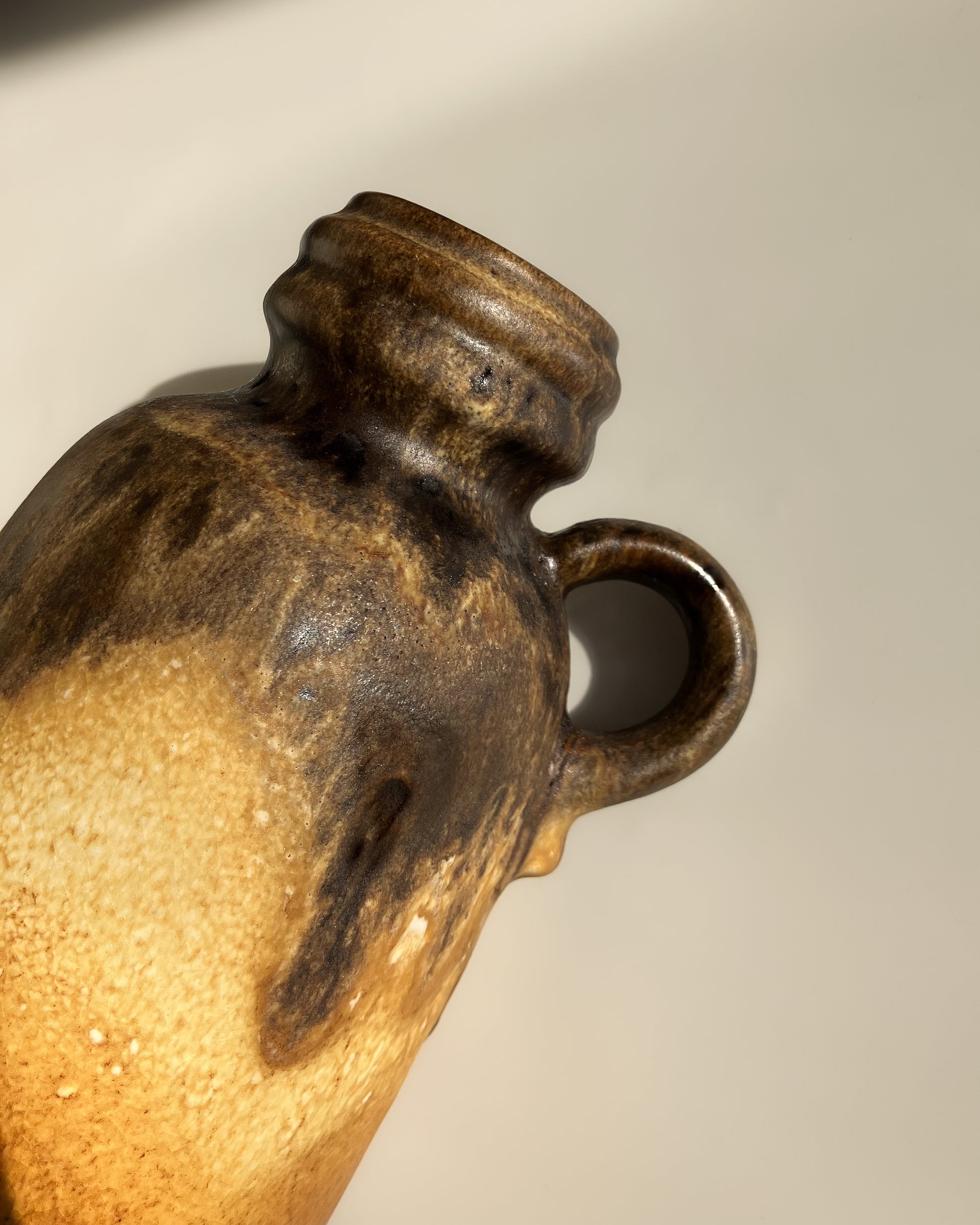 下部にかけては明るいブラウン/ベージュになっていて、肩口付近で深みのあるダークブラウンへと移るグラデーションが見られます。空間に自然と馴染む落ち着いた配色ですが、その中にも視覚的な変化が感じられるFATLAVAらしいデザイン。413のモデルはハンドルが付いており、装飾性を抑えつつ機能に即した形になっています。