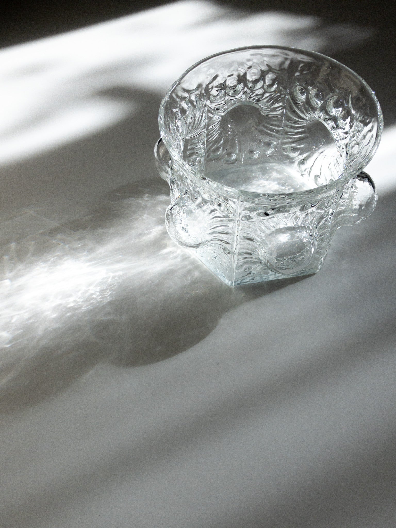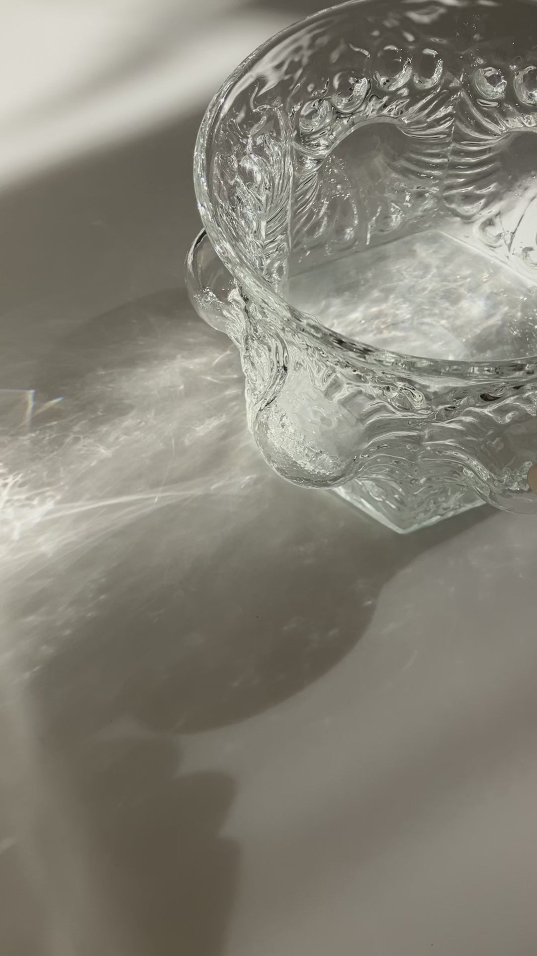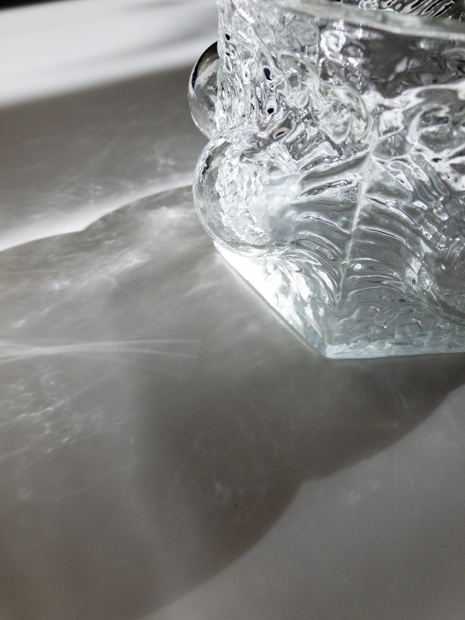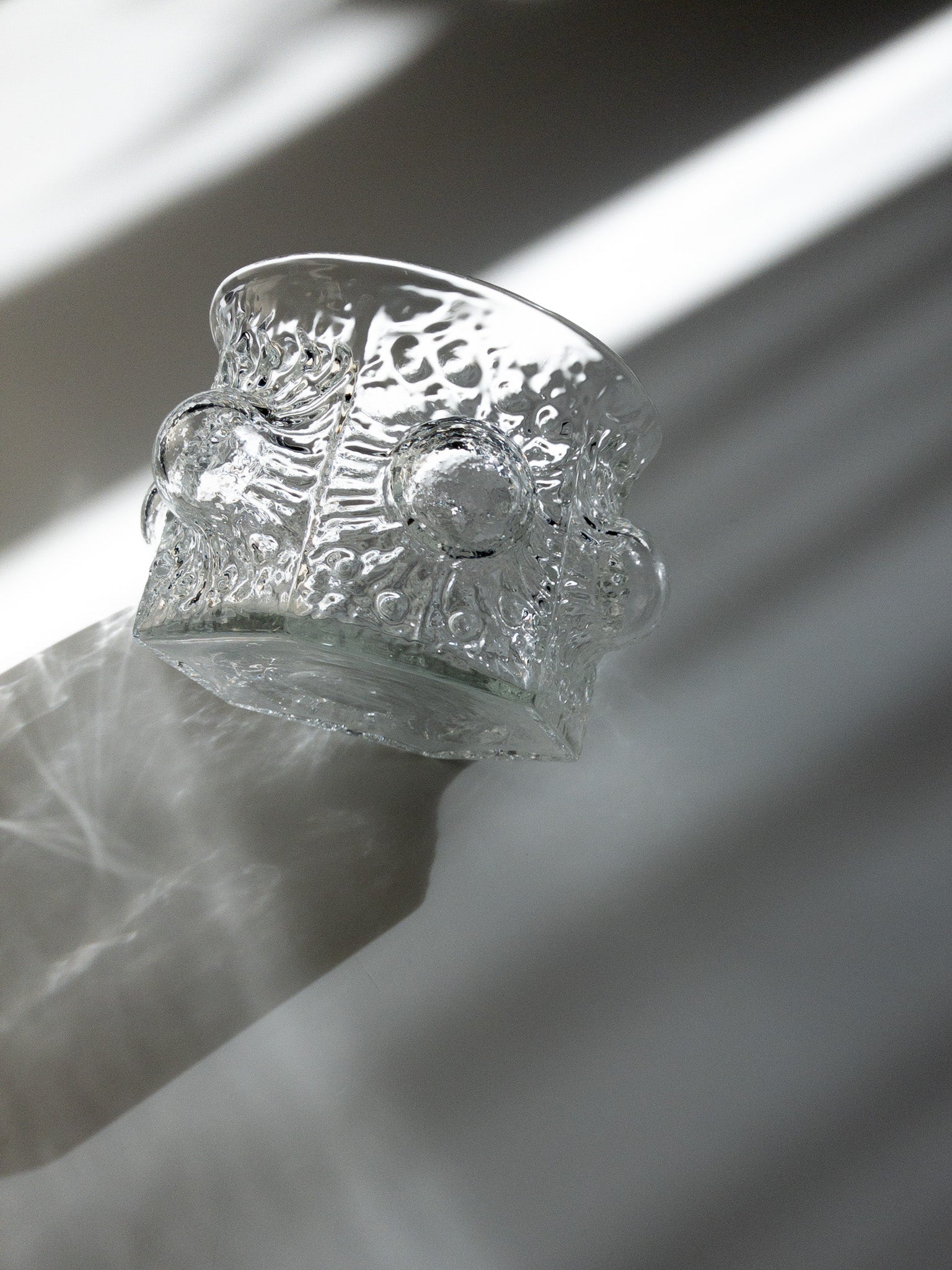 ブルータリスト・ガラスは、1950年代から1970年代にかけて流行したブルータリズム建築様式に影響を受けたデザイン。ブルータリズムは、粗削りで無骨な素材感を強調する特徴があり、この思想が北欧ガラスデザインにも応用されていたよう。気泡や不規則な模様、手作業によるテクスチャーがユニークに表現され、通常のガラスよりも力強く、質感を重視した仕上がりです。