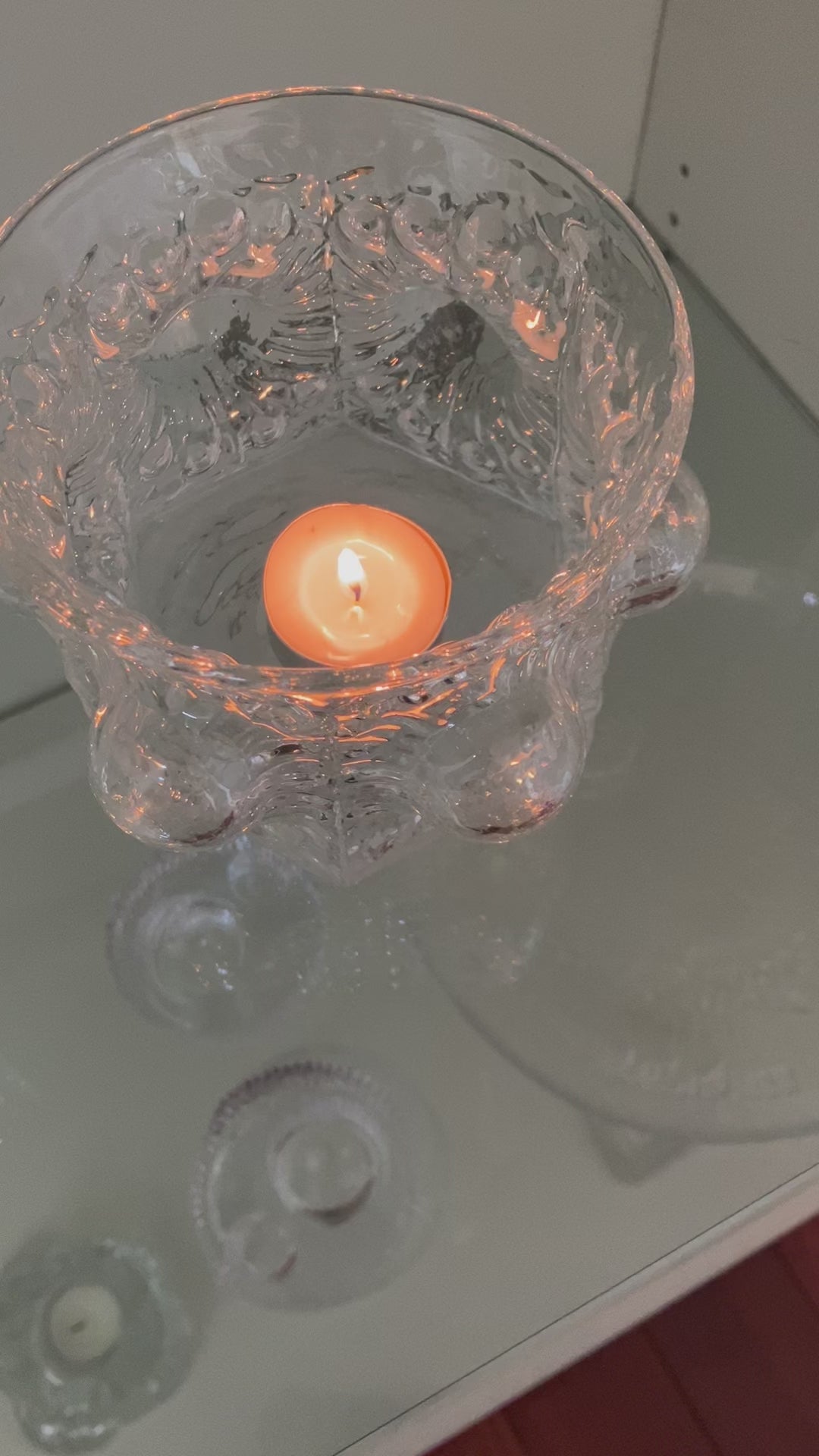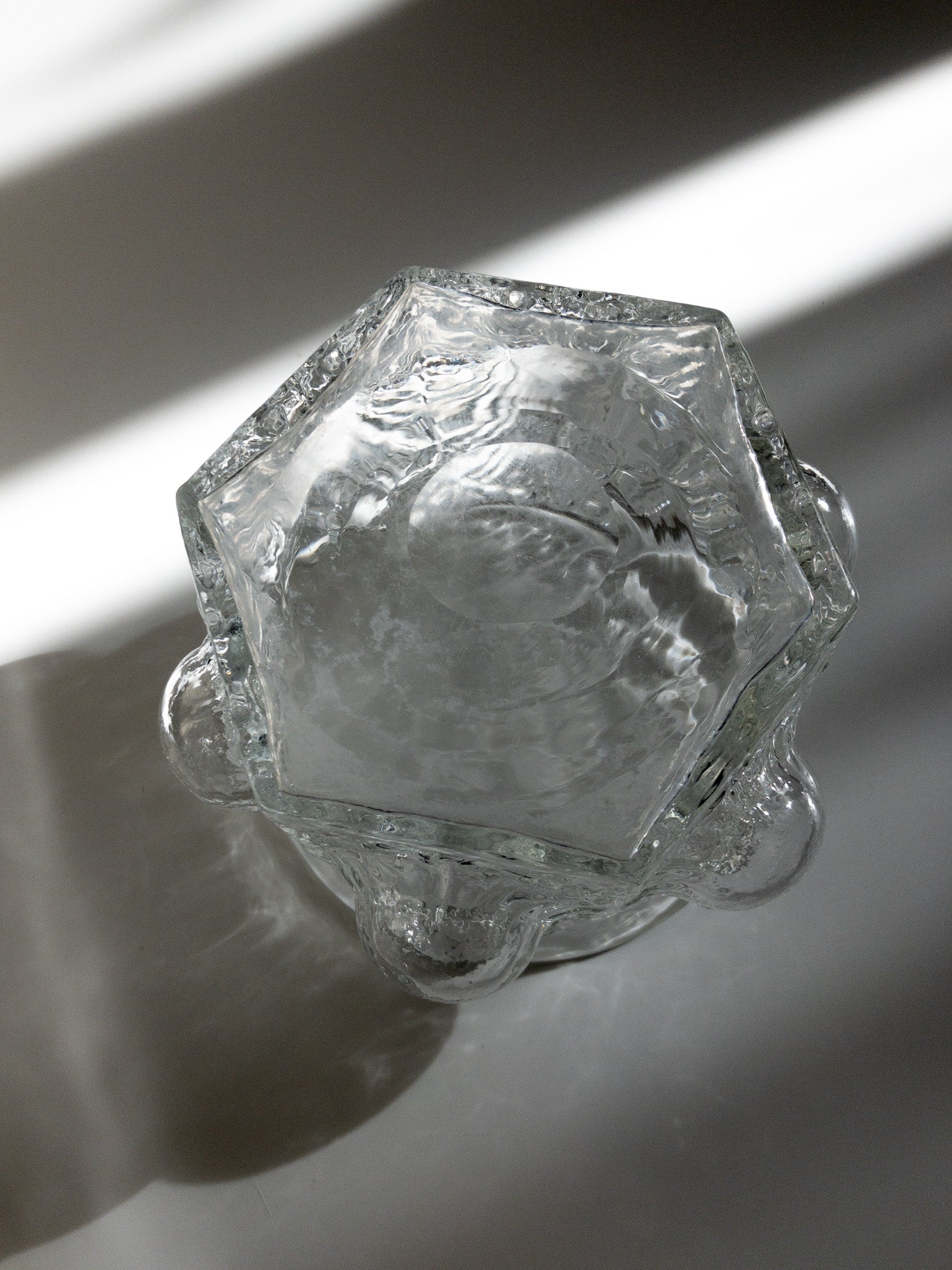 スウェーデン、Sea Glasbruk(シー・グラスブリュック/現在はOrrefors Kosta Boda, Inc.の一部)社より、ガラスの花瓶兼キャンドルホルダー。1970年代、Rune Strand(ルーネ・ストランド)によるデザイン。抽象的な気泡のレリーフを施したブルータリスト・ガラスです。