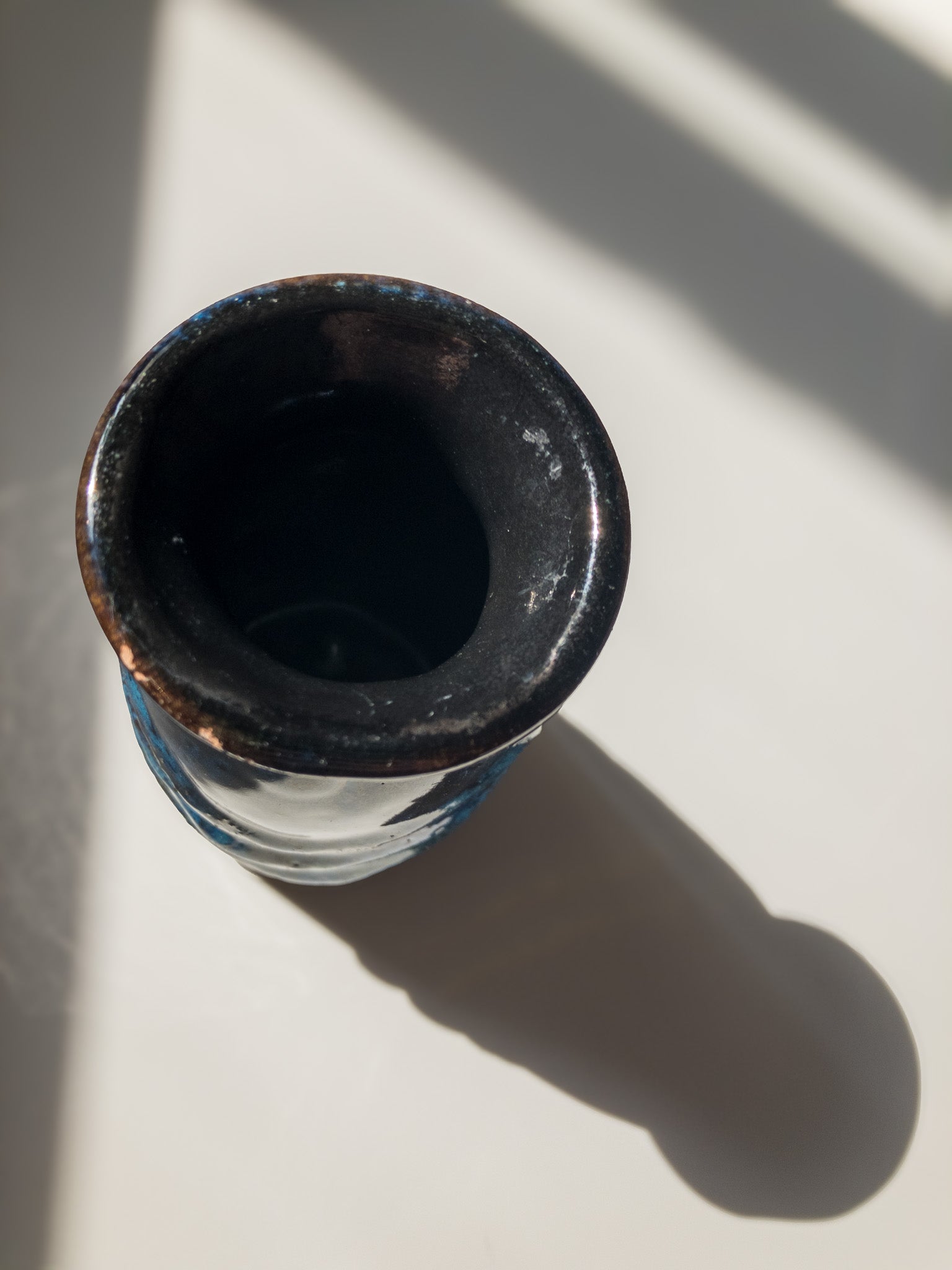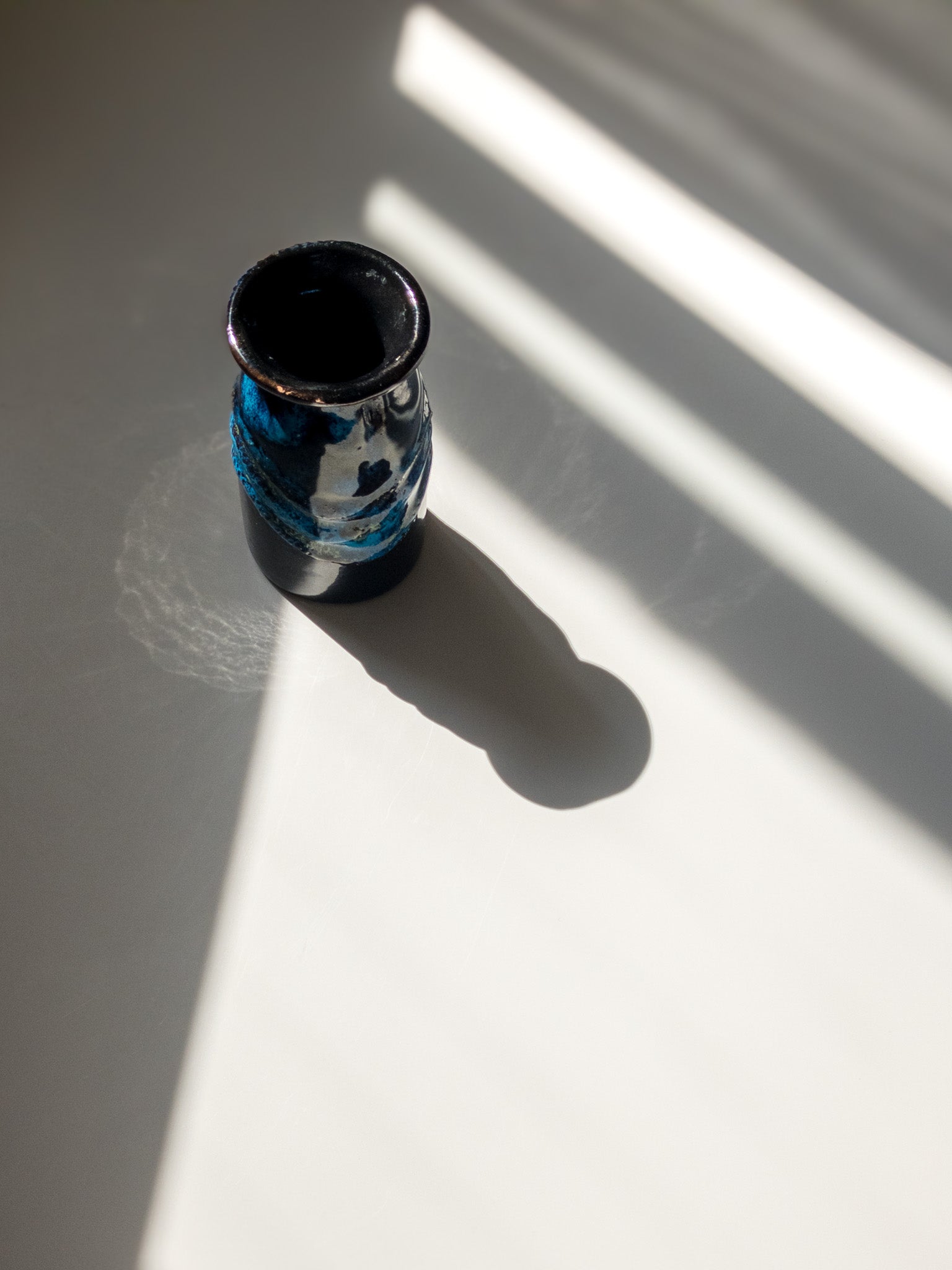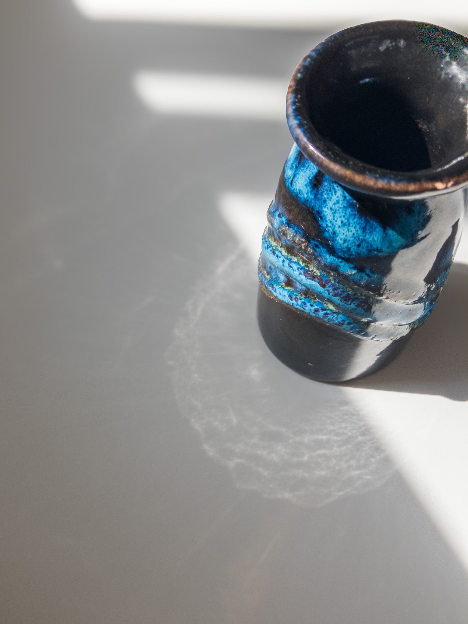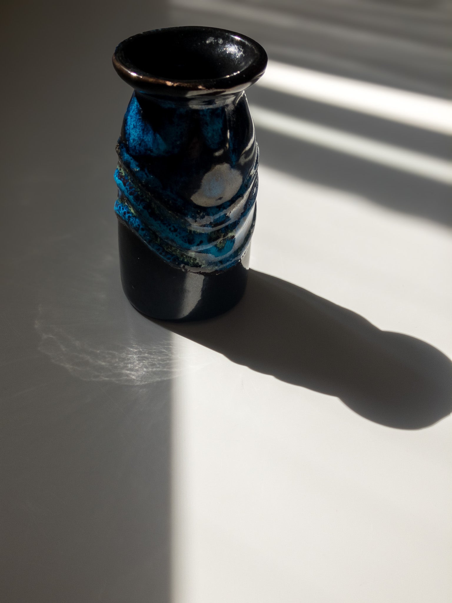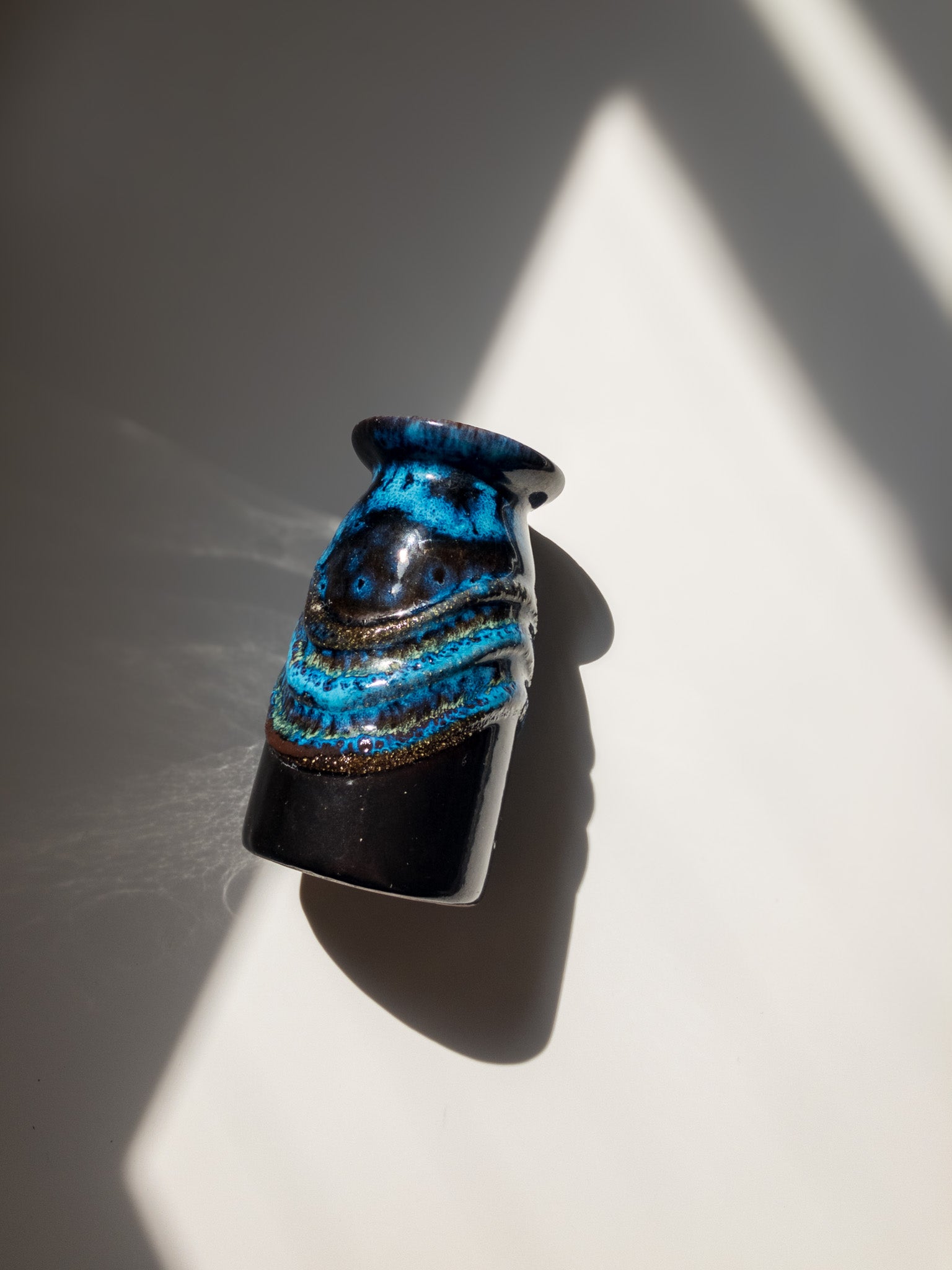 東ドイツStrehla Keramik(シュトレーラ ケラミック)より、高さ10cmほどの小さな花瓶です。 深い茶色のボディに鮮烈な青のFATLAVAグレーズ。1960年台〜1970年台に製造されたもののようです。そのころのStrehela製品はほとんどが輸出されてしまったため、ドイツ国内では西ドイツの花瓶よりも見つけるのが困難になっているそう。