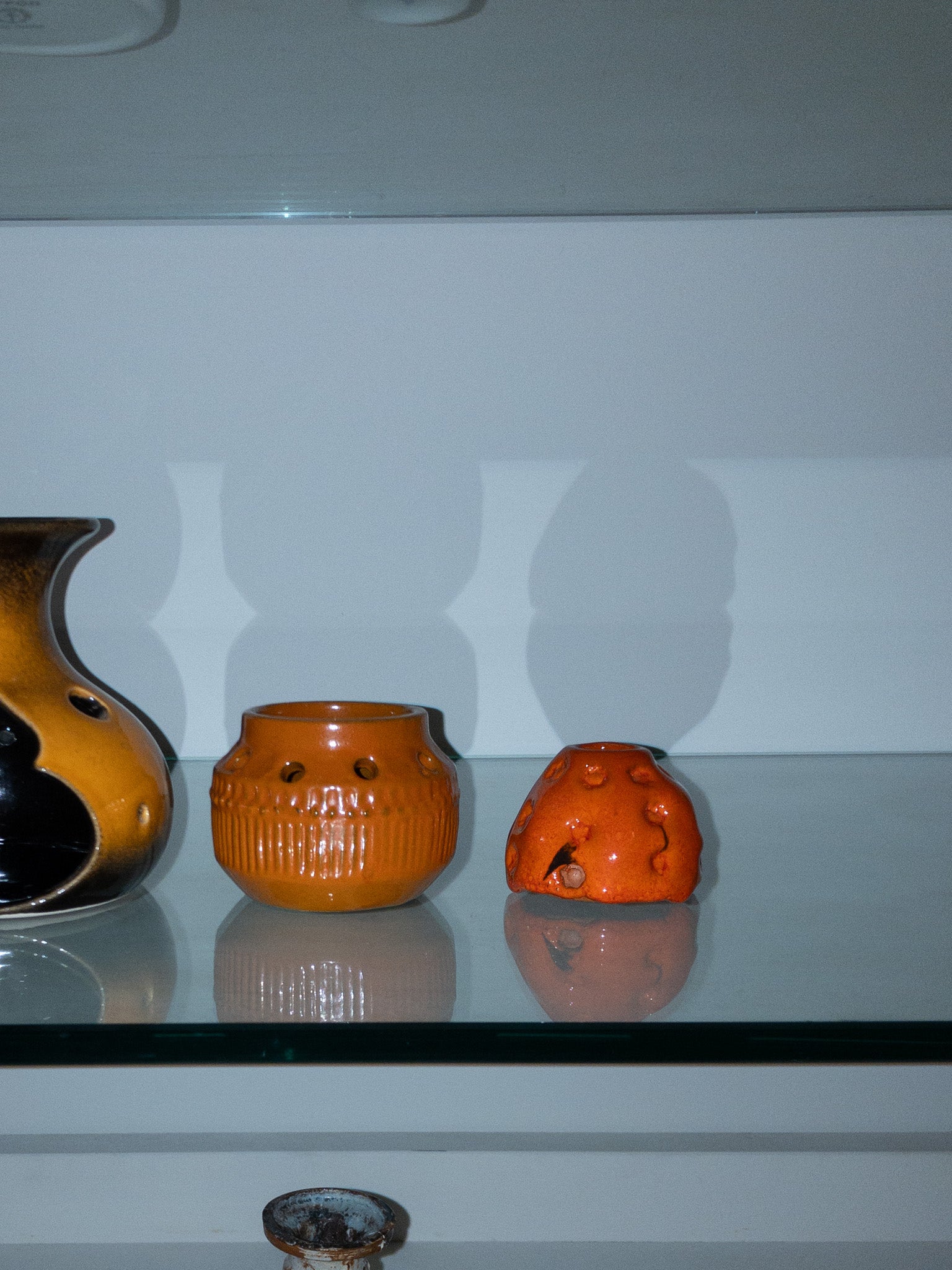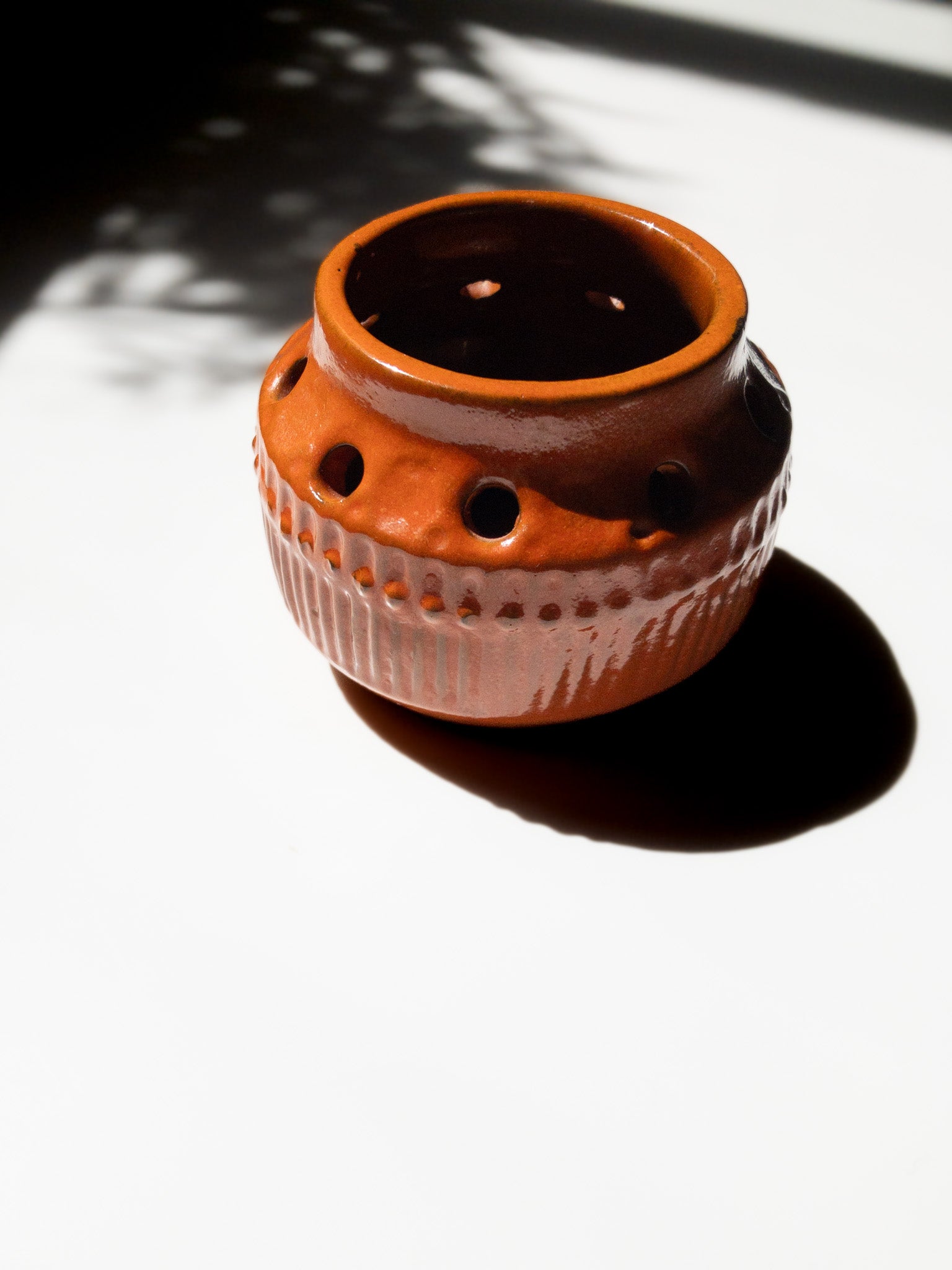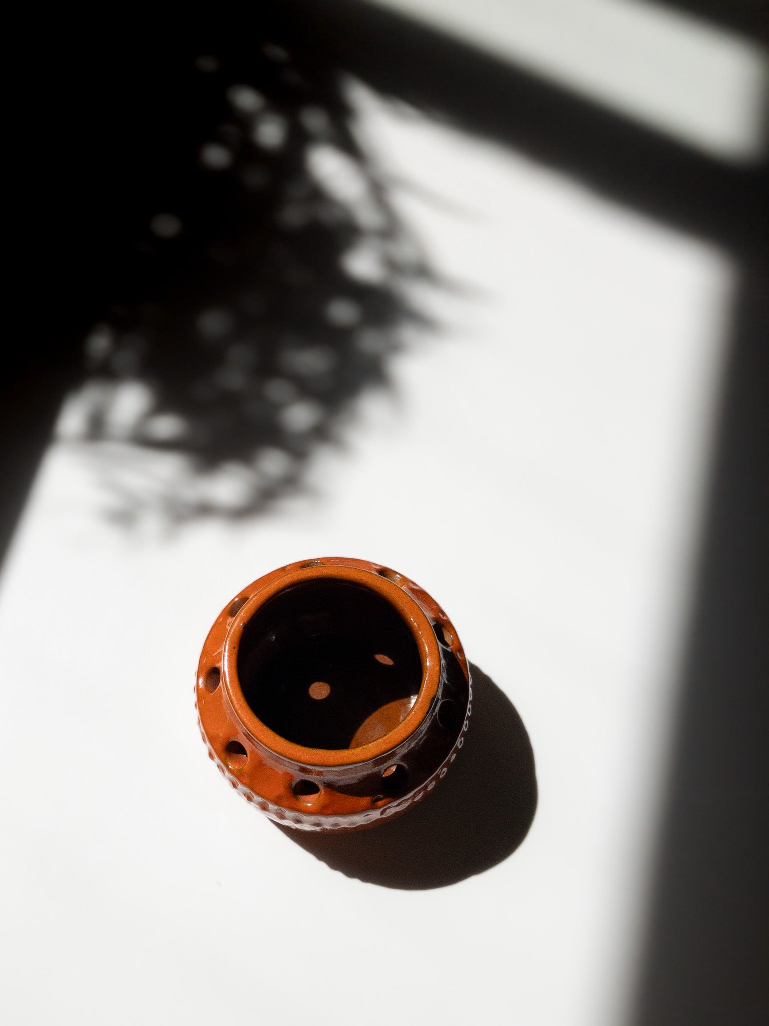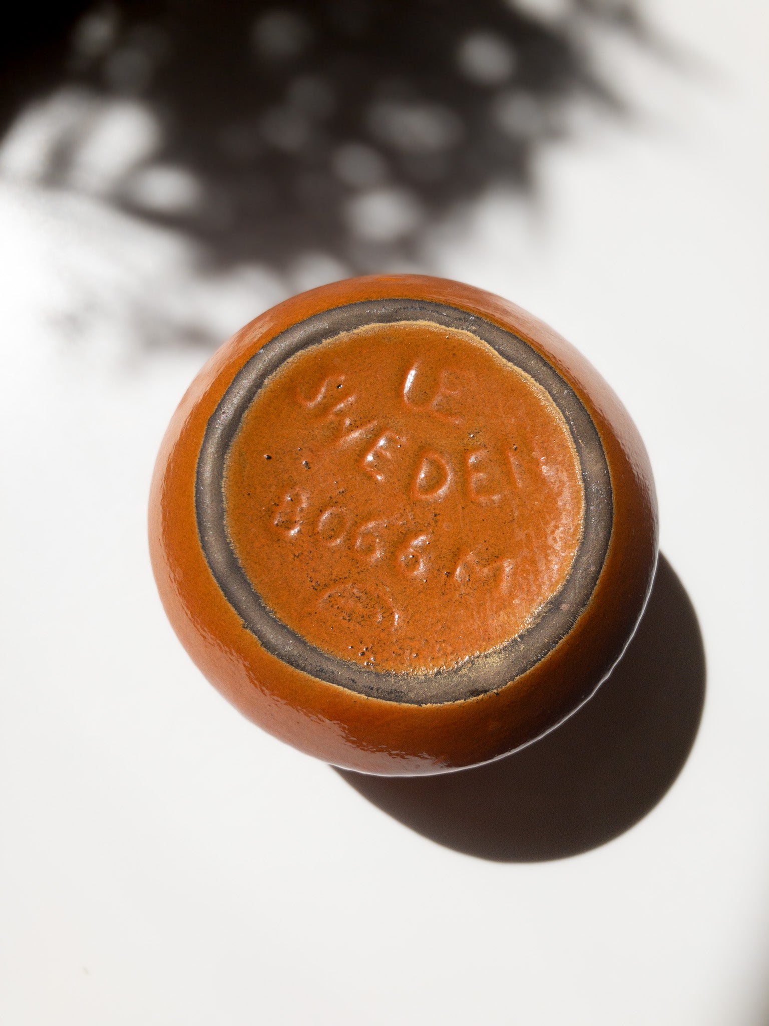 Simmulsonは色彩感覚に優れ、暗色の素地に鮮やかな色彩を施すというコントラストを好み、独自の世界観を築きました。こちらもベースは暗い焦茶色で、その上から明るいオレンジの釉薬を塗っているようで、派手すぎず温かみのある、落ち着いた独特の風合いに仕上がっています。