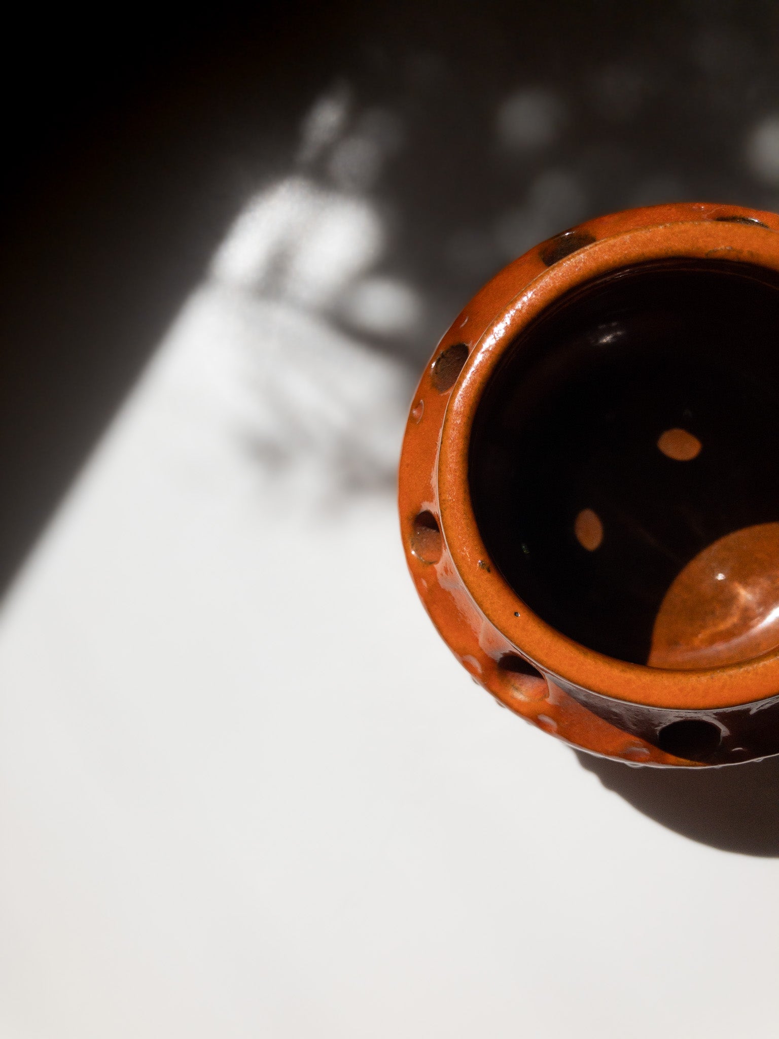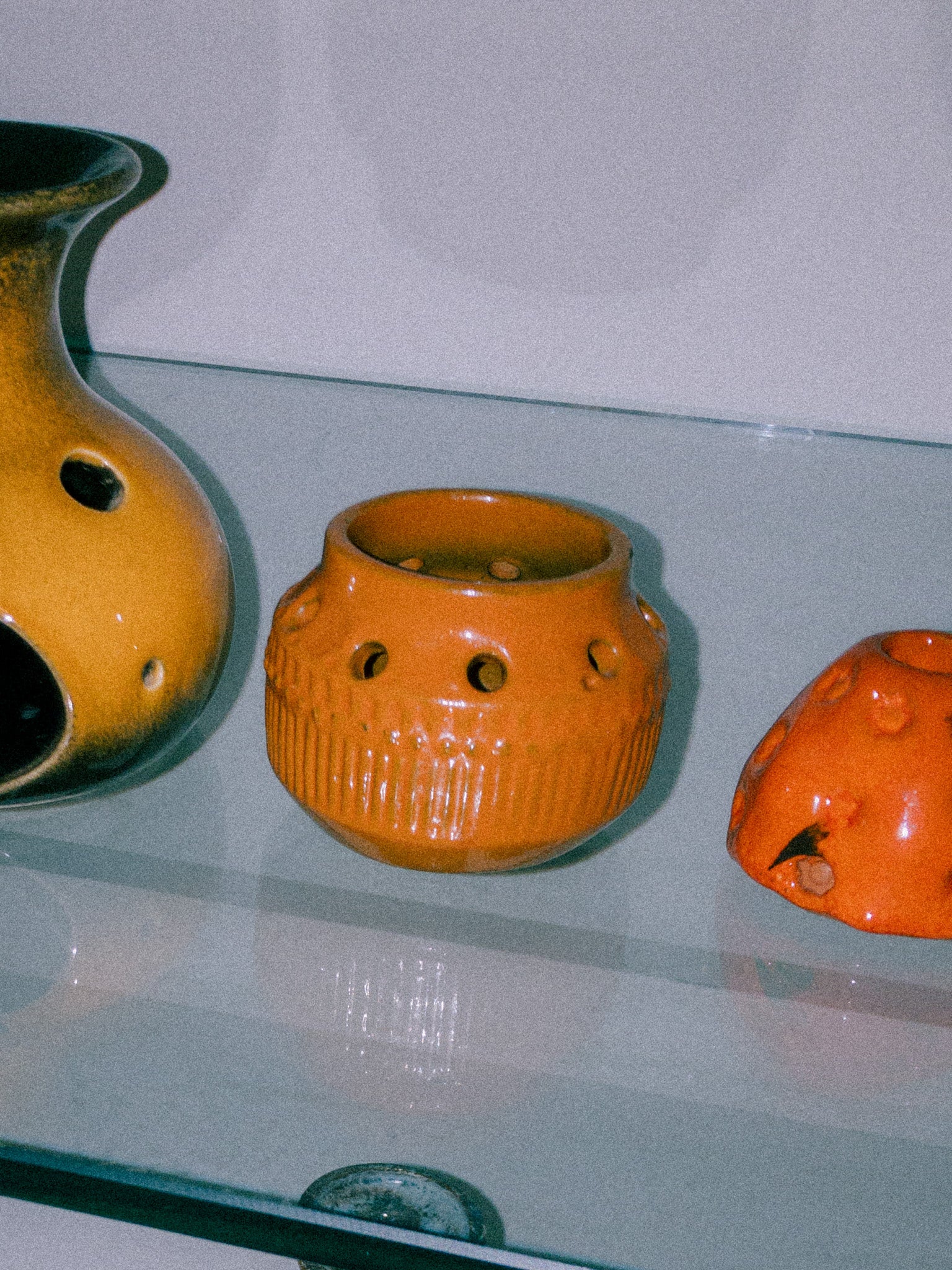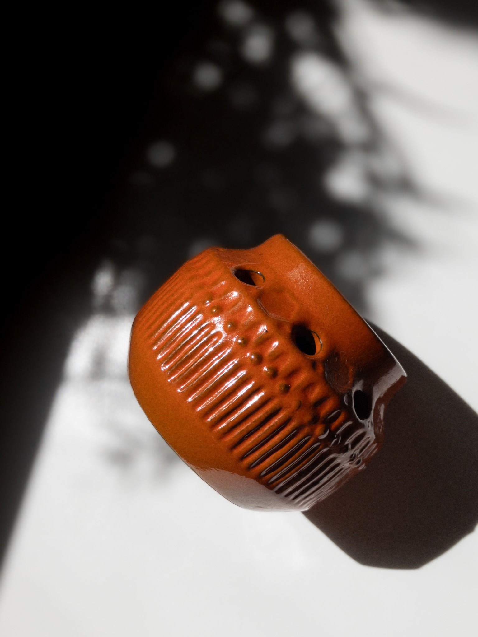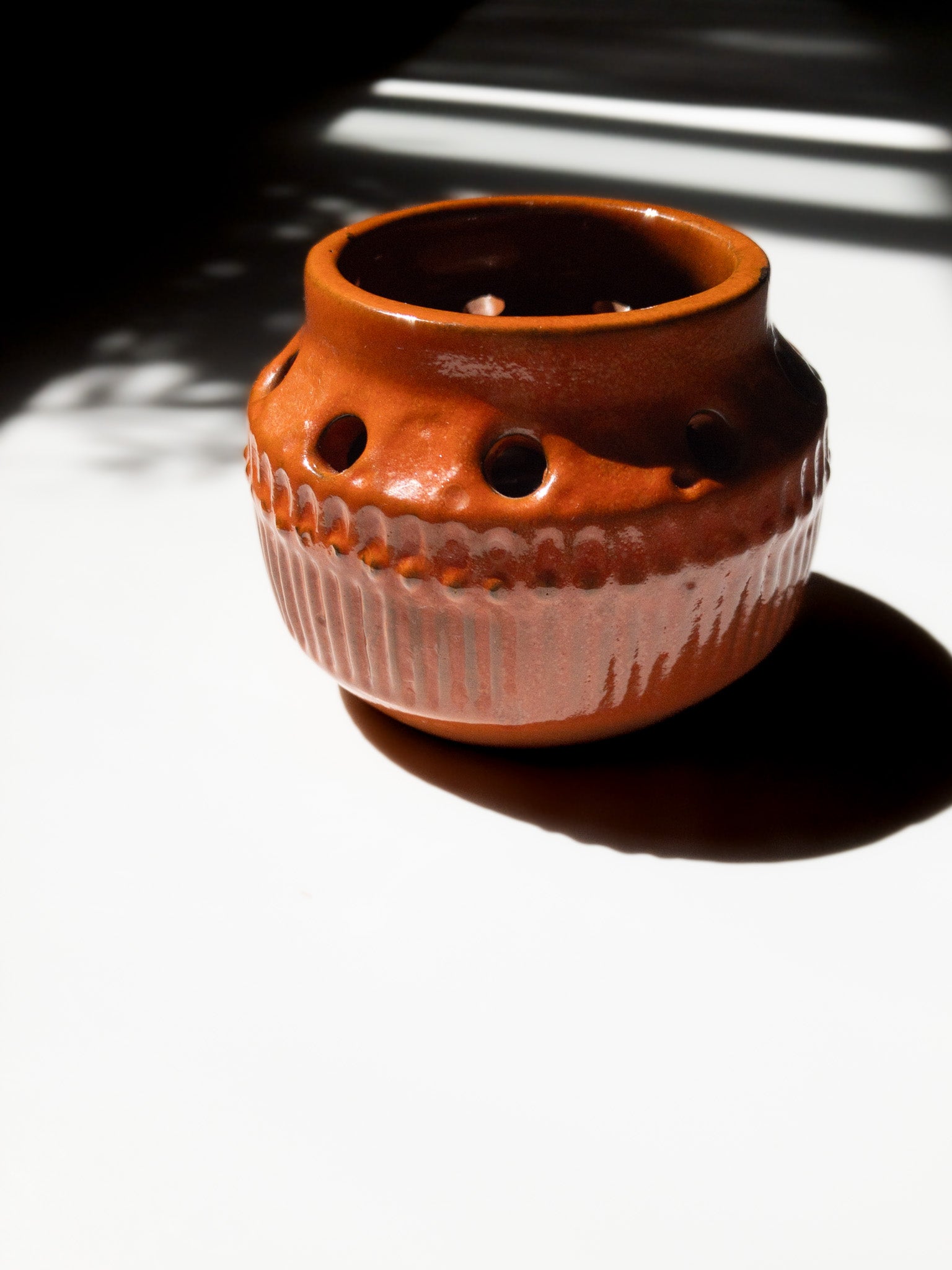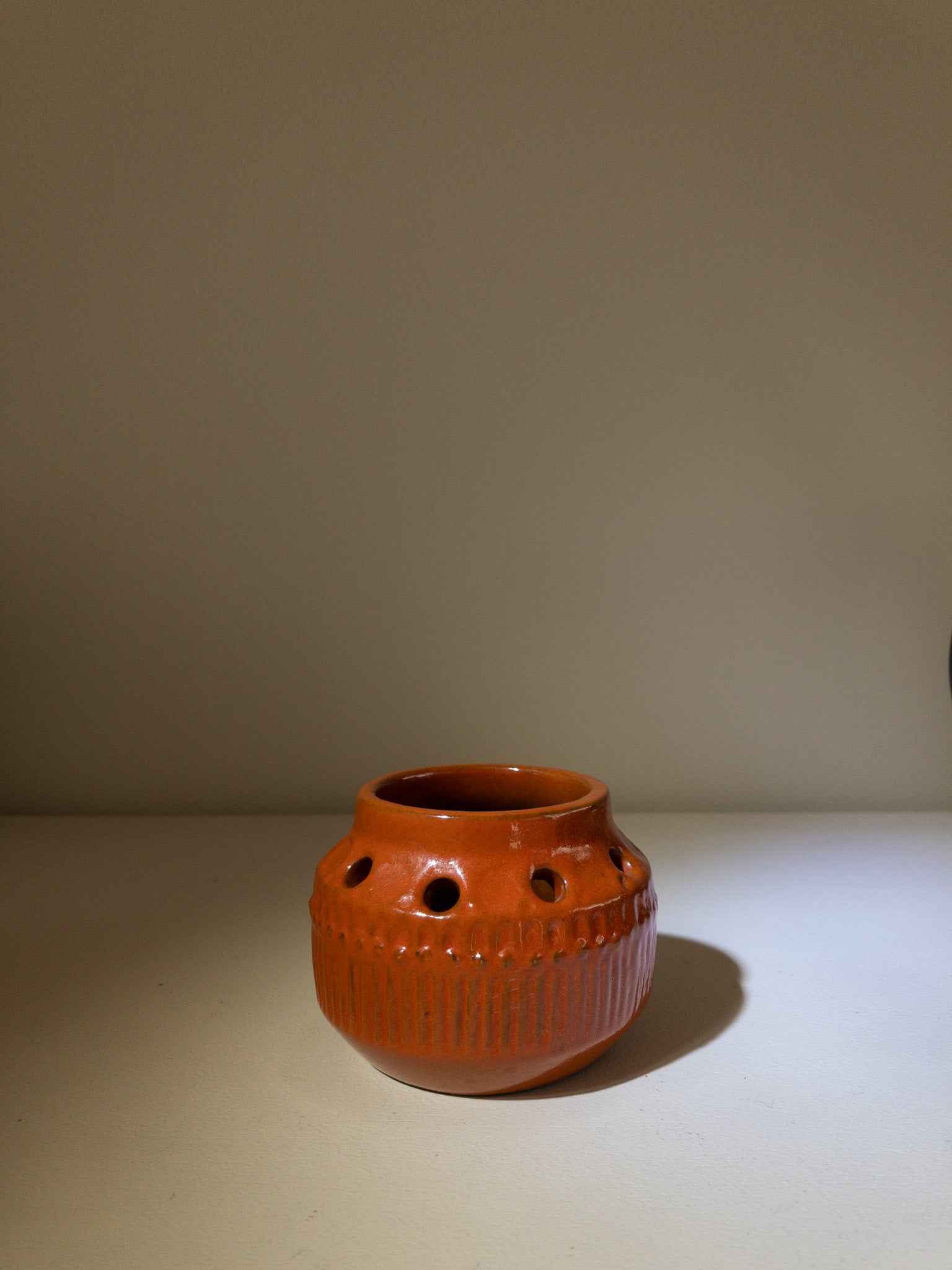 Simmulsonは色彩感覚に優れ、暗色の素地に鮮やかな色彩を施すというコントラストを好み、独自の世界観を築きました。こちらもベースは暗い焦茶色で、その上から明るいオレンジの釉薬を塗っているようで、派手すぎず温かみのある、落ち着いた独特の風合いに仕上がっています。