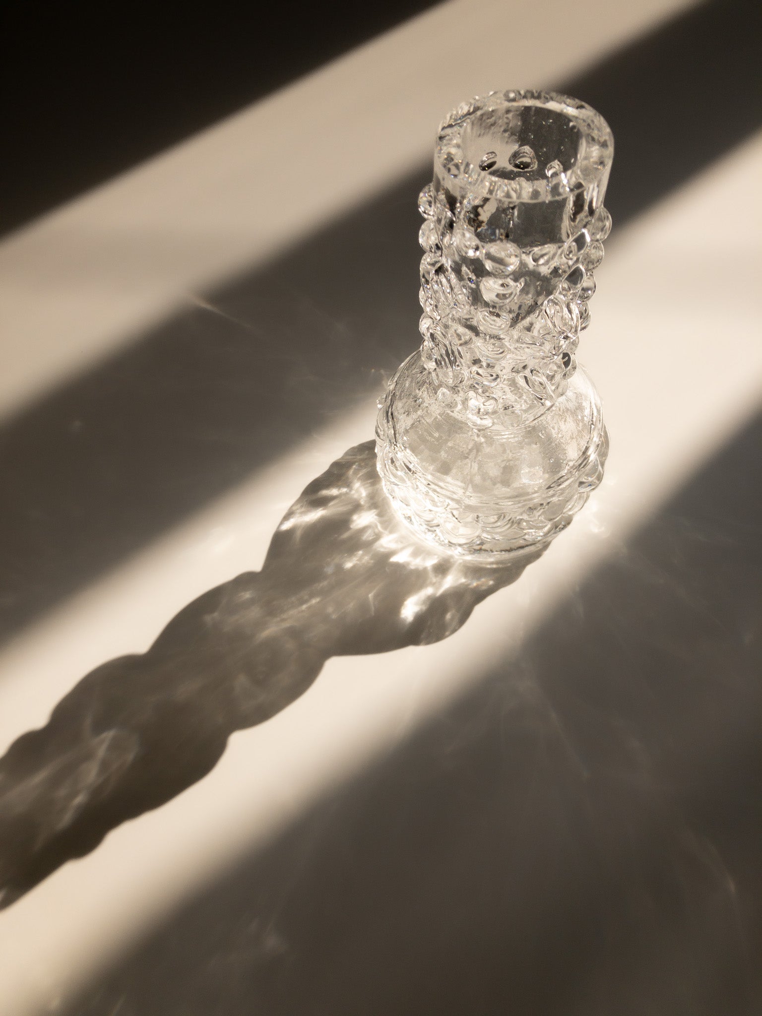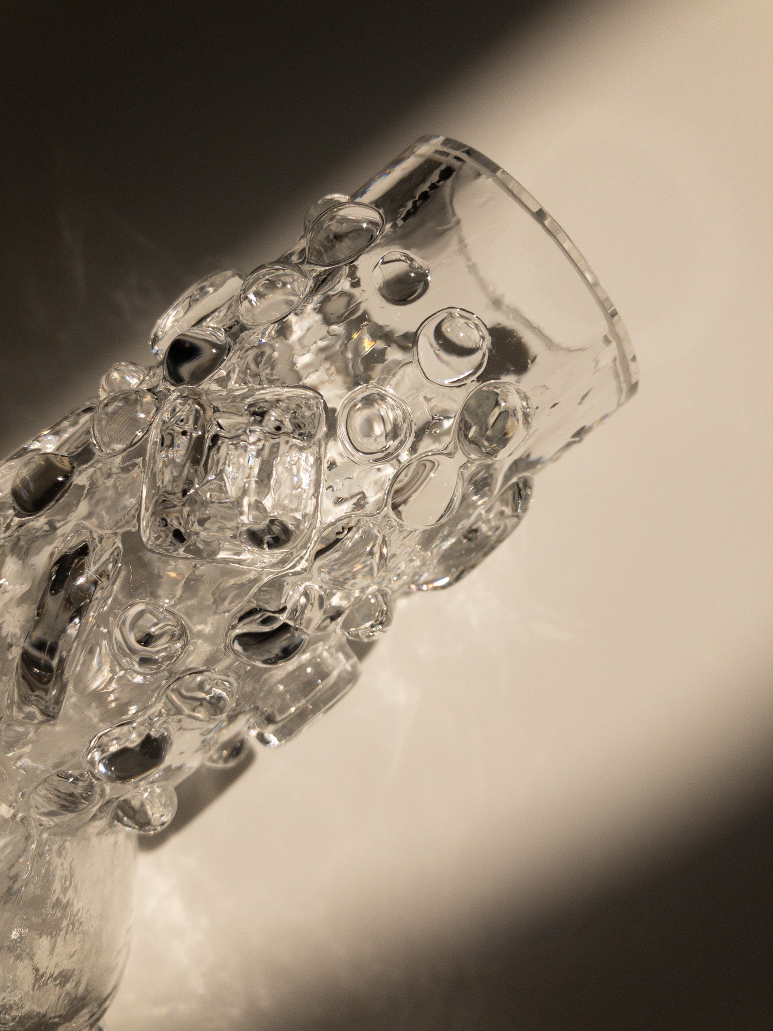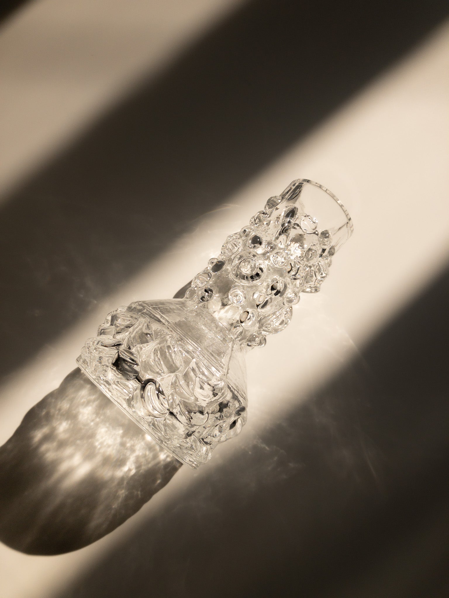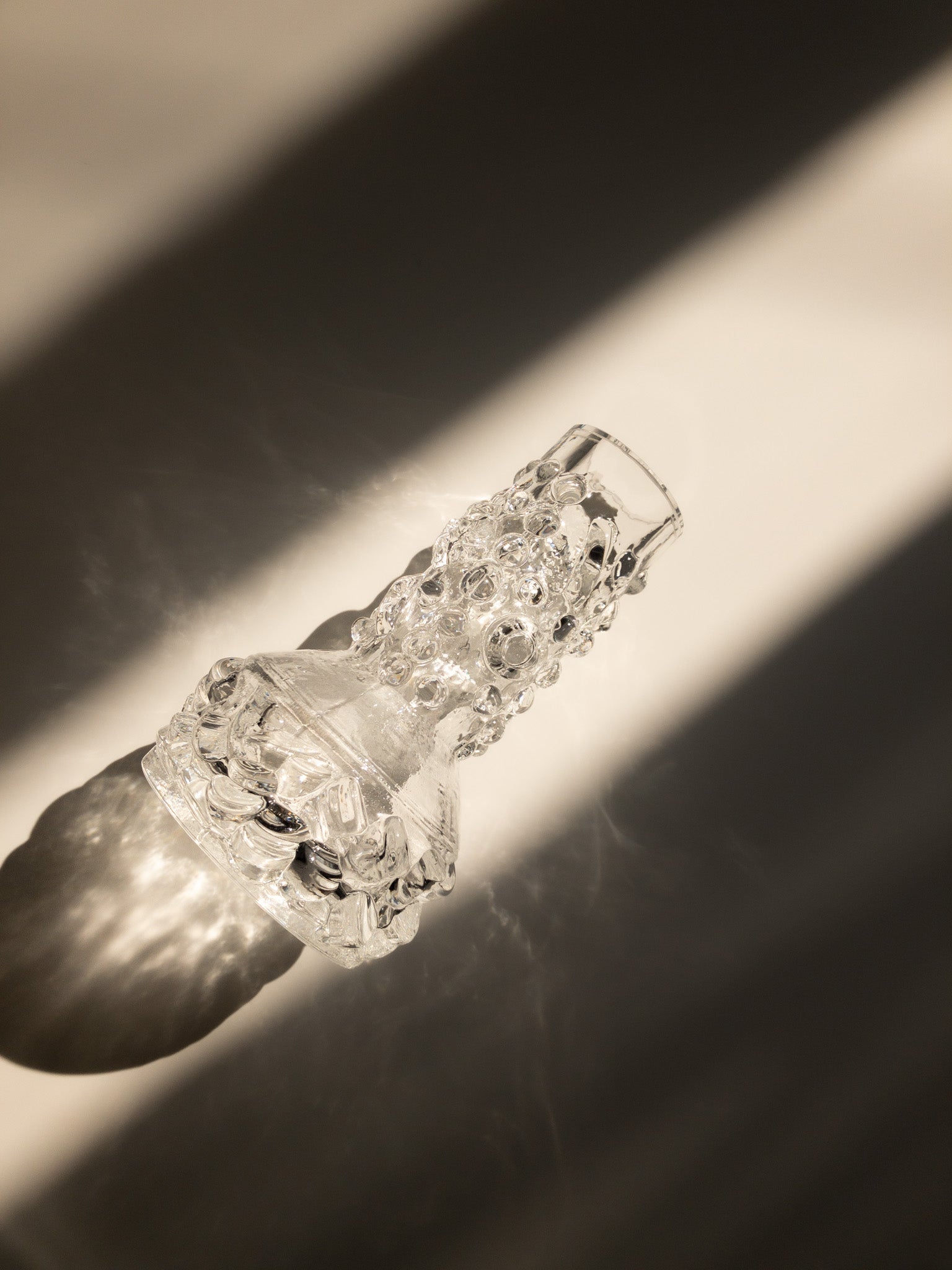 ガラスの表面にぽこぽこした泡のような凹凸があり、よく見ると丸だったり四角だったり、コインを横からぶっ刺したみたいな箇所もあったり。小ぶりな花瓶なのですが、ガラスに厚みがあってしっかりとした存在感があります。製造元は不明なのですが、ブルータリズムの要素が感じられるデザインからして、1970年チェコスロバキアのSklo Unionのプレスガラス(型押しガラス)のような…ですが確実ではありません。
