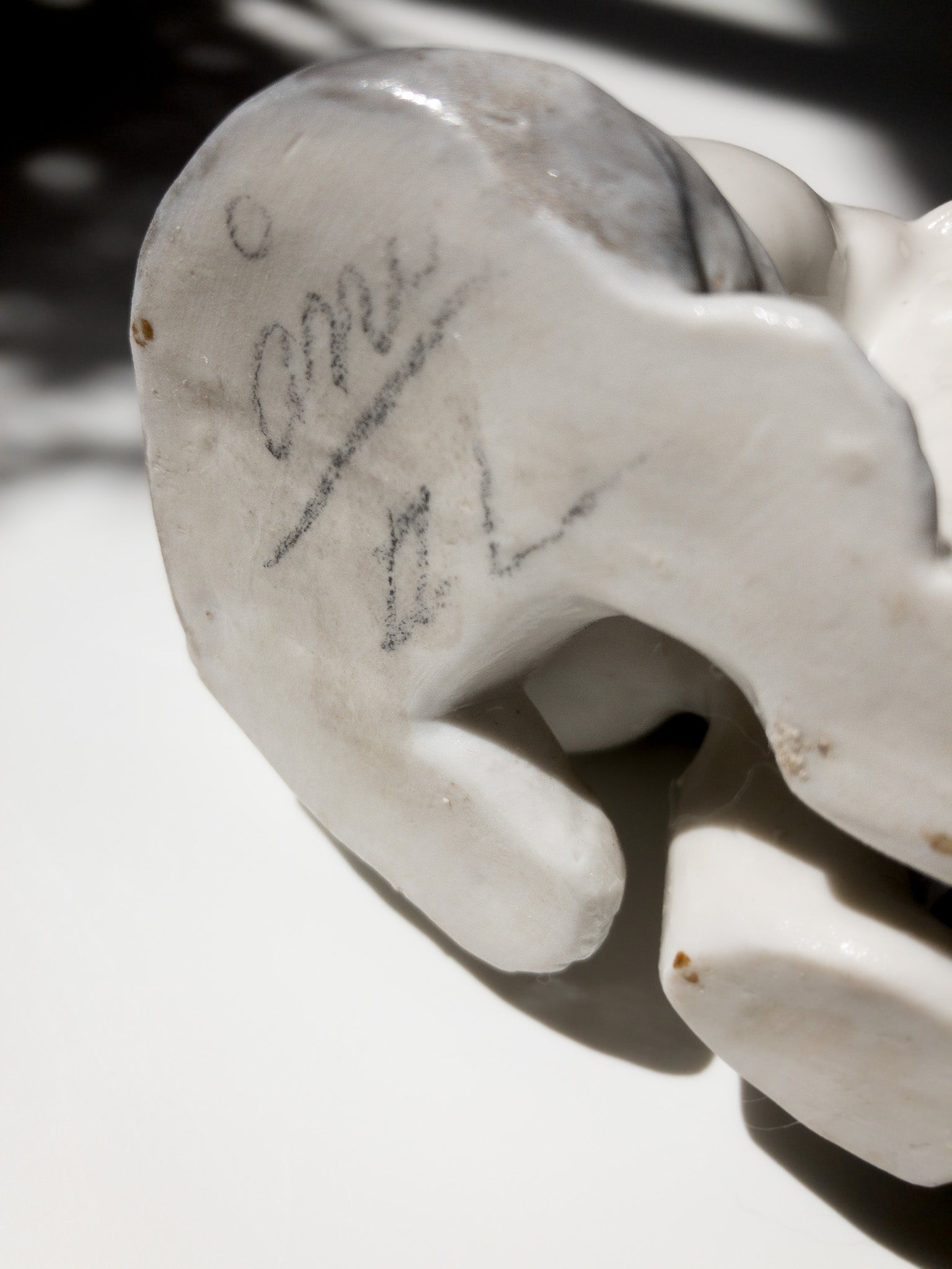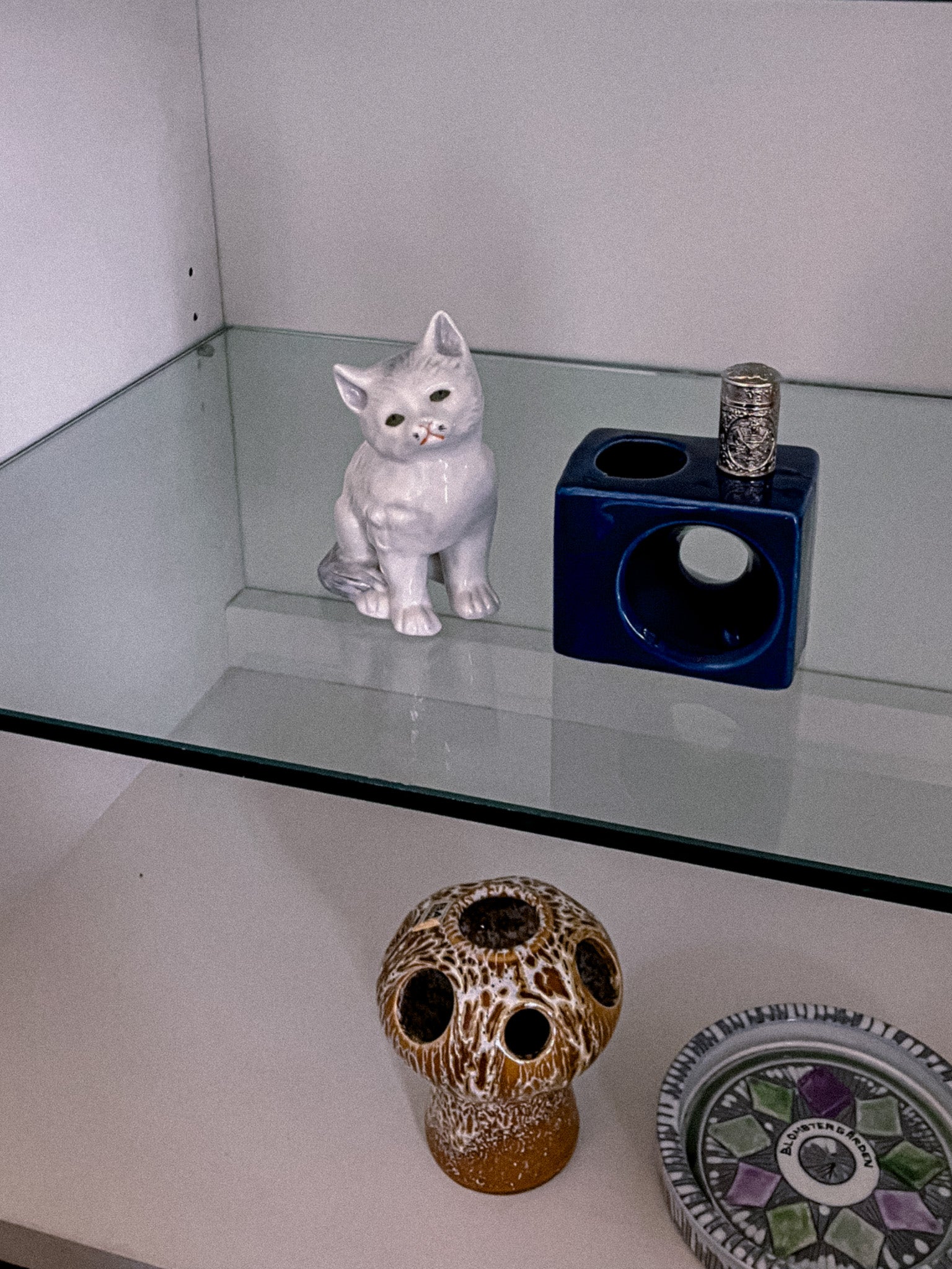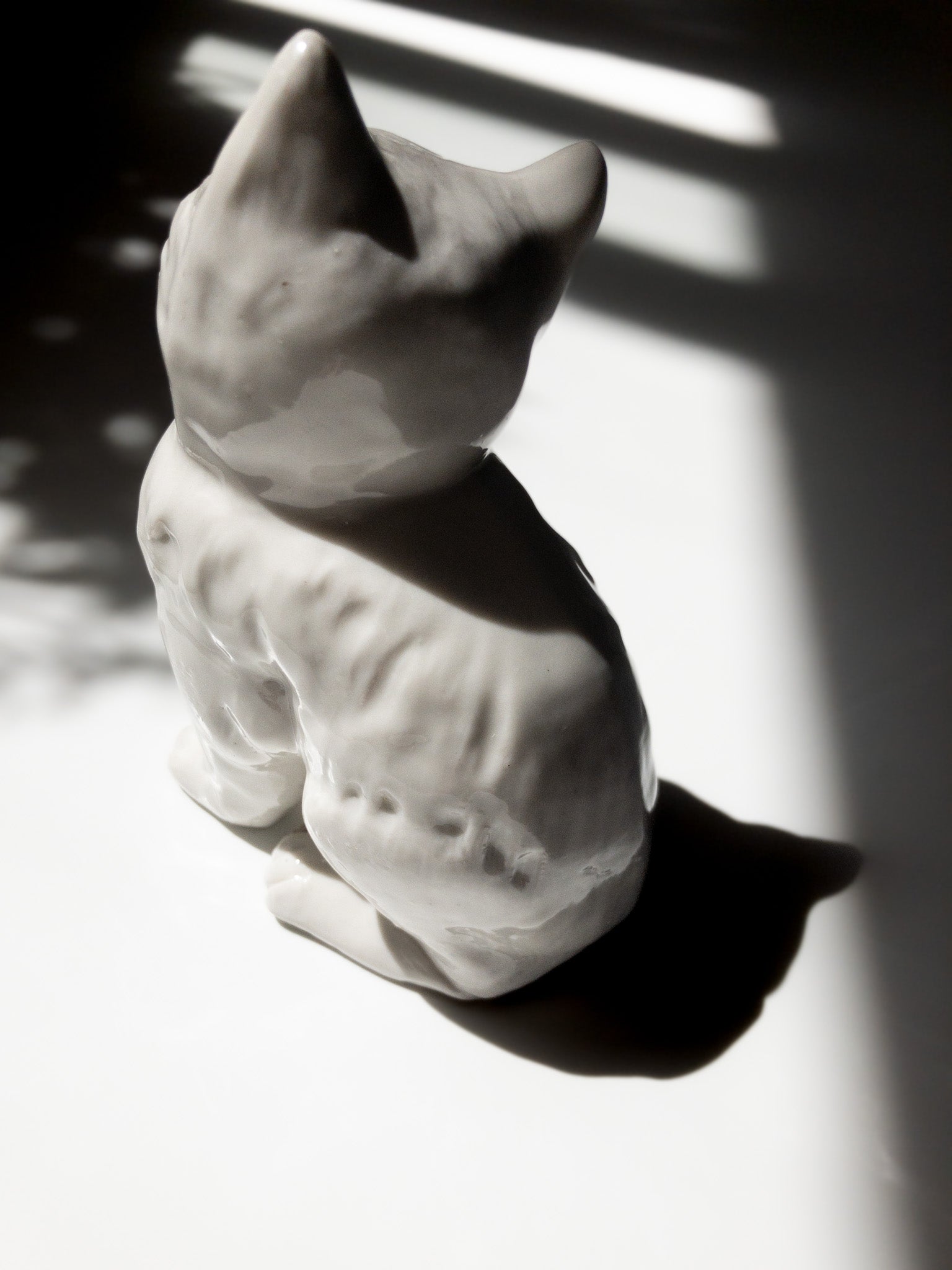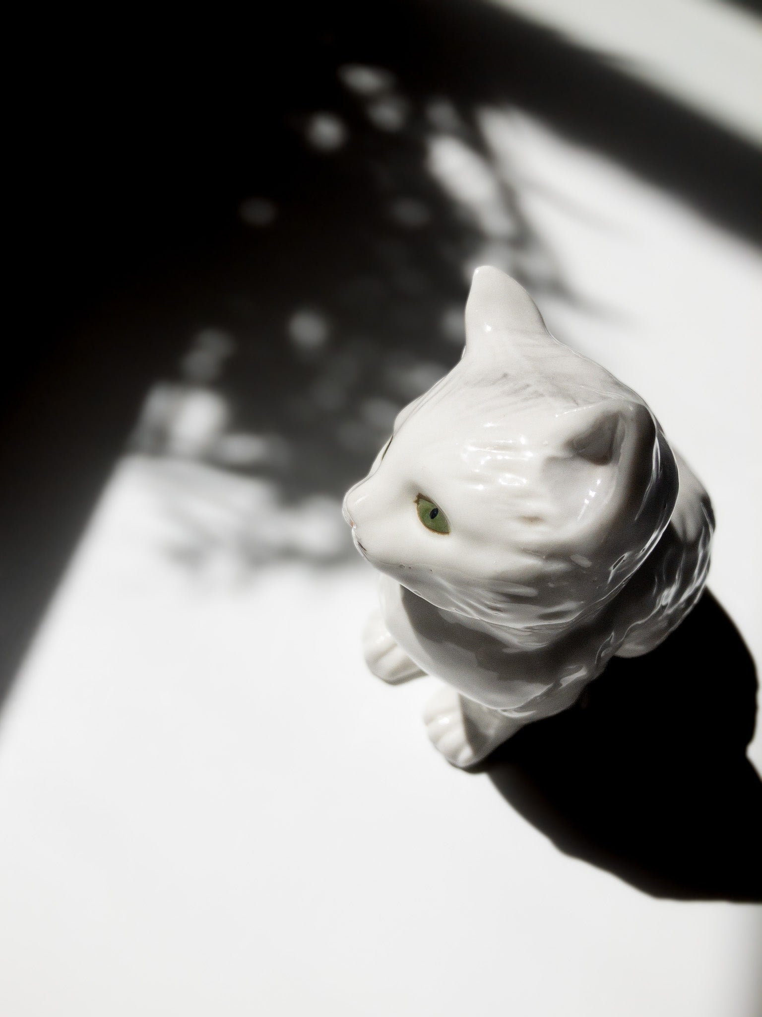 白猫。首を左に傾けて可愛らしく表現しようとしたのかと思いますが、緑の猫らしくない小さな目、極端に短い髭、猫というより歌舞伎のような口元、細部を見ても全体のバランスを見ても可愛くなくて最高です。