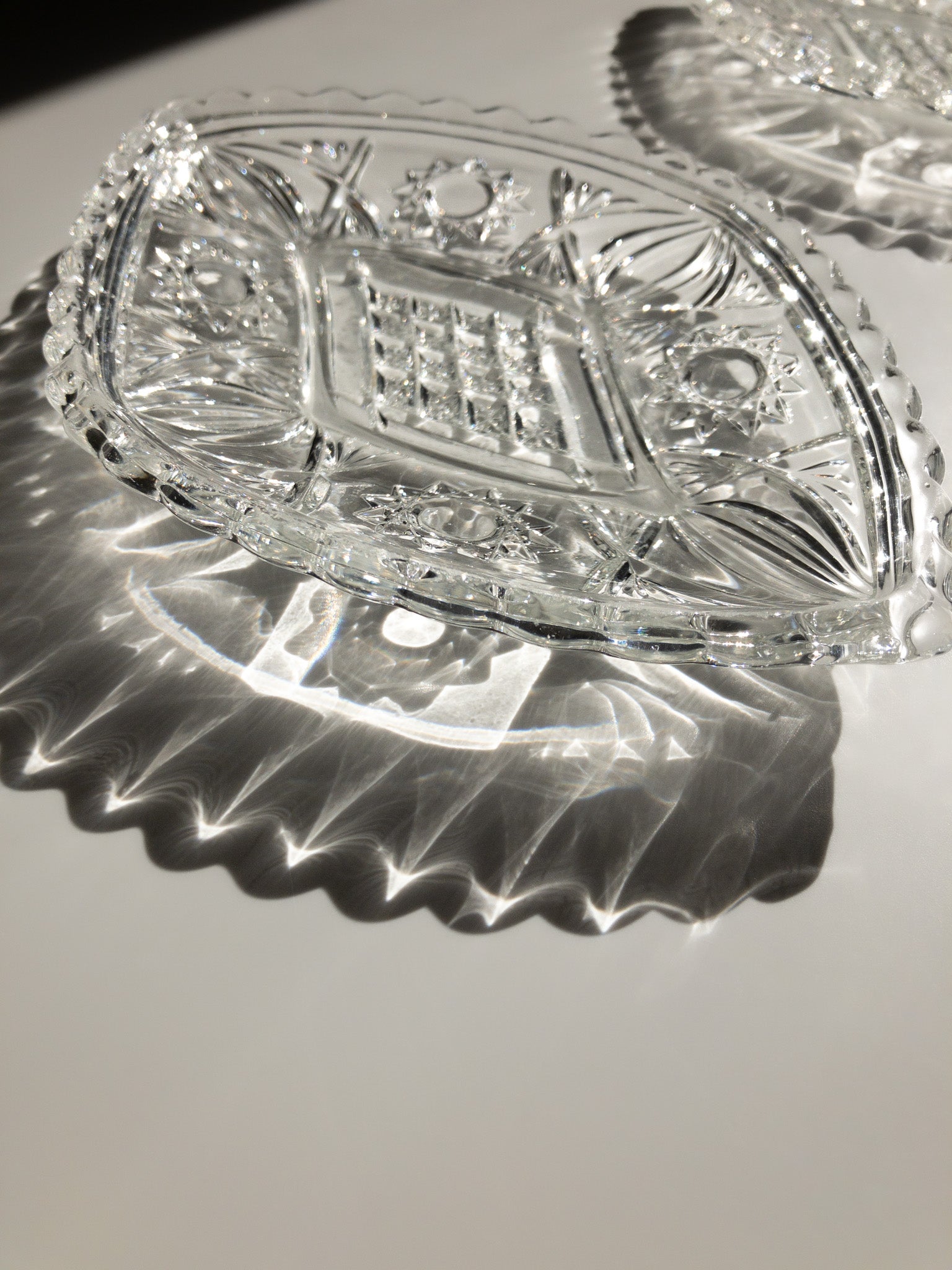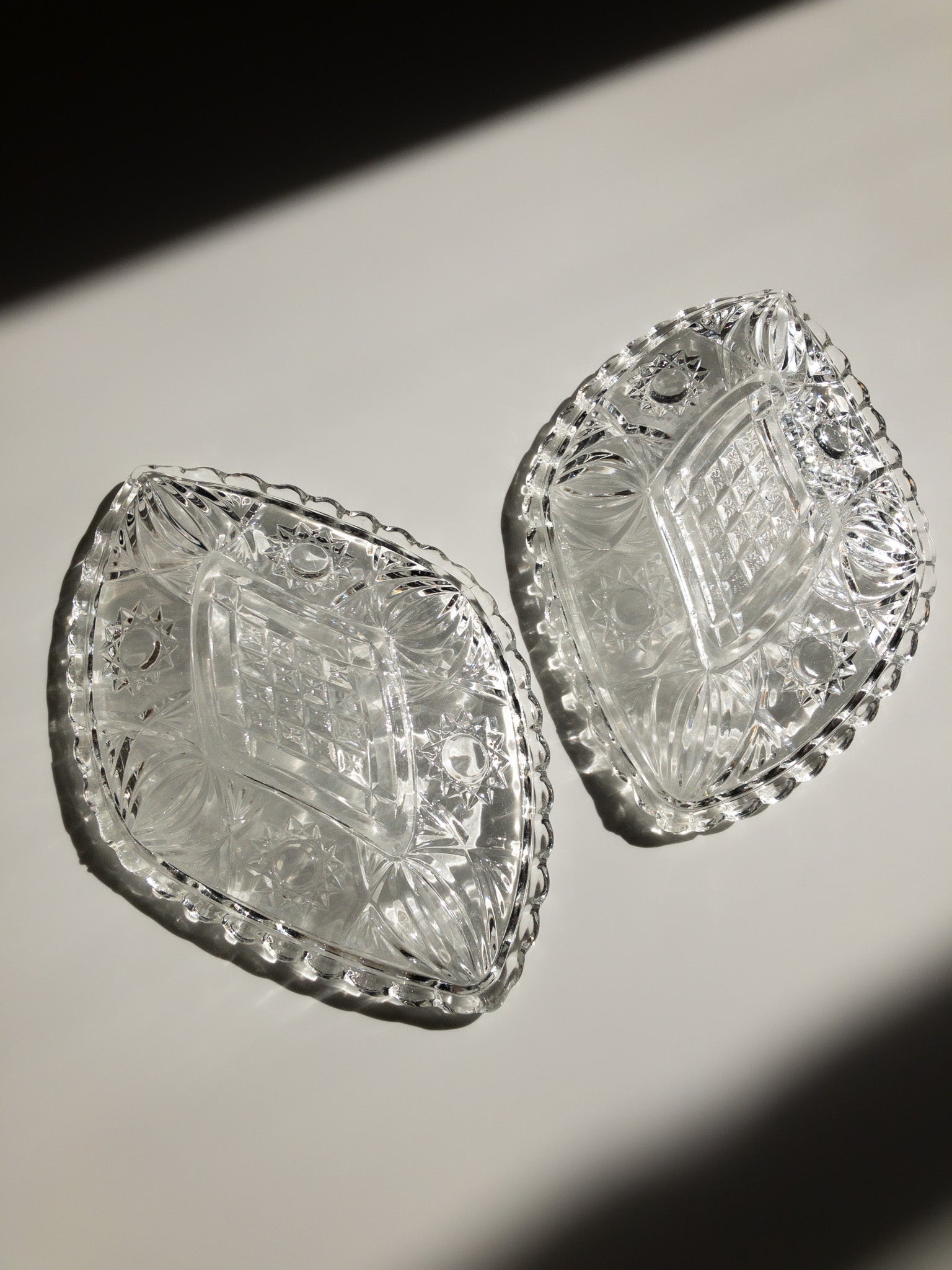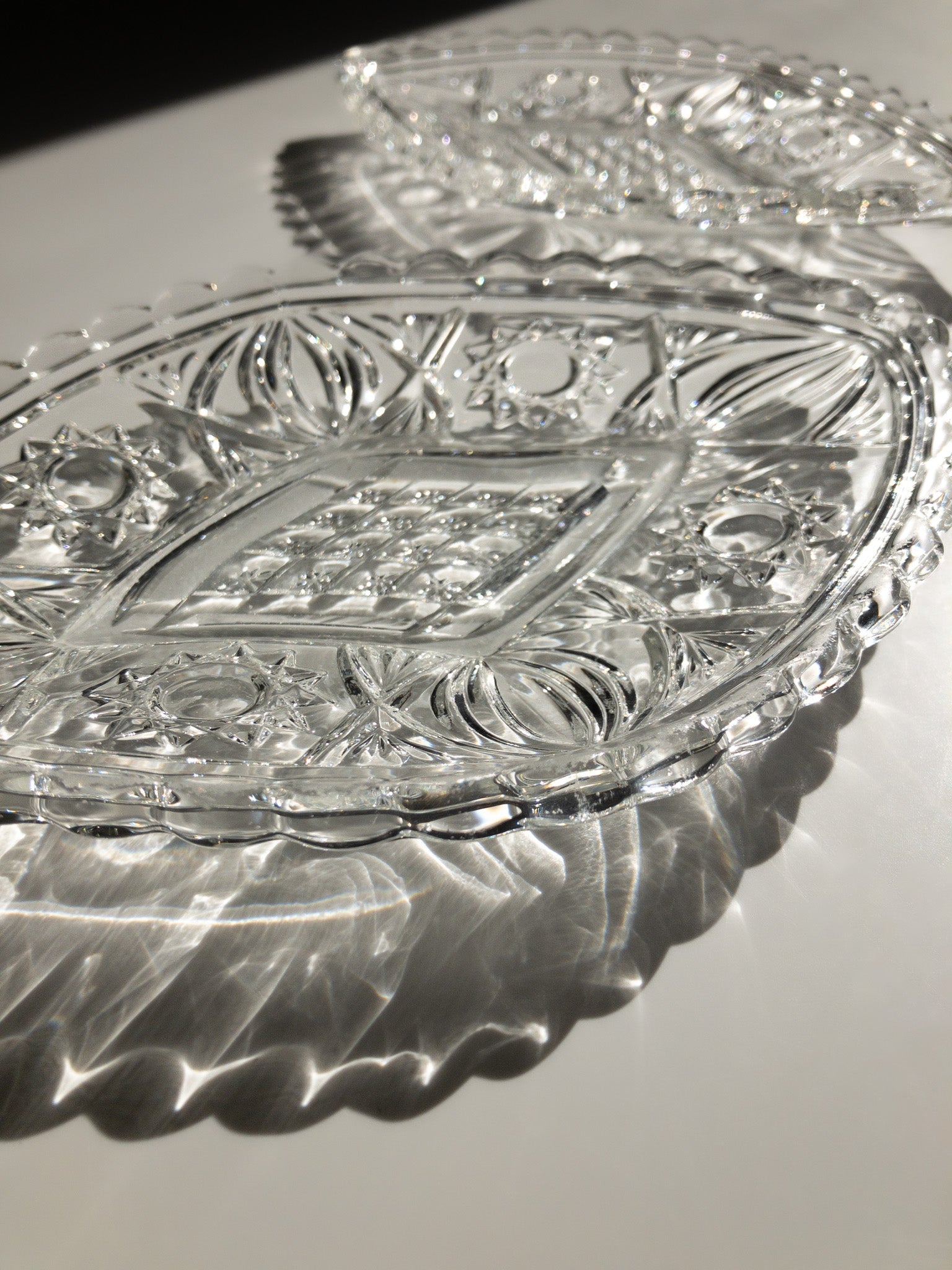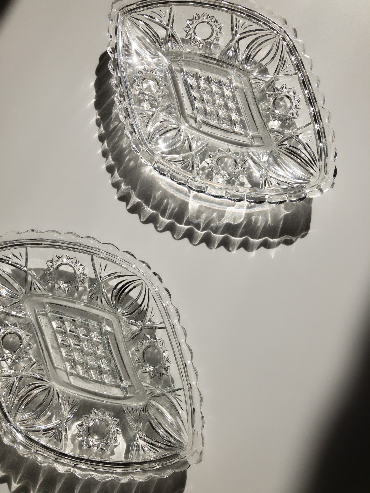 チェコスロバキア HSG Ząbkowiceより、プレスガラス(型押しガラス)のお皿2枚セット。1928年に初めてZąbkowice社のカタログに登場した製品で、16cm(1258/III)、18cm(1258/V)、31cm(1258 /V 1⁄2)のバリエーションがあり、色も緑・紫・透明があったようです。ヴィンテージというよりもうそろそろアンティークと呼べるお品物。涙や葉っぱみたいな形に刻まれた模様は派手すぎず、光が当たると現れる影が魅力的なお皿。