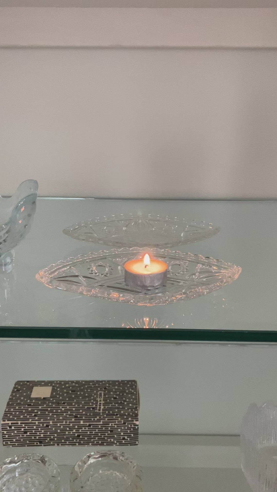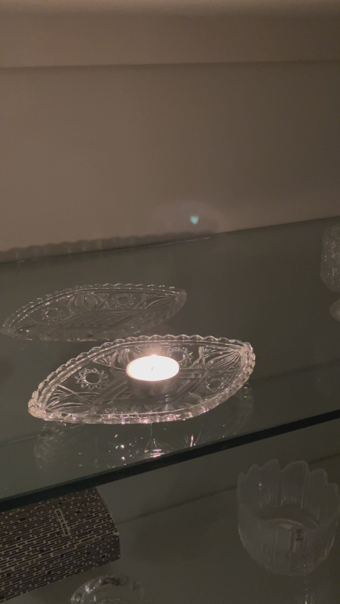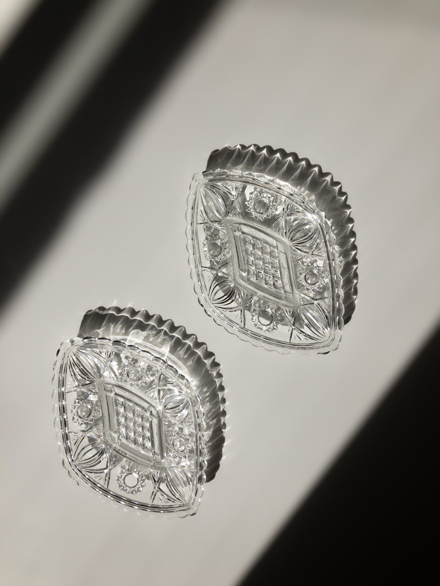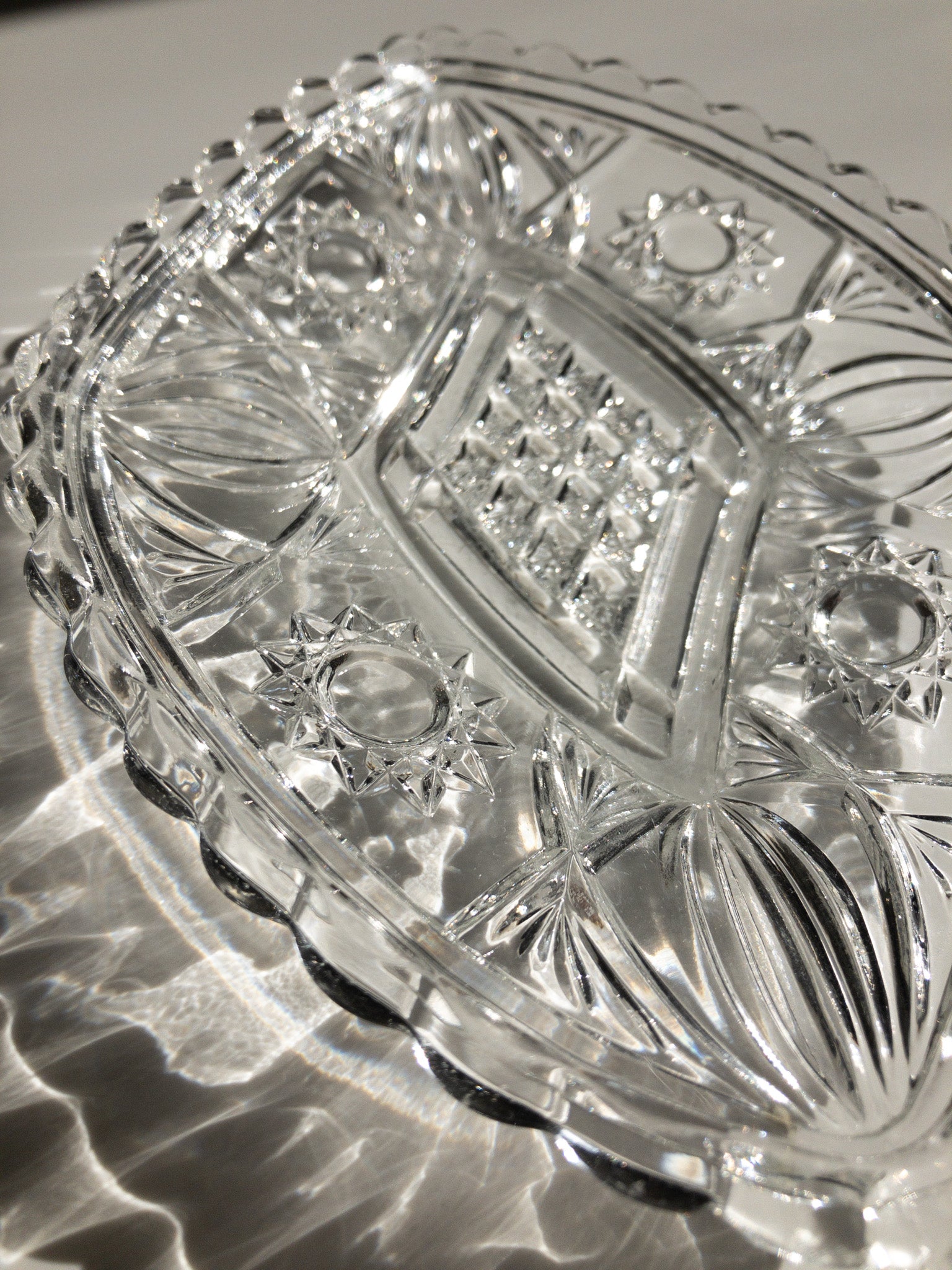 チェコスロバキア HSG Ząbkowiceより、プレスガラス(型押しガラス)のお皿2枚セット。1928年に初めてZąbkowice社のカタログに登場した製品で、16cm(1258/III)、18cm(1258/V)、31cm(1258 /V 1⁄2)のバリエーションがあり、色も緑・紫・透明があったようです。ヴィンテージというよりもうそろそろアンティークと呼べるお品物。涙や葉っぱみたいな形に刻まれた模様は派手すぎず、光が当たると現れる影が魅力的なお皿。